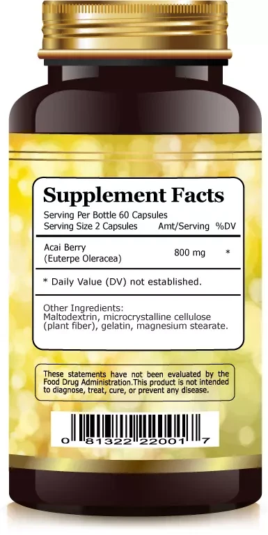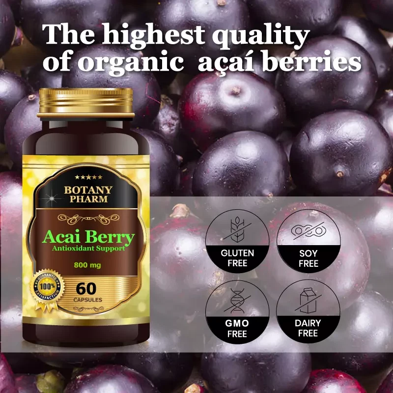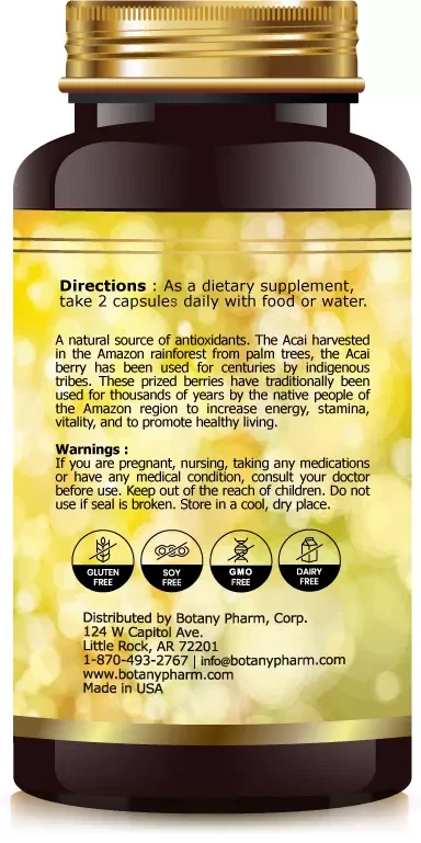 Acai Berry, Supports Immune System, Aid in Weight Loss, Improve Digestion The acai berry is now being sought after for its exceptional antioxidant power and health qualities. -Support the immune system -Aid in weight loss -Improve digestion -Reduce pain and soreness -Promote healthy sleep -Increase energy & stamina -Fight cancer & disease -Lower blood pressure -Fight aging & inflammation -Protect against heart disease Ingredients: Acai Berry Item Information: Brand: BotanyPharm Number of pills: 60 capsules MPN: 22001 Item Weight: 4 oz Volume: 4 fl oz Department: Men Diosage: 800mg Expiration Date: 10-20-2026 Country/Region of Manufacture: United States of America Shipping Policy: The shipping service is USPS First Class so the item should be delivered in 3-5 business days (Monday-Friday) and for international (outside the United States of America), the item should be delivered in 8-25 business days (Monday-Friday).