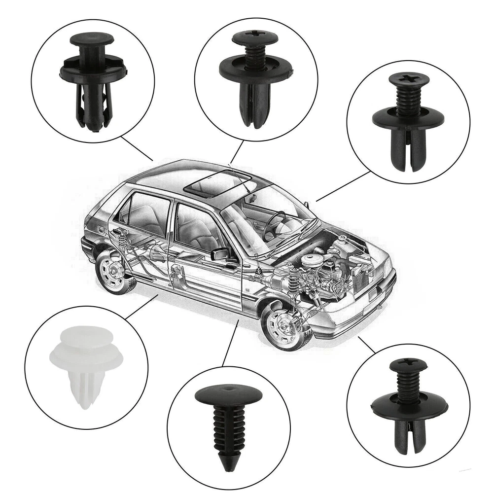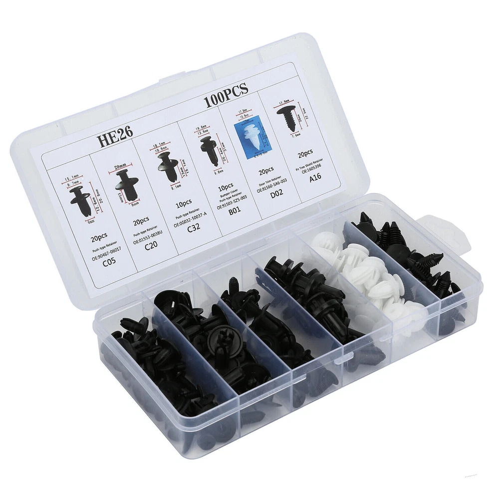 For Toyota Fixing Fastener Kit Bumper Fender Liner Push Type Retainer Clips car Description: Features: Various fasteners to meet the needs of different parts of the car. Used widely for car fender, bumper, door or other car surface. High quality plastic material, durable and long service life. Note: All vehicles have a range of different clips used on them. Different models have different sizes and there are no universal clips. Please check as much as possible before buying. Package including 100pcs Clips + 1 Plastic Box Clip of C05 Screw Type Clip Retainer Rivet Condition: Brand New Material: Black Nylon Size Approx: Head Diameter: 15mm Stem Length: 12mm Fits Into 6mm Hole For GM Replace 20426301 For Mazda Replace 9926-50-625 For Toyota Replace 90467-06017 For Toyota Replace 90467-06017-20 For Toyota Replace 90467-06017-41 For Auveco A14260 Clip of C20 Fender Liner Clip Splash Shield Blind Rivet Fits For Mazda Replace FB01-56-964 Fits For Honda Replace 90675-SB3-003 Fits For Nissan Replace 63876-95596 Fits For B16 B18 B18C B20 H22A EK9 EG6 Fits For Accord Civic Prelude CR-V Del Sol CRX Fits For INTEGRA GSR S2000 AP1 MUGEN Fits For TYPE R Si Condition: Brand New Material: Black Nylon Size Approx: Head Diameter: 20.6mm (0.81") Stem Length: 9.5mm (0.37") Fits Into 8mm (0.32") Hole For Auveco A16000 Clip of C32 Push-Type Retainer Black Nylon Head Diameter: 20mm Stem Length: 13mm Fits Into 8mm Hole Fits For Mazda 6 2002-2006 Fits For Mazda 323 1998-2003 Fits For Ford Aspire Fits For Mazda Replace B092-51-833 Fits For Ford Replace MB-455-56143 Fits For Kia Replace MB455-56-143 Fits For Nissan Replace 09409-09302 Fits For Hyundai Replace 86590-28000 For Auveco A17632 Clip of B01 Front & Rear Bumper Retainer Push Type Clip Condition: Brand New Material: Black Nylon Head Diameter: 20mm Stem Length: 18mm Fits Hole Size: 10mm For Honda Replace 91503-SZ5-003 (1996-On) For Acura Replace 91503-SZ5-003 For Auveco A20564 For PAS9282, PAS938 Clip of D02 Interior Trim Board Retainer Clip White Nylon Top Head Diameter: 13mm Middle Head Diameter: 16mm Bottom Head Diameter: 18mm Stem Length: 15mm Stem Diameter: 8.5mm x 8.5mm Overall Length: 20mm Fits For GM Replaces 94858299 Fits For Geo Prizm 1998-On Fits For Toyota Replaces 90467-10161 Fits For Sienna, Solara & Tercel 1990-On Fits For Previa 2007-On, Corolla 2003-On Fits For Lexus LS460, LS460L 1990-On For Auveco A18876 Clip of A16 Radiator Yoke, Fender & Bumper Shield Retainer Christmas Tree Type Clip Black Nylon Head Diameter: 17.8mm Stem Length: 20mm Stem Diameter: 7.6mm For GM Replaces 1595864, 1605396 For Ford Replaces 388577S For Ford Replaces W705589-S300 For Auveco A11146, A15414 We offer free returns with any orders within 30 days from the date of delivery. No restocking fees, no administrative fees, no return shipping fee, and no hassle! We will email you when a prepaid return label is ready to download from your ebay account. You just have to print it out and drop the package off at a USPS facility. When we get it back, you will be notified and credited for the full price of the items/products that are returned. Since the shipping fees go directly to the delivery service, we are not able to refund any shipping costs. For warranty returns passed the 30 days, please call or email us so we can make sure we are providing you with the best possible support.