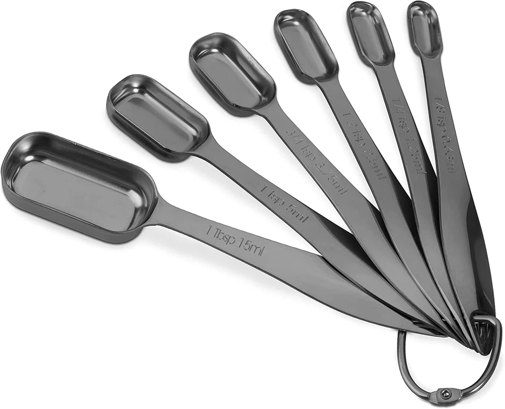 Product Description 18/8 stainless steel durable contruction. Dark grey finish. Engrave US metric Measurement. Fit easily into narrow spice jars and tins. Contains 6 spoons: 1/8 tsp, 1/4 tsp, 1/2 tsp, 3/4 tsp, 1 tsp, 1 Tbsp and conveniently connected by a O-shape ring. The products express the pursuit of high-quality life with simple and practical concept, it interprets urban high-quality life and advocates a kind of life style combining fashion and life. Starting in 2017, no matter how the world changes, we win the favour of consumers with our motto which is understanding our clients. Moving forward from combining the westerners living habits, collecting suggestion and improving products, express the meaning of simple and practical from houseware to kitchenware. 7-Pieces Set Measuring Spoons Set Includes Measurements are Stamped and Engraved on the Spoons Stackable Design to Save More Space Spoons Easily Fit Into Spice Jars