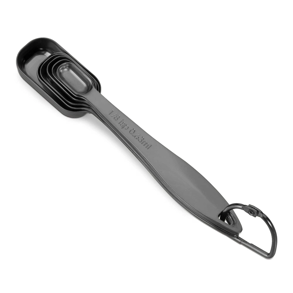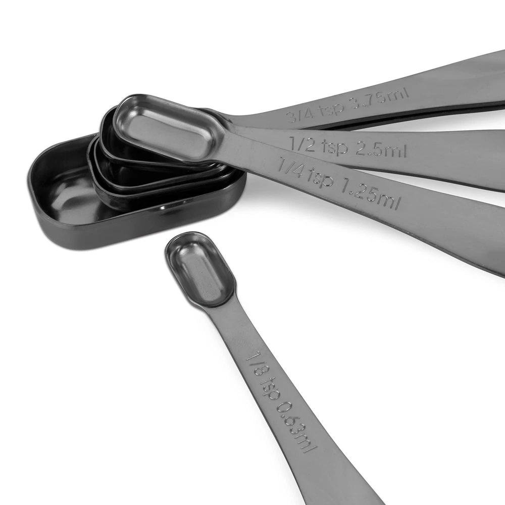 18/8 stainless steel durable contruction. Dark grey finish. Engrave US metric Measurement. Fit easily into narrow spice jars and tins. Contains 6 spoons: 1/8 tsp, 1/4 tsp, 1/2 tsp, 3/4 tsp, 1 tsp, 1 Tbsp and conveniently connected by a O-shape ring.