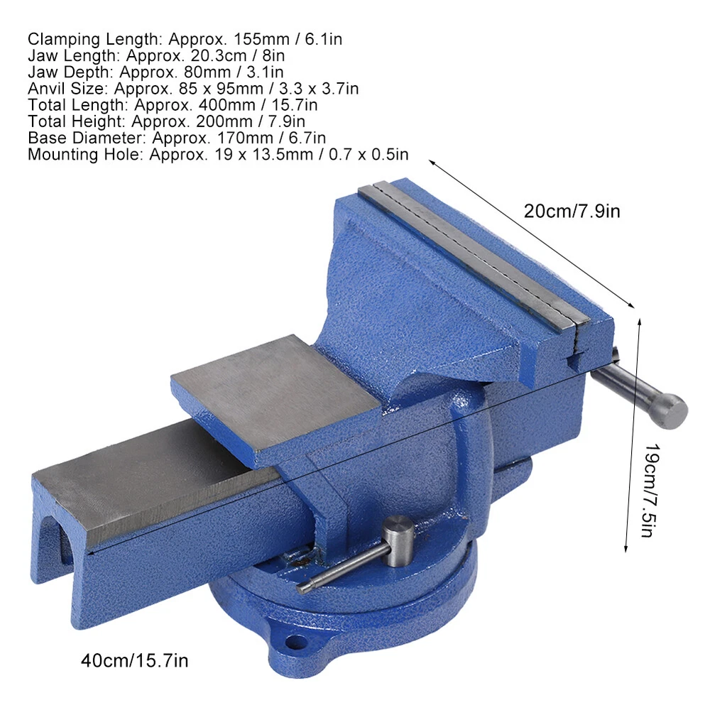 Feature: 1. The pure steel wire rod does not rust, and the thread is deep, providing a strong clamping force. 2. Jaw high‑hardness steel plate, cross‑slip grooves designed, clamping does not slip. 3. The clamp body is cast in solid as a whole, with strong anti‑knocking ability. 4. Used for installation on the workbench, used to clamp the workpiece, for fitter and other assembly, repair processing, etc. 5. Strict quality control and quality assurance, high safety factor, can be used with peace of mind. Specification: Item Type: Bench Vise Clamping Length: Approx. 155mm / 6.1in Jaw Length: Approx. 20.3cm / 8in Jaw Depth: Approx. 80mm / 3.1in Anvil Size: Approx. 85 x 95mm / 3.3 x 3.7in Total Length: Approx. 400mm / 15.7in Total Height: Approx. 200mm / 7.9in Base Diameter: Approx. 170mm / 6.7in Mounting Hole: Approx. 19 x 13.5mm / 0.7 x 0.5in Size: Approx. 40 x 19 x 20cm / 15.7 x 7.5 x 7.9in Package List: 1 x Bench Vise 1. Our listing price includes the value of goods,packaging cost,and export taxes,not including international duties. 2. duties,taxes,and charges are not included in the item price or shipping fee. 3. T he duties are buyers' responsibility .Please check with your country's customs office determine what these additional costs will be prior to your purchase. 4. All disputes arising from the duties will be submitted to ebay for solution. 1. Any questions, pls. contact us via ebay message or email us. We will reply your message within 48 hours. If you do not receive our reply within 48 hours, pls. post a message again beuse sometimes our message system may block some emails. 2. If you are satisfied with our service, pls. kindly leave us a positive feedback and give us the Detailed Seller Rating with all " 5 " in very area 3. Our aim is to provide Level Customer Service, your recognition will encourage us greatly and serve you better. We strive to keep all our customers satisfy. We will do our up most to exceed your expectations in customer service, communition and dispatching of your orders. On Nov 3, 2024 at 21:59:36 PST, seller added the following information: