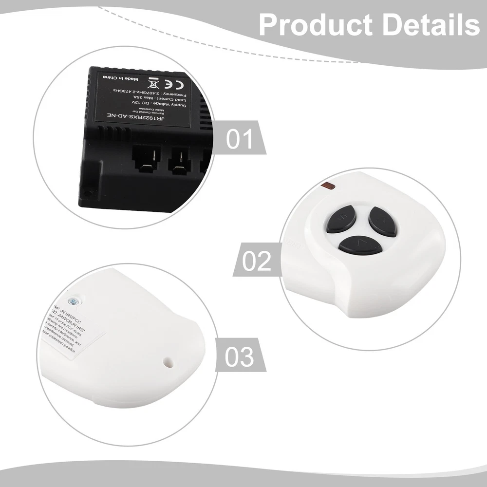 Accurate Control Stable Performance Remote Control Receiver for Toy Cars DESCRIPTION Features: * Stable performance and high reliability. * How to tell if the control box is suitable for your car? * Open the damaged electric passenger car and check the control box. * If the control box looks the same, the part should your car. * The instructions for the remote control are clearly printed on the box. * Frequency matching is required when using it for the first time(or changing the battery); Step 1. Install two AAA 1.5V batteries,(pay attention to the positive and negative polarity in the battery compartment), and finally close the battery cover. The indicator light will flash three times, indicating that the battery is installed correctly. Step 2. Long press the frequency key(select car) for about 2 seconds, and the indicator light flashes Step 3. Turn on the car power, and the indicator light goes out Step 4. If the frequency matching is unsuccessful(the indicator light does not go out), turn off the power and repeat steps 2 and 3. Specifications: Part name: Children's electric car remote control receiver Model: JR1922RXS-AD-NE Voltage: 12V Material: ABS+metal Size: Standard Color: Black, White Package Contents: 1 x Receiver 1 x Remote Control Note: 1.The real color of the item may be slightly different from the pictures shown on website caused by many factors such as brightness of your monitor and light brightness. 2.Please allow slight manual measurement deviation for the data. POLICES Shipping Payment WARRANTY We only ship to confirmed ebay Order addresses. Please comfirm that your Order address is in line with your shipping address. Please kindly note that the c ombined shipping is not provided because the shipping fee is calculated by weight. Also, the each additional item means exactly the the same color and size. It takes about 7 -15 working days to US; about 10-30 working days to other countries. Transit time may be a little delayed because of the bad weather and customs inspection . If you do not receive your item within 30 working days since payment finished, please contact us immediately for further assistance. Payment must be completed within 5 days. If you have any problems about payment, please contact us via ebay message. We strive for 100% customer satisfaction! Positive Feedback is very important to us. If you have any questions, p lease feel free to contact us via "Ask seller a question" . We will reply your email within 24 working hours. On Nov 14, 2024 at 06:47:56 PST, seller added the following information: