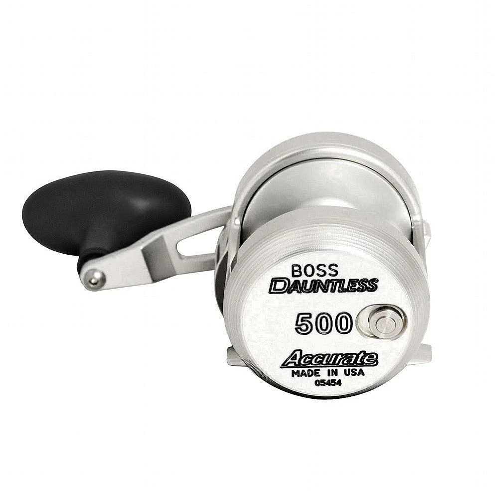Accurate Dauntless Silver - DX2-400 Right The Dauntless, Accurate’s Flagship reel is the pinnacle of the Small Reel, Big Fish movement. Lightweight, strong, and full of torque, this reel has the Accurate-exclusive stainless steel ARB bearing coupled with backup twin synced dogs for the ultimate stopping power. Not only is the Dauntless extremely powerful, but offers the smooth, even, a consistent drag of Accurate’s patented TwinDrag®. It has been the reel of choice for top anglers pushing the envelope targeting larger gamefish on smaller conventional reels. The Dauntless was designed for the angler looking to pull out all stops as they take on the largest and strongest gamefish of the world. Features Patented TwinDrag™ System Six Class 5 ABEC stainless steel bearings Greased AccuDrag system Stainless steel gears Stainless steel ARB bearing Two Stainless Steel Anti Reverse Dogs for Ultimate Stopping Power 2 year AccuCare Reel Service Sleeved spool for increased castability Heat treated pinion gears Larger, stronger gear shaft for increased torque Patented DirecShift mechanism Proudly designed, manufactured and assembled in America