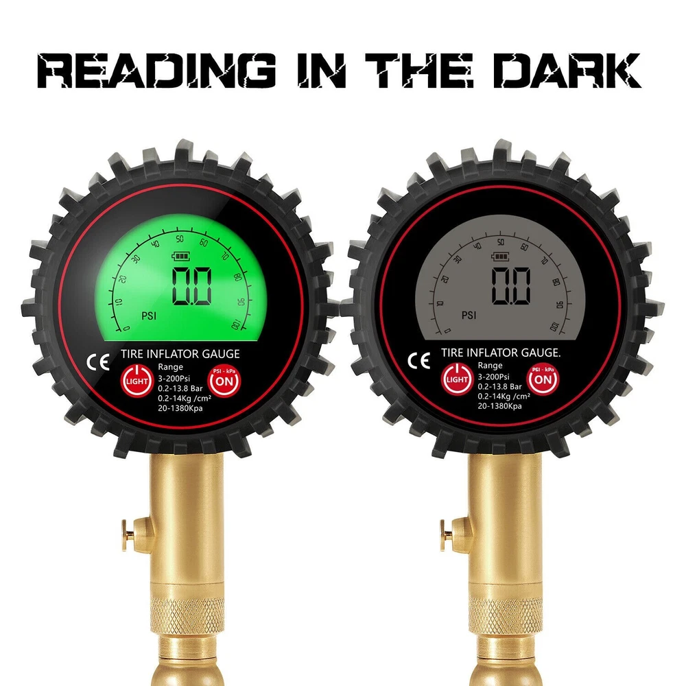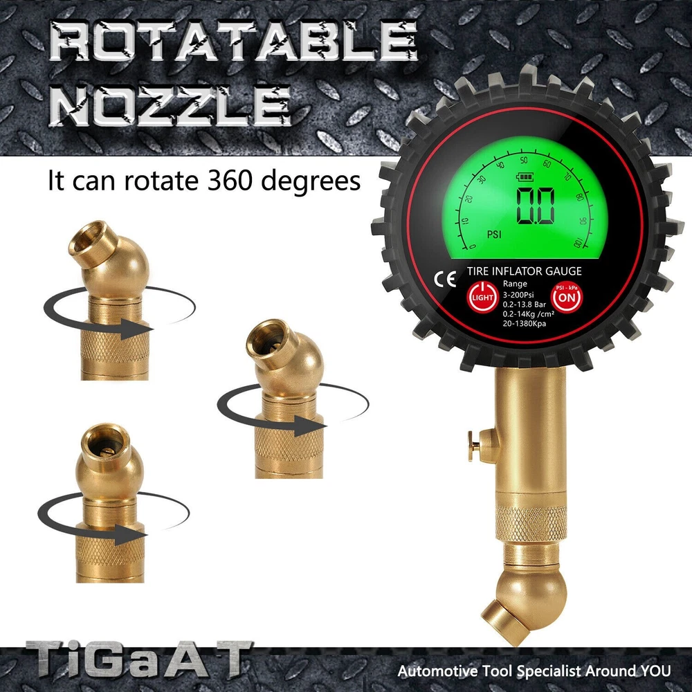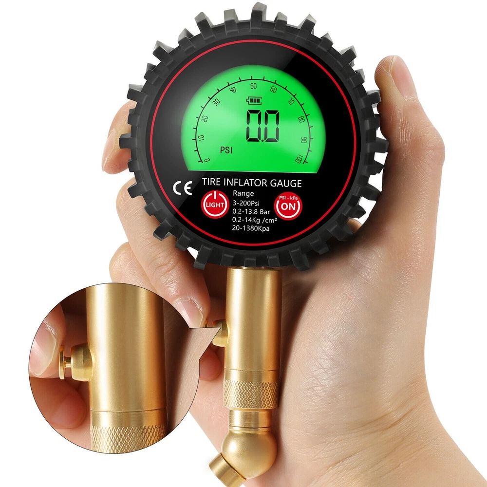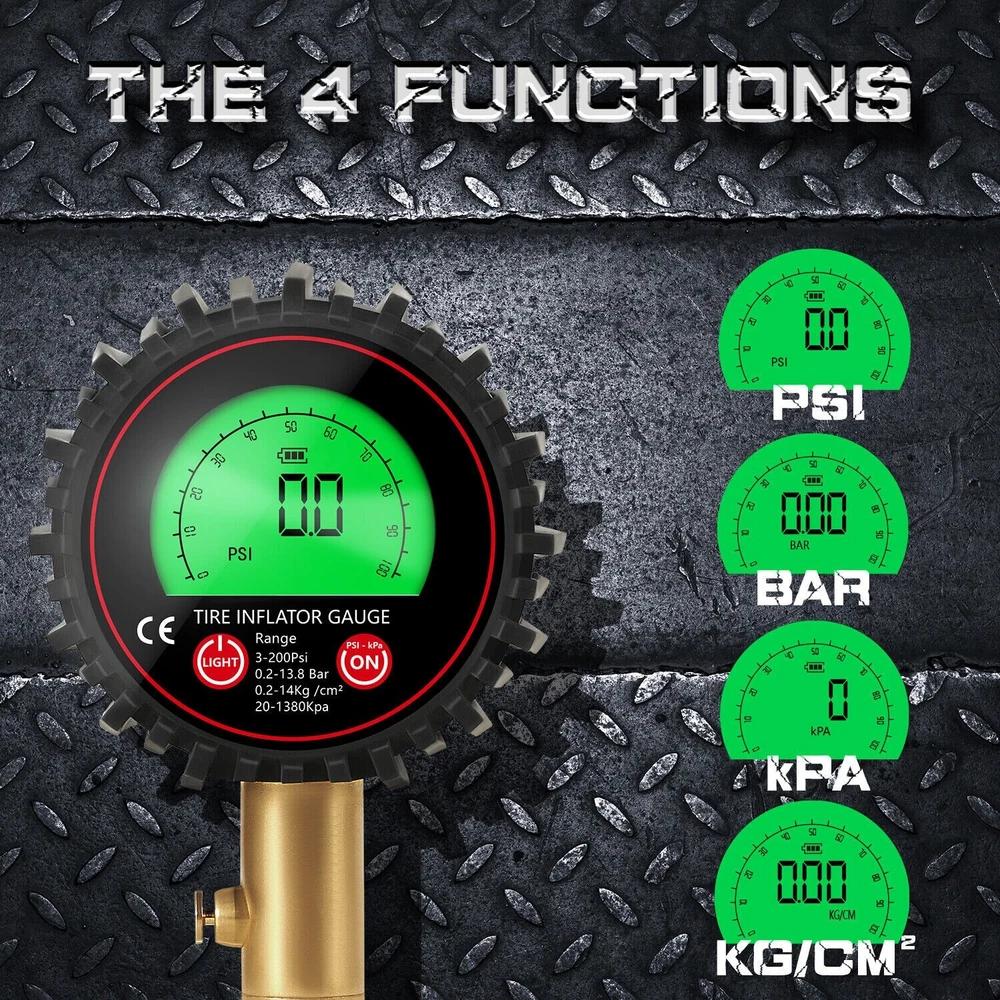 Features: ACCURACY ASSURED: Certified, & calibrated accurately within ANSI Standards (±1%), so you get a precise, accurate pressure reading every time you use it. Measures a range from 3-200 PSI (0.2~13.8 Bar,0.2~14Kg /cm²,20~1380kpa). Max. 250PSI EASY TO READ: Automatic is more convenient and convenient than mechanical use. Our tire gauge features a LCD display screen and e asy-to-read green or blue backlight for perfect visibility in the dark and features auto shut-off function. STURDY AND DURABLE: the tire pressure gauge is made of heavy-duty steel and brass, Having a protective rubber shield, the car tire pressure gauge is built to last. The brass head swivels with an extended 5mm chuck tip so it's easy to connect no matter what position the valve stem is in, so you get a great seal with no air leakage. EASY TO USE: The digital tire pressure gauge equipped with a built-in air bleeder valve to reduce pressure in overinflated tires, and 360-degree rotation chuck allows for easy access to the tire valve from any angle. IMPROVE SAFETY: Properly inflated tires provide better safe performance even in bad weather conditions are far less prone to blowouts, explosions, and crashes, Normal tire pressure can make your tires last longer, and make your car drive better. Technical Data: Model No. 86007 Function Pressuge Gauge, Air Deflate Measuring Range 3-200Psi (0.2-13.8Bar, 0.2-14kg/cm², 20-1380kpa) Measurement Units PSI, KAP, Bar, Kg/cm² Accuracy ±1% (relative humidity, Temperatrure 25℃) Display Green or Blue Backlit LCD delivery Randomly(Auto LCD power off) Battery 2 x AAA 1.5V Battery (not included) Package include: 1 set x Tire gauge (Battery not inclueded) 1 x user manual Return Policy: When you get the package, please kindly check everything firstly(quantities,color and texture), If you dont't like them or any not satidfied, Please kindly contact us firstly and ensure goods in i ts original state