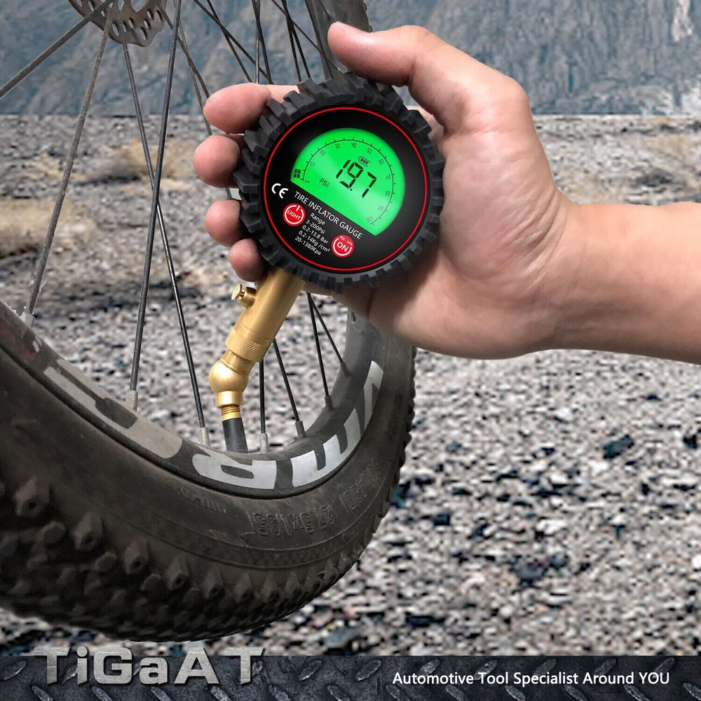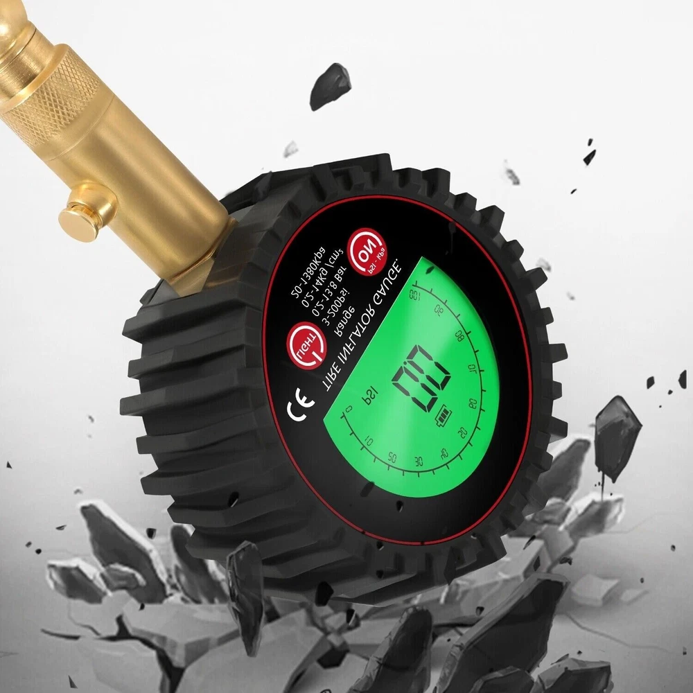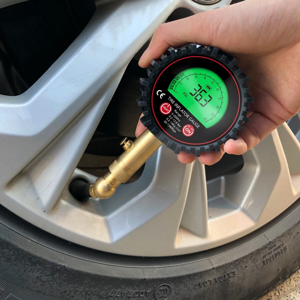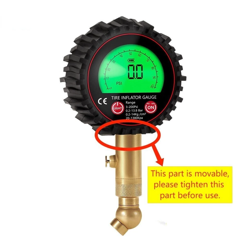 Features: ACCURACY ASSURED: Certified, & calibrated accurately within ANSI Standards (±1%), so you get a precise, accurate pressure reading every time you use it. Measures a range from 3-200 PSI (0.2~13.8 Bar,0.2~14Kg /cm²,20~1380kpa). Max. 250PSI EASY TO READ: Automatic is more convenient and convenient than mechanical use. Our tire gauge features a LCD display screen and e asy-to-read green or blue backlight for perfect visibility in the dark and features auto shut-off function. STURDY AND DURABLE: the tire pressure gauge is made of heavy-duty steel and brass, Having a protective rubber shield, the car tire pressure gauge is built to last. The brass head swivels with an extended 5mm chuck tip so it's easy to connect no matter what position the valve stem is in, so you get a great seal with no air leakage. EASY TO USE: The digital tire pressure gauge equipped with a built-in air bleeder valve to reduce pressure in overinflated tires, and 360-degree rotation chuck allows for easy access to the tire valve from any angle. IMPROVE SAFETY: Properly inflated tires provide better safe performance even in bad weather conditions are far less prone to blowouts, explosions, and crashes, Normal tire pressure can make your tires last longer, and make your car drive better. Technical Data: Model No. 86007 Function Pressuge Gauge, Air Deflate Measuring Range 3-200Psi (0.2-13.8Bar, 0.2-14kg/cm², 20-1380kpa) Measurement Units PSI, KAP, Bar, Kg/cm² Accuracy ±1% (relative humidity, Temperatrure 25℃) Display Green or Blue Backlit LCD delivery Randomly(Auto LCD power off) Battery 2 x AAA 1.5V Battery (not included) Package include: 1 set x Tire gauge (Battery not inclueded) 1 x user manual Return Policy: When you get the package, please kindly check everything firstly(quantities,color and texture), If you dont't like them or any not satidfied, Please kindly contact us firstly and ensure goods in i ts original state