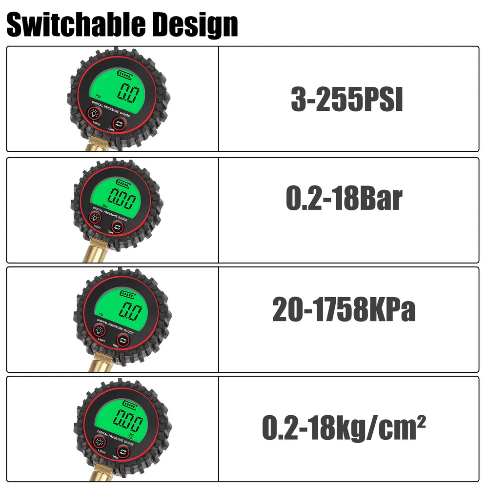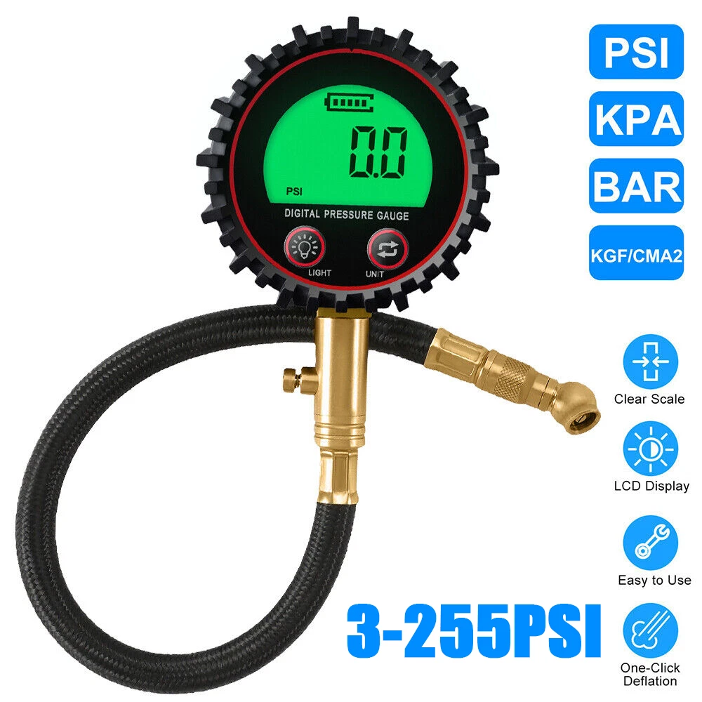 Accurate Digital Air Pressure Tire Gauge LCD Screen 3-255 PSI for Truck Car Bike Item Description Product Feature: PRECISION: Our digital tire pressure gauge is meticulously calibrated to provide tire pressure readings within a (±1%) margin of error. It measures a range from 3-255 PSI. VERSATILE DESIGN: The tire pressure gauge offers a switchable design, allowing you to effortlessly toggle between four different units of measurement: PSI, KPA, Bar, and Kg/cm². CLEAR READINGS: Featuring an LCD display screen with a user-friendly green backlight, our tire gauge guarantees optimal visibility even in low-light conditions. Furthermore, it incorporates an auto shut-off feature. DURABLE & DEPENDABLE: Crafted from heavy-duty steel and brass, our tire pressure gauge guarantees long-lasting reliability. The brass head swivels with an extended 6mm chuck tip, making it easy to connect regardless of the valve stem's position. BRAIDED AIR HOSE: To ensure enhanced longevity and protection against aging and corrosion, our tire pressure gauge features a braided outer layer on the rubber hose. EASY TO USE: The digital tire pressure gauge is furnished with a built-in air bleeder valve, enabling pressure reduction in overinflated tires. The 360-degree rotating chuck ensures effortless access to the tire valve from any angle. Power is sourced from 2 AAA batteries (batteries not included). WIDE APPLICATION: Widely applicable for automobiles, trucks, SUVs, motorcycles, bicycles, trailers, and RVs, our tire pressure gauge delivers exceptional performance across all weather conditions. Product Specification: Type Tire Pressure Gauge Material Rubber+Brass+Steel Measurement Units PSI, KPa, Bar, Kg/cm² Measurement Range 3-255PSI, 0.2-18Bar, 20-1758KPa, 0.2-18kg/cm² Accuracy ±1% Working Temperature -20-60℃ Battery 2 x AAA 1.5V Battery (not included) Package Included: 1 x Tire Pressure Gauge Detail Images Shipment All item will be carefully packaged very well with safe material and shipped to US States. Items will be sent in 2 working days,usually shipped by USPS Priority Mail. It will take about 3-5 days to US addresses. If you would like to ship by other shipment methods,please contact us.( shipping cost will be combined for multiple items you purchase at a time.) Payment Only PayPal is acceptable.It is a safe and easy payment method for buyers. Please pay in 48 hours after you win the item(s).If payment cannot be made in five days,your order(s) will be claimed as unpaid case and the item will be relisted. Return & Refund Customer satisfaction is our first priority. 30-days return is available after delivery. However, return shipping and insurance cost will be on buyers. Please email us before returning. Delivery date will be different according to UPS or USPS tracking system, so please inspect your item immediately upon arrival. Money will be return to you after the return item is sent back. We can not refund to you, if your return item is broken or damaged. Please ensure its safety. Feedback Your feedback is very important to us. If you can't leave us a "5-Star" rating and a positive feedback, please contact us without hesitation before leaving feedback. We are eager to work with our customers. We believe in communication. Give us a call or send us an email, we will make things right for our buyers. Positive feedback for our buyers will be left automatically by eBay Seller Manager Pro.