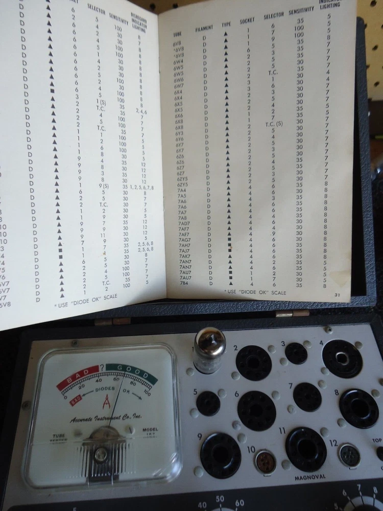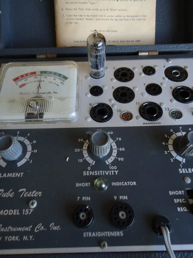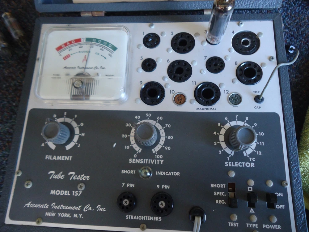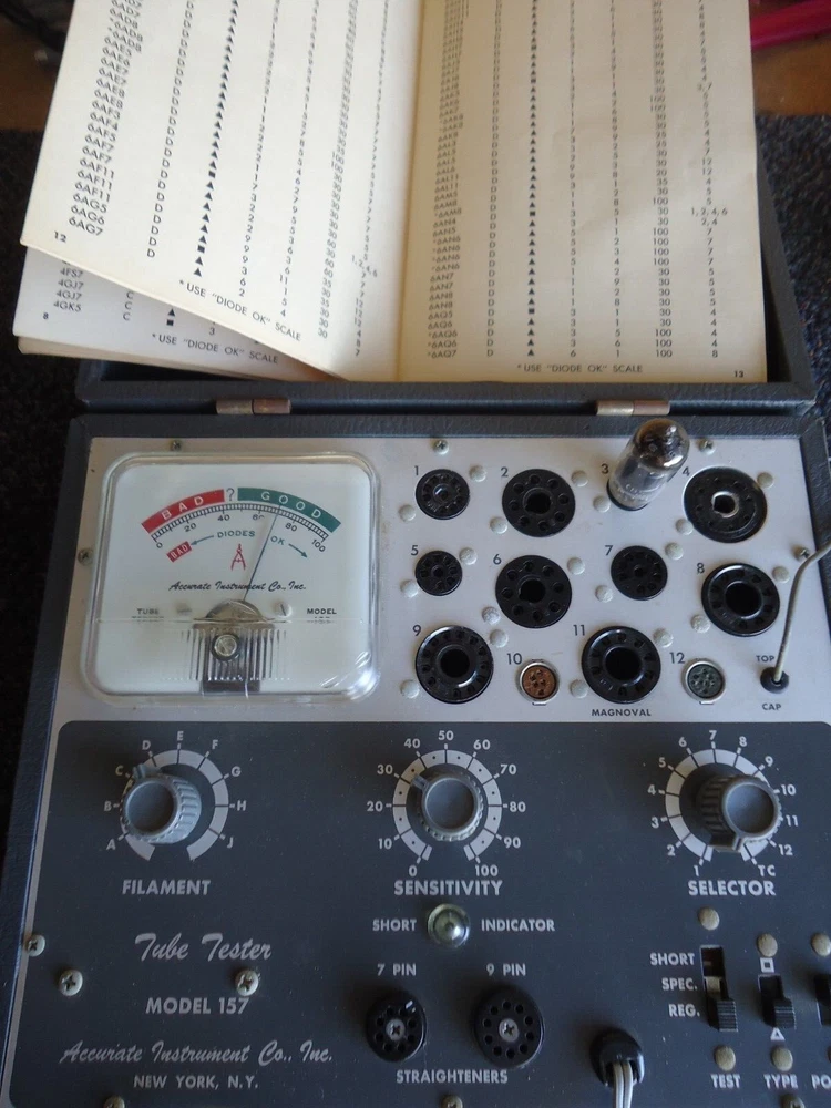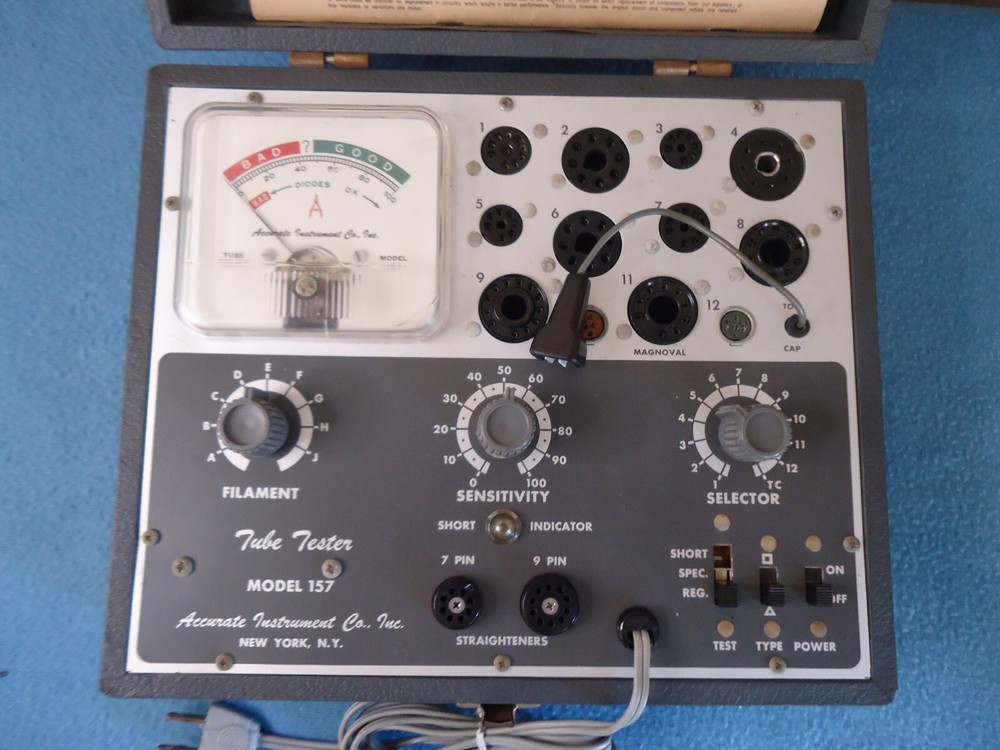 Accurate Instruments Model-157 Emission Type Tube Tester for sale this bulb tester, it has signs of use, it does not have a handle, It will be sent with the manual that also contains the list of test settings, It came with a few tubes, the same ones I used for the tests, The following tubes are included in this listing: 17D4, 6AU6, 6U8A, 8CG7,6AQ5, 6X4 This tester appears to be in working condition, please see the video and photos before purchasing. Video: Just Click Here regardless of what I show in photos, video and description this tester is sold for parts or not working for the following reasons: there are people who buy only to change or remove parts of what they buy, then they want to return them saying that what they received is not what was described, That's why I show a video of what you are about to buy, thanks for your understanding
