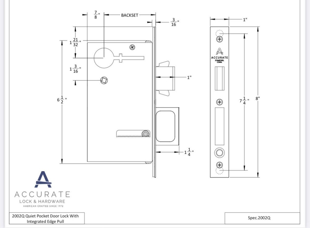 Accurate Lock 2002Q5 2 1/2 US15 Pocket Door Lock with Integrated Edge Pull Satin Nickel with Rectangular Pulls Quiet Pocket Door Lock with Integrated Edge Pull Premium quality mortise lock for pocket doors featuring an integrated slow release edge pull allowing for comfortable and quiet operation to pull door out of the pocket. For use with single doors or pair with 2002CPDS-Q for pair of doors.