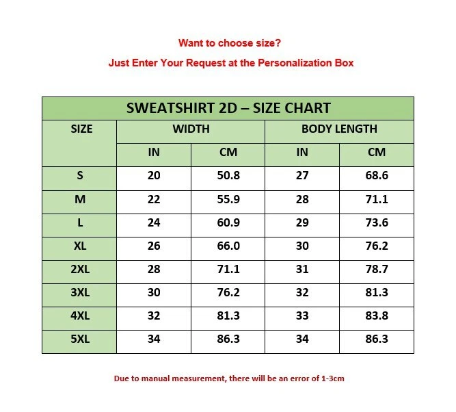 If you are ordering a product, please message me or note the color and size you require. We have sizes available from S-5XL and prices are the same for all sizes If the product you purchased is a name or number customized product, please note in the Personalization box or send us a message. To ensure the fastest delivery time, customers in each region will receive their shipments from the warehouse located in that region Delivery Time Customers in the USA, Canada: Shipped from the USA warehouse, delivery within approximately 5-9 business days. Customers in the UK and EU: Shipped from the EU warehouse or UK warehouse, delivery within approximately 4-8 business days. Customers in Australia: Shipped from the Australia warehouse, delivery within approximately 4-8 business days. If you want to buy a Sweatshirt, Hoodie or Tank Top but there are no options on the product listed, please message us for assistance. A. ORDER PLACEMENT INSTRUCTIONS Please review all the provided photos. Select your preferred shirt size. Indicate your color preference. Click the "ADD TO CART" button. You can return to add more items for your family or proceed to checkout. If you have added any additional notes, continue by choosing "Proceed to checkout." Your selected shirt will be prepared for shipping. B. PRODUCT DETAILS Add more style to even the most basic item like a sweatshirt with our custom Sweatshirt. Made from 50% cotton and 50% polyester, our Sweatshirts are super comfy and very durable. Material: 8 oz/yd², Heather Sport Royal (60% Polyester/40% Cotton), 50% cotton, 50% polyester (All others) – Breathable, comfortable yet very durable. Fabric with 50% cotton absorbs sweat well, and it feels comfortable to wear, especially when you are exercising or working out. The image is vivid, the color is bright and strong. It will never be discolored. Color:multi color FAQs: I JUST PLACED AN ORDER, WHEN WILL IT SHIP? It is noted that your order processing time can be affected if the initial information provided to us is insufficient or incorrect such as inaccurate or incomplete payment; incorrect address information and insufficient product measurements. We seek your understanding and support if it is the case. FEEDBACK Please feel free to contact us if you have any questions about the merchandise. If you are satisfied with the item, please leave a positive feedback and full-star rating for us! Your satisfaction is the most important thing to us. Please contact us first if you could not leave a positive feedback! Just let us know what the problem is, and we are happy to help. CONTACT US If you have any questions or suggestions, please email to us immediately. Your messages will be answered within 24 -48 hours. We shall try our best to solve your problem to your satisfaction. Have A Nice Day! Thank you On Dec 16, 2024 at 08:27:33 PST, seller added the following information: