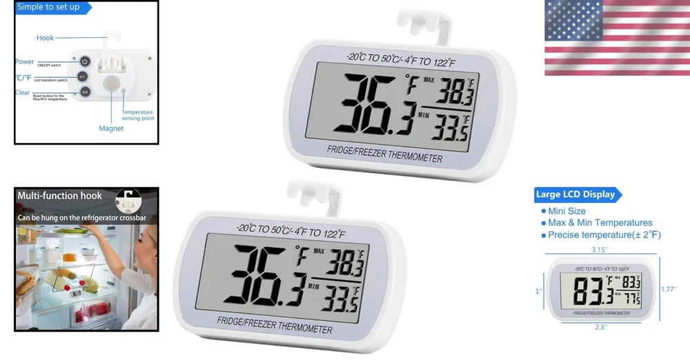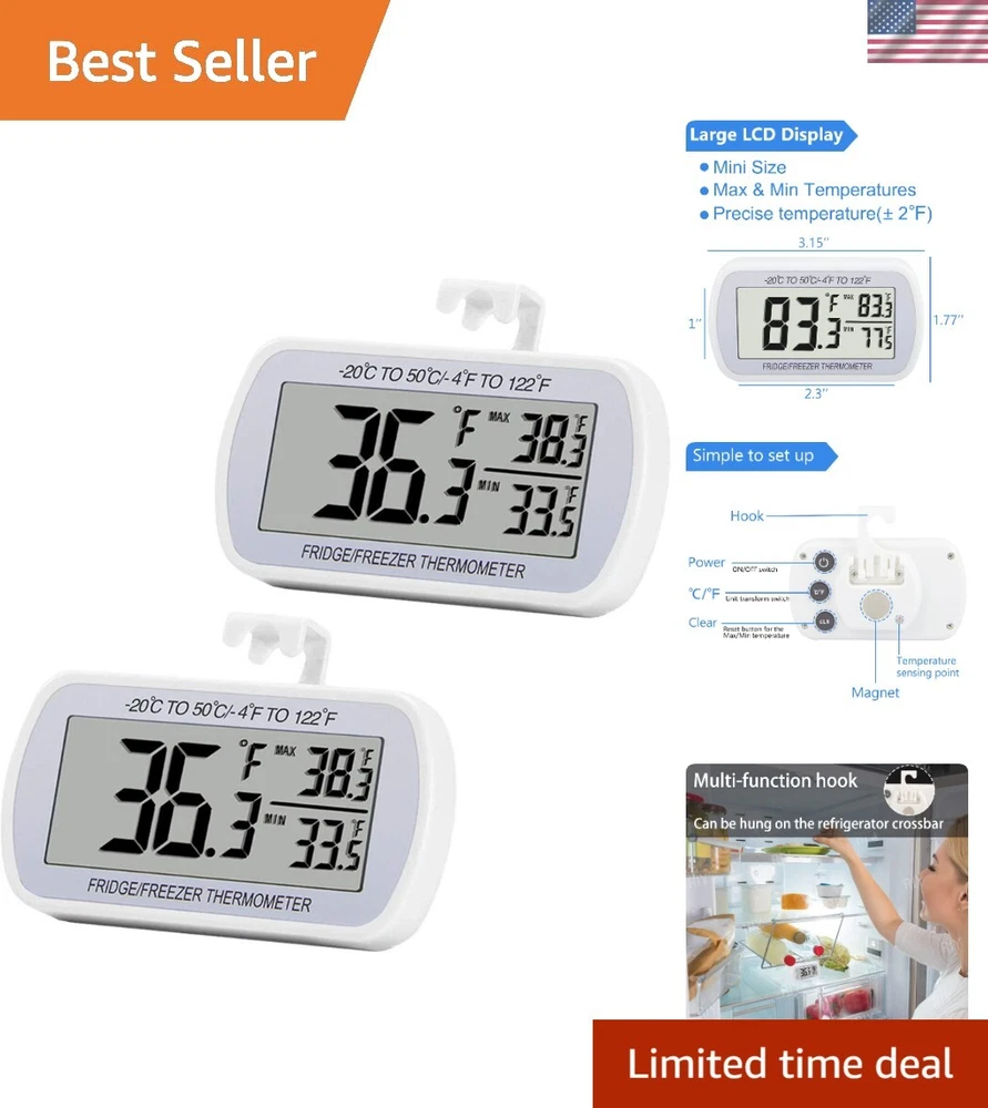 Accurate Max/Min Record LCD Thermometer 2 Pack - Reliable Temperature Monitoring ‹ › ‹ › ‹ › ‹ › ‹ › ‹ › ‹ › ‹ › Accurate Max/Min Record LCD Thermometer 2 Pack - Reliable Temperature Monitoring Features: Large screen with big digits for easy temperature monitoring Wide measuring range from -4°F to 122°F with high accuracy ±2°F Max/Min temperature value display on screen for easy tracking Hook, magnet, and stand for versatile placement options Waterproof structure level IPX3 and made of ABS environmentally friendly material Works with CR2032 battery (included) and batteries can be replaced Multiple uses in home refrigerators, restaurants, bars, cafes, supermarkets, and more Benefits: Easy to read LCD display with large digits Accurate temperature monitoring for fridge or room Convenient hook, magnet, and stand for flexible placement Waterproof and durable design for long-lasting use Includes batteries and easy to replace Perfect for various settings including home, restaurants, and supermarkets Why choose our Accurate Max/Min Record LCD Thermometer 2 Pack? Ensure your food stays fresh and your environment stays comfortable with our Accurate Max/Min Record LCD Thermometer 2 Pack. With a wide measuring range and high accuracy, you can easily monitor temperature changes in your fridge or room. The versatile design allows for easy placement with the hook, magnet, or stand options. Plus, the waterproof and durable construction ensures long-lasting use in various settings. Don't settle for unreliable temperature monitoring - choose our Accurate Max/Min Record LCD Thermometer 2 Pack for peace of mind and accurate readings every time. Shipping Free & Fast Shipping - We offer free shipping to most of the USA with a normal delivery time of 3-7 days. However, due to the current situation, additional delivery time (up to 3 weeks) may be required for some items. Alternative Carriers - We may use alternative carriers (e.g. USPS, FedEx, UPS, etc.) to ensure your package arrives safely and on time. Due to the use of multiple carriers, we are unable to provide a tracking number automatically. Handling Time - Orders are processed and shipped within 1-2 business days of receiving cleared payment. Shipping Restrictions - Shipping to Alaska, Hawaii, Puerto Rico, Guam, and other US territories may incur shipping charges or delivery restrictions. Please contact us before ordering, or your order can be refunded/cancelled. State Restrictions - There may be restrictions based on your state of purchase. For example, certain items may not be shipped to California due to state regulations. Contact for Tracking Updates - If you require tracking updates or have any concerns about the delivery of your order, please feel free to contact us, and we will be happy to assist you. Return 30-Day Hassle-Free Returns - We want you to be completely satisfied with your purchase. If you are not, you can return the item within 30 days of receiving it for a full refund or exchange. Easy Return Process - To start a return, simply contact us and we will provide you with a prepaid return shipping label and detailed instructions. Restocking Fee - There are no restocking fees for returns. However, the buyer is responsible for return shipping costs if the return is not due to a seller's error. Refund Processing Time - Refunds will be processed within 5 business days of receiving the returned item in its original condition. Payment We accept all major credit cards, PayPal, and Apple Pay for your convenience. Your payment information is secure and encrypted to ensure a safe and seamless transaction. Please complete your payment within 3 days of purchase to avoid any delays in shipping. Feedback Your feedback is extremely important to us. We strive to provide the best products and customer service possible. If you are satisfied with your purchase, please take a moment to leave us a positive review. If you have any concerns or issues with your order, please contact us before leaving negative feedback. We are committed to resolving any problems and ensuring your satisfaction. Contact Us If you have any questions or concerns, please feel free to reach out to our customer support team. You can contact us through the eBay messaging system. We are available Monday to Friday, 9:00 am to 5:00 pm EST, and we will do our best to respond to your inquiry within 24 hours. Thank you for supporting our small family business!