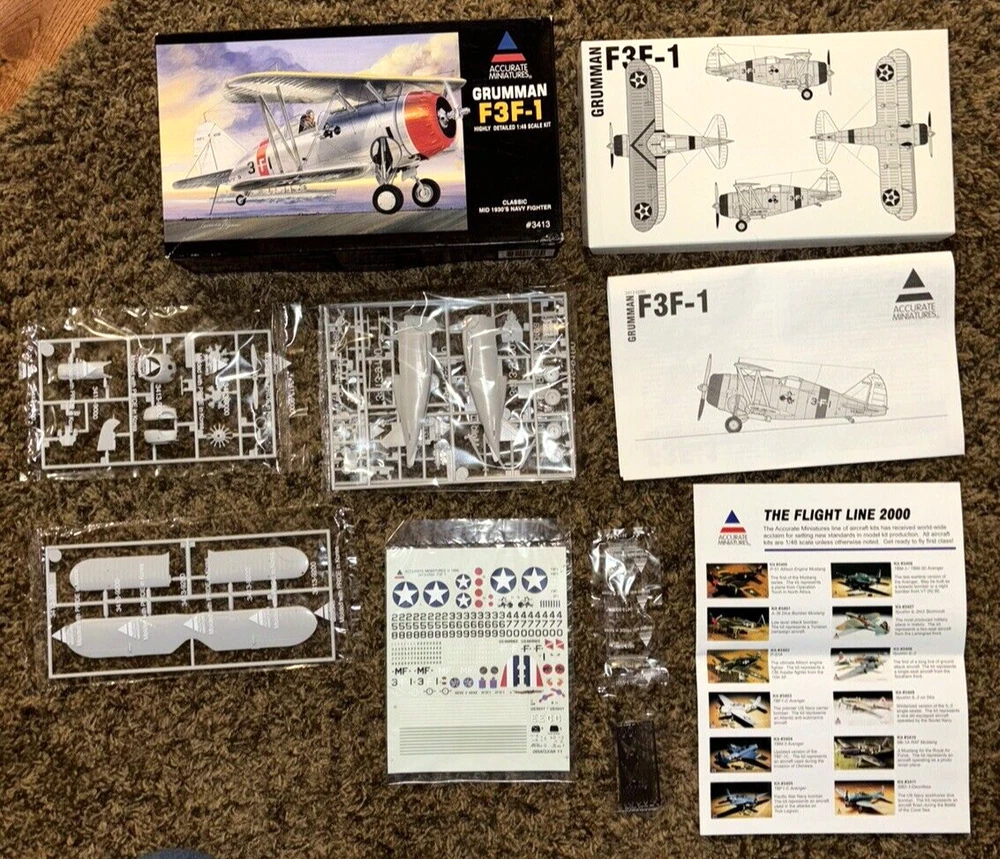 Just in from a local estate is a Accurate Miniatures Grumman F3F-1 Airplane Model Kit - Sealed Parts. This is an open box model with sealed parts, decals and instructions. Please view all the photos for a visual description. Best of Luck...