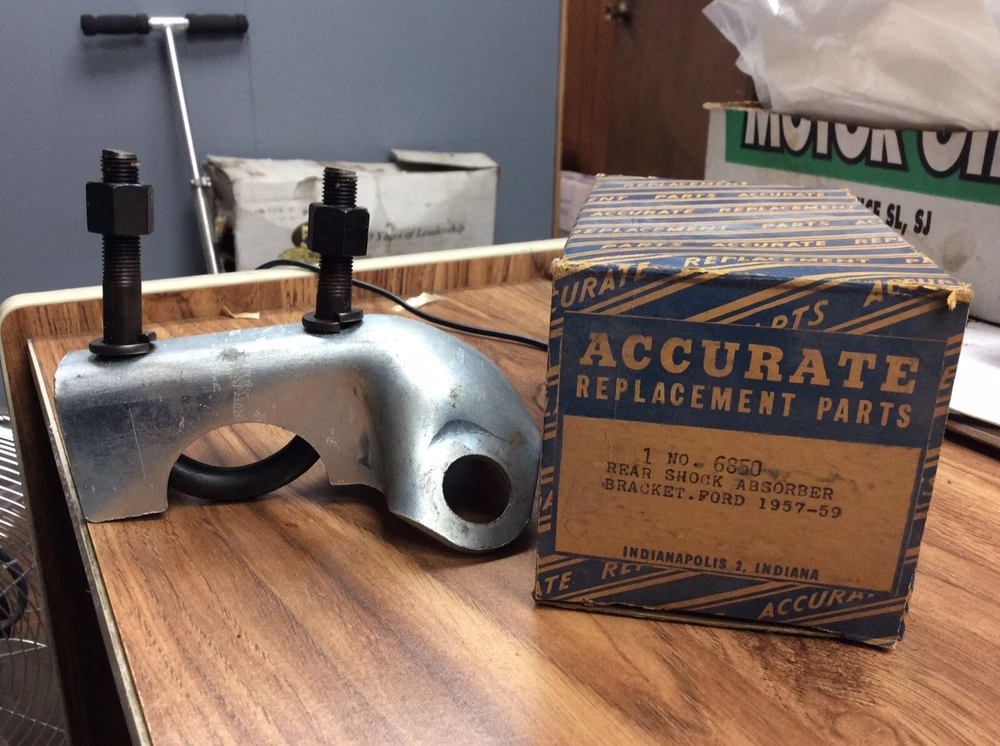 Accurate Replacement Parts- 6850, Rear Shock Absorber Bracket, Ford 57-59 Location LM6 Quantity: 1 May ship with original box folded up or with just original box label in flat rate box to save on shipping. Please check and verify your application before bidding. These parts came from an old auto parts store that went out of business. They have been in dry storage and I'm sorting through a LOT of parts. Metal parts may have slight surface rust and rubber/leather parts may need to be soaked in oil. Most of these are old parts and may look like old parts that have been sitting on a shelf in a box! I will be listing parts on eBay as I get time. Please verify that they will fit your application. I take my information from VERY old catalogs, as well as cross-reference on the internet. If you need sizes, please ask before bidding. All sales final, please ask any questions before bidding! Thanks!