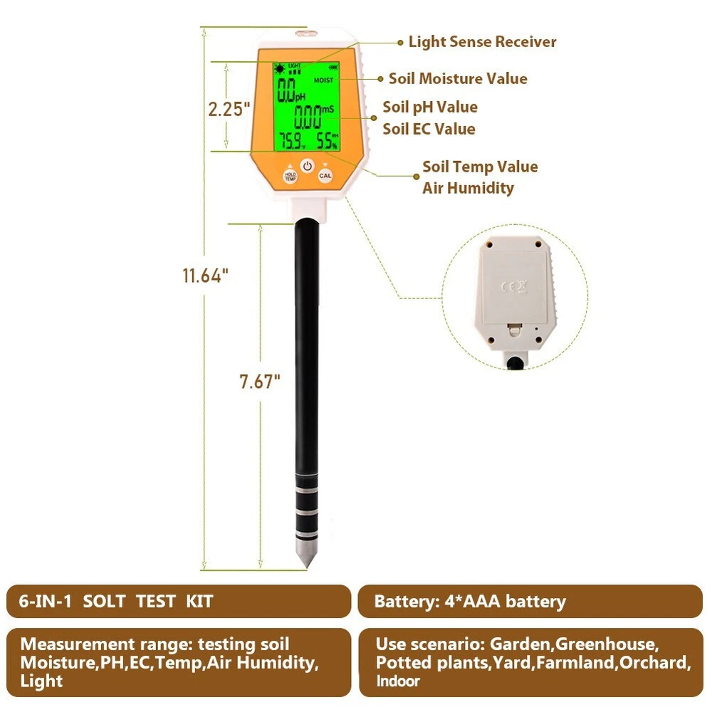 Accurate Soil Tester with pH Moisture Temp Light Readings for Gardening DESCRIPTION Features: *Comprehensive Soil Analysis: 6-in-1 Soil Tester provides essential measurements including pH, EC, moisture, sunlight, humidity, and temperature, enabling gardeners to understand the ir soil conditions thoroughly for better plant care. *Enhanced Measurement Accuracy: Featuring a robust stainless steel probe, device minimizes risk of damage or , reliable readings on an oversized backlit screen that displays all six metrics simultaneously. *User-Friendly Design: Simply insert probe 3-5 inches into soil and receive results within 5 seconds. adjustable screen angle allows for comfortable viewing from positions without straining. *Versatile Applications: for both indoor and outdoor use, soil meter perfect for a variety of plants including succulents, cacti, and houseplants, making it a versatile tool for any gardening enthusiast. *Important Usage Guidelines: To ensure accurate readings, do not test directly and avoid inserting probe into overly dry soil. Pre-water area if necessary to prevent damage to tester. Specifications : *Product Name:6-in-1 Soil Tester *Material: plastic *Size:33*9*4.2CM *Color:as shown *Fitment: or both indoor and outdoor use *Number of Pieces:1 Package Content: 1 * 6-in-1 Soil Analyzer Note : 1. The real color of the item may be slightly different from the pictures shown on website caused by many factors such as brightness of your monitor and light brightness. 2. Please allow slight manual measurement deviation for the data. POLICES Shipping Payment WARRANTY We only ship to confirmed ebay Order addresses. Please comfirm that your Order address is in line with your shipping address. Please kindly note that the c ombined shipping is not provided because the shipping fee is calculated by weight. Also, the each additional item means exactly the the same color and size. It takes about 7 -15 working days to US; about 10-30 working days to other countries. Transit time may be a little delayed because of the bad weather and customs inspection . If you do not receive your item within 30 working days since payment finished, please contact us immediately for further assistance. Payment must be completed within 5 days. If you have any problems about payment, please contact us via ebay message. We strive for 100% customer satisfaction! Positive Feedback is very important to us. If you have any questions, p lease feel free to contact us via "Ask seller a question" . We will reply your email within 24 working hours. On Nov 7, 2024 at 09:16:23 PST, seller added the following information: