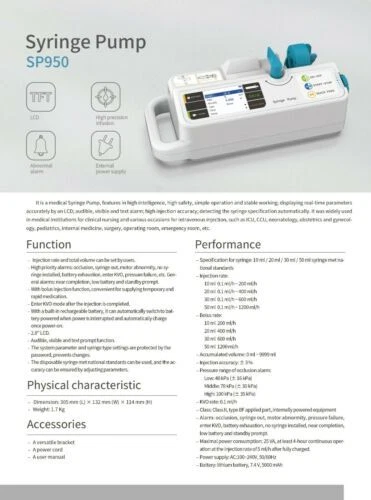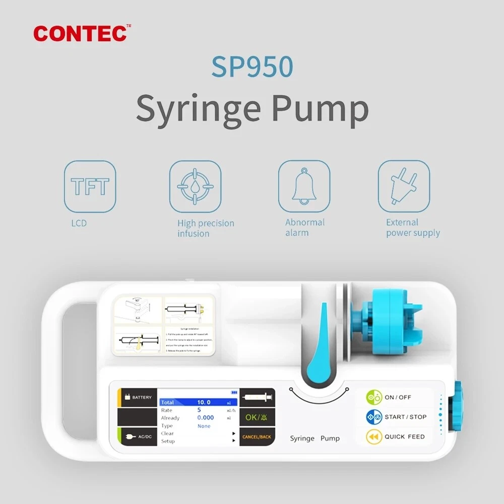 SP950VET IV & Fluid Infusion Syringe Pump LCD Medfusion Machine, Alarm+ KVO NEW hot Introduction Introduction SP950 is a syringe pump for medical use, and it adopts microcomputer system and microelectronic technology, features in high-intelligence and high-safety. LCD can display each parameter in real-time, with multi-function alarm, and alarm with visual, auditory and character prompt. It takes the advantages of easy operation, steady work, high accuracy and checking the syringe specification automatically. And now, it has been widely applied in each vein injection in hospitals for clinical nursing, such as ICU, CCU, neonatology, obstetrics and gynecology, pediatrics, internal medicine, surgery, operating room, emergency room. Features 1) Infusion rate and total volume can be set by user. 2) Alarms for infusion pipe occlusion, syringe fall-off, communication abnormal, low battery. 3) Bright, alarm volume and range of pressure alarm are adjustable. 4) Quick feed function, convenient for supplying medicine quickly and instantaneously. 5) Enter KVO mode after infusion completed. 6) The system will give prompt signal when there is no operation at power-on state. 7) Built-in rechargeable battery provides such functions as auto-switch power supply and auto-charge. 8) Display parameters with large screen, and give prompt information with visual, auditory and character signal, which is convenient for medical persons to operate. 9) The device can equipped with disposable syringe (CNS), and accuracy can be ensured by adjusting parameters. Performance 1) Specification requirement for syringe: 10ml/20ml/30ml/50ml (CNS) 2) Infusion rate: 10ml 0.1ml/h-100ml/h 20ml 0.1ml/h-200ml/h 30ml 0.1ml/h-300ml/h 50ml 0.1ml/h-500ml/h 3) Rate of quick feed: 10ml 100ml/h 20ml 200ml/h 30ml 300ml/h 50ml 500ml/h 4) Accumulated volume display: 0ml-999.9ml 5) Accuracy: ±3% 6) Pressure range for occlusion alarm: Three grades are adjustable: Low: 40KPa ± 16KPa Middle: 70KPa ± 30KPa High: 100KPa± 35KPa 7) KVO rate: 0.1ml/h~5ml/h, adjustable 8) Safety classification: Class Ⅱ equipment, internally powered type BF 9) Alarm function: ①At non-operated state ②Near empty ③Empty, enter KVO mode ④Syringe fall-off ⑤Occlusion ⑥Pressure failure ⑦Motor failure ⑧Low battery ⑨Communication abnormal 10) Maximal power consumption: 20VA~30VA, the device can continuously work for at least two hours with the injection rate of 5ml/h or 500ml/h after fully charged. 11) Power supply: AC100~240V 50/60Hz 12) Battery: rechargeable lithium battery, 7.4V, 3500mAh 13) Working environment: Temperature: +5~40℃; Atmospheric pressure: 860hPa~1060h; Relative humidity: 20%~90%; no strong vibration and no corrosive gas. 14) Storage environment: Temperature: -20℃~+55℃; Relative humidity: ≤90%, no condensation; No corrosive gas and well-ventilated Accessories A bracket A power cord A user manual Two fuses Physical characteristic Dimension: 310mm*140mm*135mm(L×W×H) Weight: 1.7kg Buy safe products The following FDA Disclaimer is required for all eBay listing in Healthcare category and is included for REFERENCE: The sale of this item may be subject to regulation by the U.S. Food and Drug Administration and state and local regulatory agencies. If the item is subject to FDA regulation, we will verify your status as an authorized purchaser of this item before shipping of the item. The Fingertip Pulse Oximeter is registered on the Australian Register of Therapeutic Goods (ARTG)with the code 197923, and certified by FDA of United States and CE,TUV of Europe. The Fingertip Pulse Oximeter that is FDA 510K Approved International Buyer--Please note: Import duties,Taxes are not included in the item price.These charges are buyers' responsibility We are the manufacturer of medical equipment for 17 years, the following are our main products: ECG / ECG holter EEG / EEG Holter B-ultrasound Patient Monitor Fetal doppler Fetal Monitor Spo2 Monitor Stethoscope Medical Image.... Agent in the world! We are look for partners in the world now! Do you want to become our agent in you conutry? Join US! Skype:xuebox3 contec.med.mary at hotmail.com Only English User Manual,Please contact us if you need other language version.thank you This product is sold worldwide, if you are using it in the United States, please contact me before purchasing