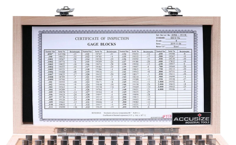 Accusize Industrial Tools Precision 81-Piece Steel Gauge Block Set, Grade B Accuracy, Corrosion-Resistant, P900-S581 81 pc Grade B Steel Gage Block Set with MFG'S certificate Manufactured under carefully controlled conditions allowing for the highest degrees of accuracy when used at a temperature of 68 degrees F. (20 C). All gage block sets are assigned serial numbers and accompanied with a certificate of inspection listing the deviation for each block Each gage block set meets or exceeds federal specification ASME B89.1.9-2002. Hardened to HRC 64 / All gage block sets are made to special standard to resist corrosion and defacement Manufactured under carefully controlled conditions allowing for the highest degree of accuracy when used at a temperature of 68 degrees F ( 20 degree C) Please note : --- If the item cannot use or you received your item not as expected. Please let us know. You can return the item for getting a full refund. The full refund is a guarantee after the item is returned. Of course, there is no cost for you to return the item back. ---Again, If you want open an eBay return case. If it is possible, could you please help us write or select the reason for return as "change my mind " or "order by mistake" or "Doesn't fit or " Just didn't like it " . Do not worry, We do not charge anything. You still received the full refund also. --- Please don't write or select another reason. It will affect our eBay performance. If you consider helping us, it would mean so much to us. Please consider it as a support for building up our eBay into a better community. --- If you have any problem with your order, please contact us and we will do our best to make you satisfied. Store Policy 100% Satisfaction Money Back Guarantee, Return accept every case. Fast Shipping, Only 1-2 Days Handling Time. We try to ship most items within 24 hours of payment Most orders are in transit for two days but some may take longer. Please Contact us by eBay message only, We usually respond within 24-48 hours on weekdays. Buy with confidence. We ship through Fast Trusted shipping carrier and storage in best warehousing services throughout the United States. Your kind positive feedback and full score rating would mean a world to us, we do appreciate. If you feel dislike or not satisfy about anything and thinking about giving us a neutral or negative feedback or not giving full score rating to us, please kindly contact us through eBay message before doing that, we would like to attend to any of your concerns and make things right for you. Shipping Policy We only ship to addresses that record on eBay data. We provide Fast shipping via one of the most reliable carriers (UPS, FedEx, USPS, etc). We do not ship to APO/FPO addresses or PO Boxes allowed. Local pickups and combined shipping options are not provided at this time, sorry for this inconvenience. International buyers please note: Import duties, taxes, and charges aren't included in the item price or postage cost. These charges are the buyer's responsibility. Please check with your country's customs office to determine what these additional costs will be prior to bidding or buying. Return Policy 100% customer satisfaction Money Back Guarantee, if the item received is either not as described or damaged in many ways. We will always guarantee a return with full responsibility. Contact us and simply follow our instruction. We will provide you with complete return instruction to your eBay message. The location of the warehouse responsibility for the return will be determined by the fulfillment service department.Of course, there is no cost for you for return item back. Once the item arrived at our warehouses and confirm from the tracking number that the item has been delivered.We will issue you the refund within 2 business day. Again, If you want open eBay return case. If it possible , could you please help us write or select reason for return is "change my mind "or "order by mistake" or Doesn't fit or " Just didn't like it ".Do not worry, we do not charge anything. You still received the full refund also. Please don't write or select another reason. It will be effect with our eBay performance. If you consider to help us, it would mean so much for me. Please consider as a support for build up our eBay a better community.