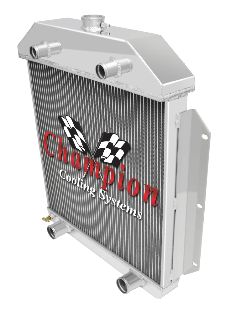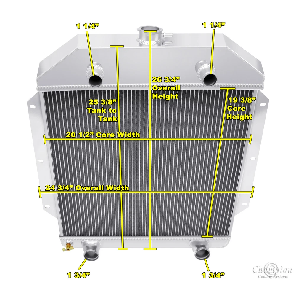 Champion Cooling radiators are tig welded with aircraft grade aluminum. Every radiator comes with a limited lifetime warranty so you can buy with confidence! Product Specifications: Core (H x W): 19.375" x 20.5" - Overall (H x W): 26.75" x 24.75" - Hose Locations (In x Out): Dual - Driver & Pass x Dual - Driver & Pass - Hose Fittings (In x Out): 1.25" x 1.75"Please click on the "Read more" link below to view a complete item description with product videos and additional items to upgrade your cooling system. PART INFORMATION Shipping Payment Policies Contact Us Part Information Related Items Genuine Champion Cooling Systems Part #EC49FH This radiator is designed for a Flathead engine configuration. Features Higher density core: cooling rows are spaced 3/8" apart: giving you 25% more rows within the core than other aluminum radiators sold on eBay and 35% more rows than OEM copper. Aluminum dissipates heat more efficiently than copper or brass. 14-16 cooling fins per inch (42 per square inch) giving you approximately 1500 more cooling fins than other aluminum radiators and approximately 3000 more than OEM copper radiators. Lighter weight. Outperforms other 2, 3 and 4 row copper radiators. High performance appearance. You get "BIG BLOCK COOLING" and "PEACE OF MIND" when you drive your car with a Champion Cooling Systems radiator. You could easily spend $400 - $1,000 more for a radiator of similar quality. Needs modifications to your radiator? We can do them! Brackets, inlet/outlet size changes, whatever you need. Polishing also available! Please allow additional shipping time for any of these services. Specifications Down Flow Or Cross Flow Type: Down Flow Mounting Type: Bracket Tank Material: Aluminum Core Material: Aluminum Overall Height: 26 3/4 Overall Width: 24 3/4 Core Height: 19 3/8 Core Width: 20 1/2 Inlet Location: Dual - Driver & Pass Inlet Diameter: 1 1/4 Outlet Location: Dual - Driver & Pass Outlet Diameter: 1 3/4 Core Row Quantity: 2 Row Internal Transmission Oil Cooler: No Filler Neck Attached: Yes Core Thickness: 1 9/16 Core Tube Width: 0.75 This package includes a 2 Row All Aluminum Radiator. Shipping Shipping Our radiators are hand packed in the factory box and shipped via FedEx with insurance. Call for extra shipping rates to Hawaii, Puerto Rico, & Alaska International shipments are via FedEx International. Payment Pay securely with any major credit card! Guarantee Policies We will refund (or exchange after 60 days) 100% of your money (Including All Shipping Costs) If: Your radiator does not fit Your radiator does not cool your engine Your radiator leaks Contains manufacture's defects Or for some reason you just do not like it Contact Us © 2009 - 2017