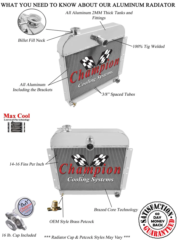 Champion Cooling radiators are tig welded with aircraft grade aluminum. Every radiator comes with a limited lifetime warranty so you can buy with confidence! Product Specifications: Core (H x W): 14.625" x 19.375" - Overall (H x W): 21.625" x 22.125" - Hose Locations (In x Out): Center x Pass - Hose Fittings (In x Out): 1.75" x 1.5"Please click on the "Read more" link below to view a complete item description with product videos and additional items to upgrade your cooling system. PART INFORMATION Shipping Payment Policies Contact Us Part Information Related Items Genuine Champion Cooling Systems Part #CC4152 Features Higher density core: cooling rows are spaced 3/8" apart: giving you 25% more rows within the core than other aluminum radiators sold on eBay and 35% more rows than OEM copper. Aluminum dissipates heat more efficiently than copper or brass. 14-16 cooling fins per inch (42 per square inch) giving you approximately 1500 more cooling fins than other aluminum radiators and approximately 3000 more than OEM copper radiators. Lighter weight. Outperforms other 2, 3 and 4 row copper radiators. High performance appearance. You get "BIG BLOCK COOLING" and "PEACE OF MIND" when you drive your car with a Champion Cooling Systems radiator. You could easily spend $400 - $1,000 more for a radiator of similar quality. Needs modifications to your radiator? We can do them! Brackets, inlet/outlet size changes, whatever you need. Polishing also available! Please allow additional shipping time for any of these services. Specifications Down Flow Or Cross Flow Type: Down Flow Mounting Type: Bracket Tank Material: Aluminum Core Material: Aluminum Overall Height: 21 5/8 Overall Width: 22 1/8 Core Height: 14 5/8 Core Width: 19 3/8 Inlet Location: Center Inlet Diameter: 1 3/4 Outlet Location: Passenger Outlet Diameter: 1 1/2 Core Row Quantity: 3 Row Internal Transmission Oil Cooler: No Filler Neck Attached: Yes Core Thickness: 2 Core Tube Width: 0.56 This package includes a 3 Row All Aluminum Radiator. Shipping Shipping Our radiators are hand packed in the factory box and shipped via FedEx with insurance. Call for extra shipping rates to Hawaii, Puerto Rico, & Alaska International shipments are via FedEx International. Payment Pay securely with any major credit card! Guarantee Policies We will refund (or exchange after 60 days) 100% of your money (Including All Shipping Costs) If: Your radiator does not fit Your radiator does not cool your engine Your radiator leaks Contains manufacture's defects Or for some reason you just do not like it Contact Us © 2009 - 2017