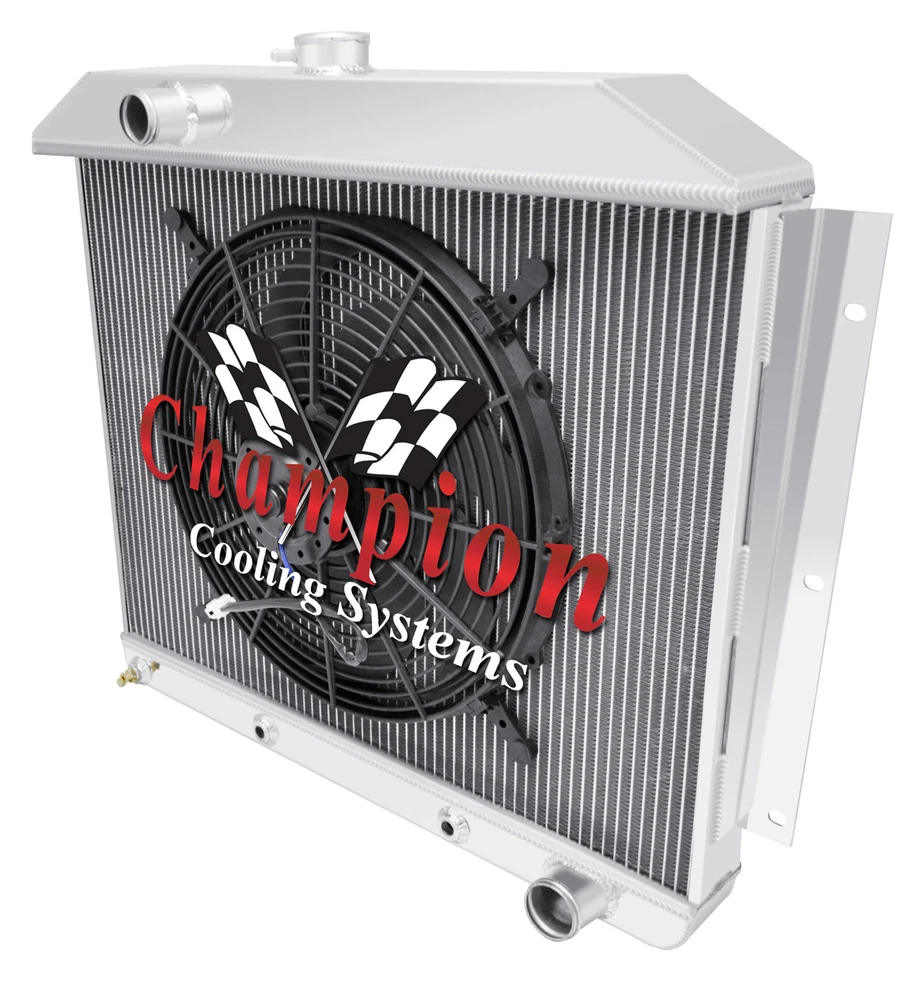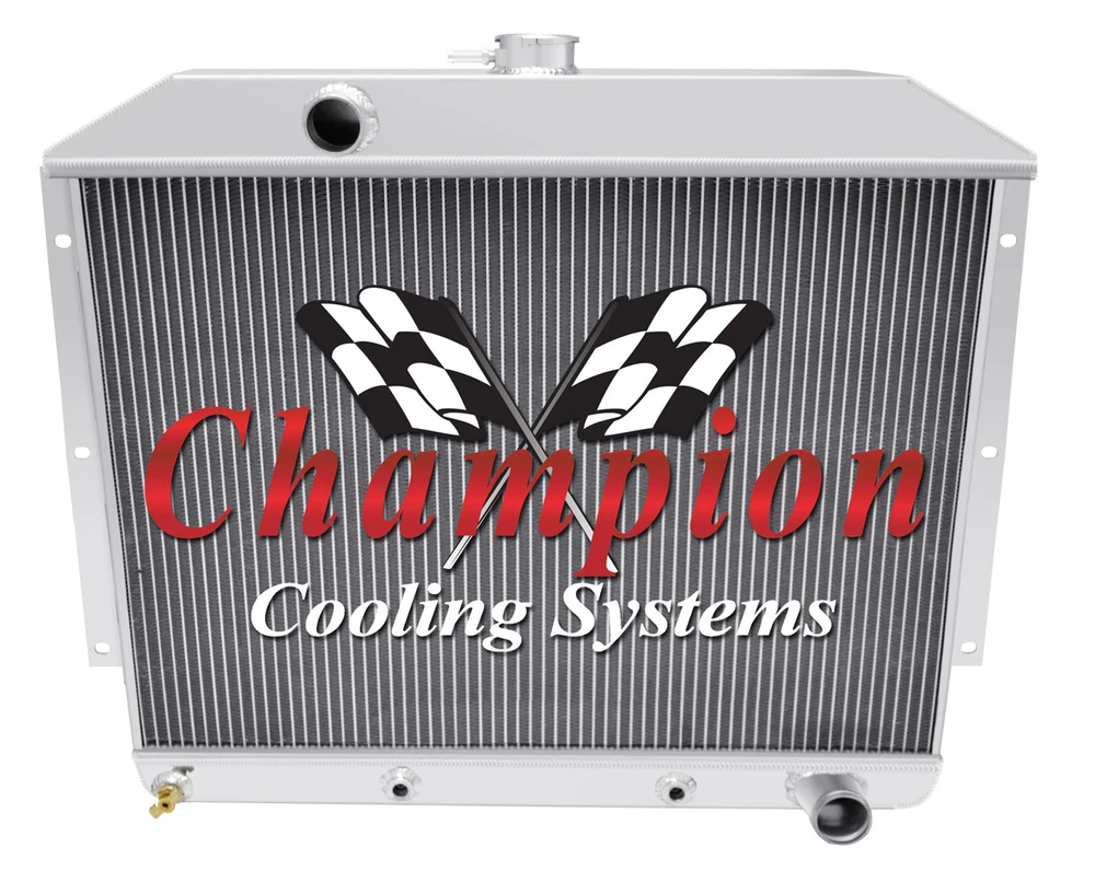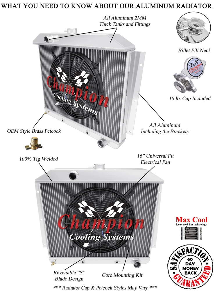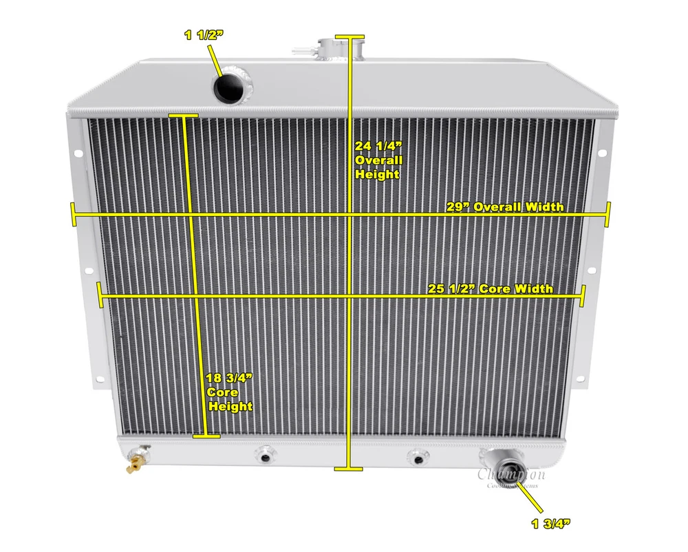 Champion Cooling radiators are tig welded with aircraft grade aluminum. Every radiator comes with a limited lifetime warranty so you can buy with confidence! Product Specifications: Core (H x W): 18.75" x 25.5" - Overall (H x W): 24.25" x 29" - Hose Locations (In x Out): Driver x Pass - Hose Fittings (In x Out): 1.5" x 1.75" - TOC: 1/2-20 Straight Thread, Inverted FlarePlease click on the "Read more" link below to view a complete item description with product videos and additional items to upgrade your cooling system. PART INFORMATION Shipping Payment Policies Contact Us Part Information Related Items Genuine Champion Cooling Systems Part #CC4951CH This radiator is designed for a Chevy engine. Features Higher density core: cooling rows are spaced 3/8" apart: giving you 25% more rows within the core than other aluminum radiators sold on eBay and 35% more rows than OEM copper. Aluminum dissipates heat more efficiently than copper or brass. 14-16 cooling fins per inch (42 per square inch) giving you approximately 1500 more cooling fins than other aluminum radiators and approximately 3000 more than OEM copper radiators. Lighter weight. Outperforms other 2, 3 and 4 row copper radiators. High performance appearance. You get "BIG BLOCK COOLING" and "PEACE OF MIND" when you drive your car with a Champion Cooling Systems radiator. You could easily spend $400 - $1,000 more for a radiator of similar quality. Needs modifications to your radiator? We can do them! Brackets, inlet/outlet size changes, whatever you need. Polishing also available! Please allow additional shipping time for any of these services. Specifications Down Flow Or Cross Flow Type: Down Flow Mounting Type: Bracket Tank Material: Aluminum Core Material: Aluminum Overall Height: 24 1/4 Overall Width: 29 Core Height: 18 3/4 Core Width: 25 1/2 Inlet Location: Driver Inlet Diameter: 1 1/2 Outlet Location: Passenger Outlet Diameter: 1 3/4 Core Row Quantity: 3 Row Transmission Oil Cooler Fitting Type: 1/2-20 Straight Thread, Inverted Flare Internal Transmission Oil Cooler: Yes Filler Neck Attached: Yes Core Thickness: 2 1/4 Core Tube Width: 0.63 This package includes a 3 Row All Aluminum Radiator and a 16" electric fan. Shipping Shipping Our radiators are hand packed in the factory box and shipped via FedEx with insurance. Call for extra shipping rates to Hawaii, Puerto Rico, & Alaska International shipments are via FedEx International. Payment Pay securely with any major credit card! Guarantee Policies We will refund (or exchange after 60 days) 100% of your money (Including All Shipping Costs) If: Your radiator does not fit Your radiator does not cool your engine Your radiator leaks Contains manufacture's defects Or for some reason you just do not like it Contact Us © 2009 - 2017