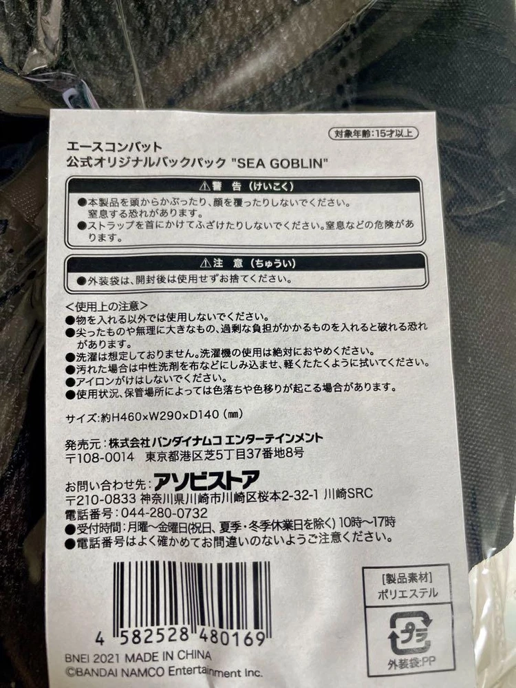 Item Title Ace Combat 25Th Anniversary Sea Goblin Backpack Payment Supports managed payments Please pay within 5 days after auction is finished. About Us We are located in Japan. It's our pleasure to make you happy by proposing our recommend item. If you have any questions or request about items, please feel free to ask us. International Buyers - Please Note: -Import duties, taxes, and charges are not included in the item price or shipping charges. These charges are the buyer's responsibility. -Please check with your country's customs office to determine what these additional costs will be prior to bidding/buying. -These charges are normally collected by the delivering freight (shipping) company or when you pick the item up - do not confuse them for additional shipping charges. -We do not mark merchandise values below value or mark items as - gifts - The US and International government regulations prohibit such behavior. Thank you for your understanding.