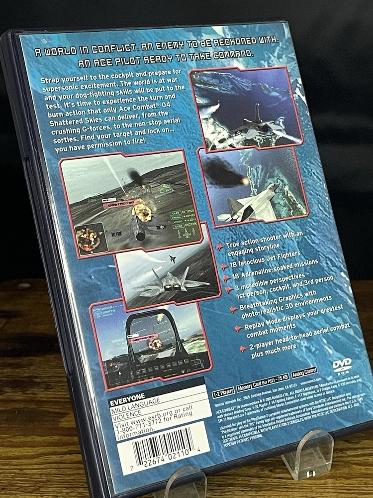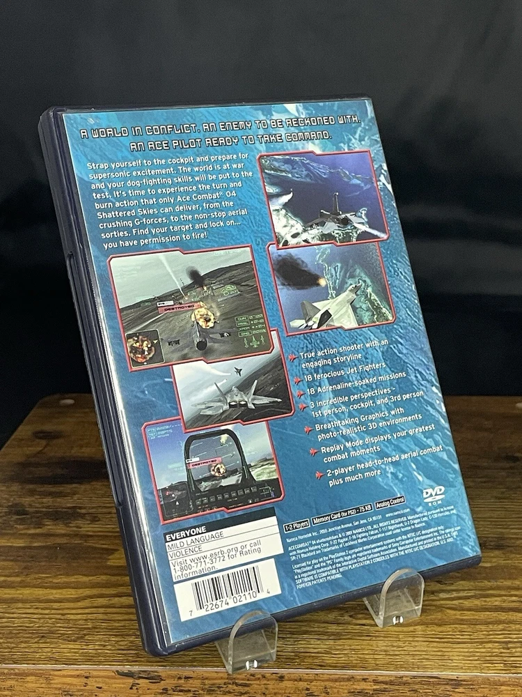 Experience the thrill of flight with Ace Combat 04: Shattered Skies for the Sony PlayStation 2. This Black Label edition includes a manual and has been tested for fast and reliable performance. Join the Ace Combat Series and enjoy hours of simulation gameplay with this complete edition. This game features multiplayer capabilities and is rated E for Everyone. It was released in 2001 and is compatible with NTSC-U/C (US/Canada) region codes. The publisher is Namco Bandai and the game is set in the United States. Get ready to take to the skies and become a master pilot with Ace Combat 04: Shattered Skies.