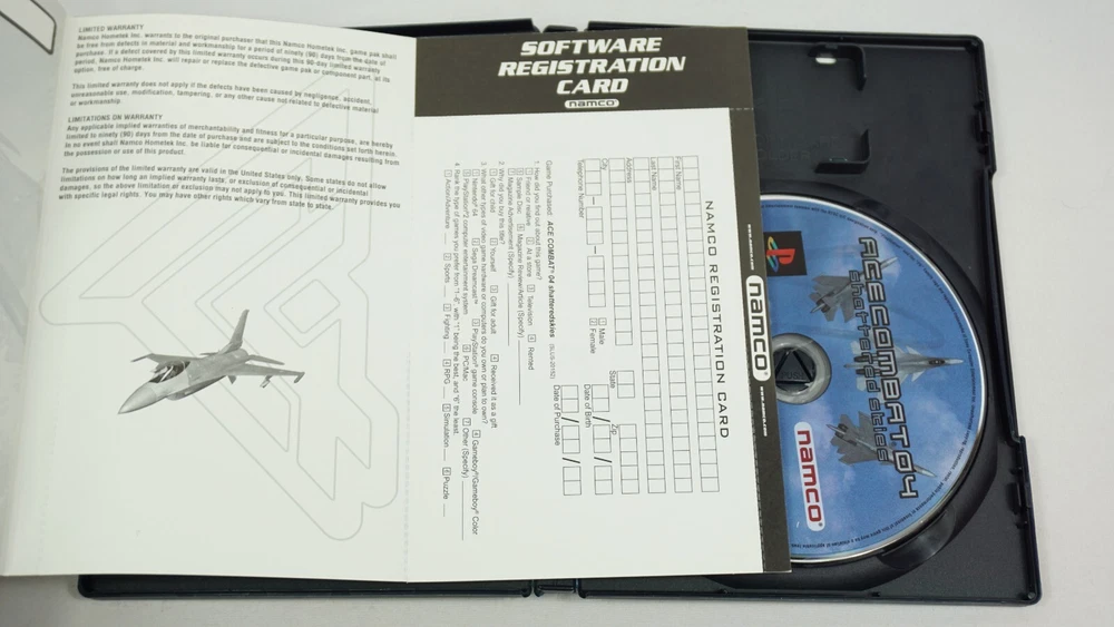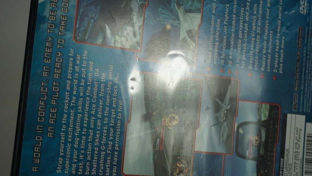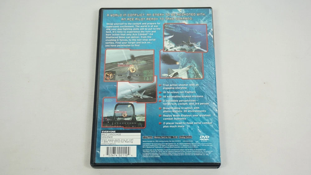 Immerse yourself in the thrilling world of Ace Combat with this complete edition of Shattered Skies for the Sony PlayStation 2. This black label first edition game features fast shipping and registration card included. Join the adventure and experience the excitement of flight simulator gameplay with multiplayer capabilities and a rating of E for Everyone. This unit is compatible with NTSC-U/C (US/Canada) region codes and was published by Namco Bandai in 2001. The game is part of the popular Ace Combat series and boasts a unique storyline and engaging gameplay. With the included manual and first print features, this game is a must-have for any simulation enthusiast. Case has dimples. Manual is clean. Registration Card is clean. Disc has sharpie residue and surface scratches. TESTED AND WORKING! AUTHENTIC AND TESTED