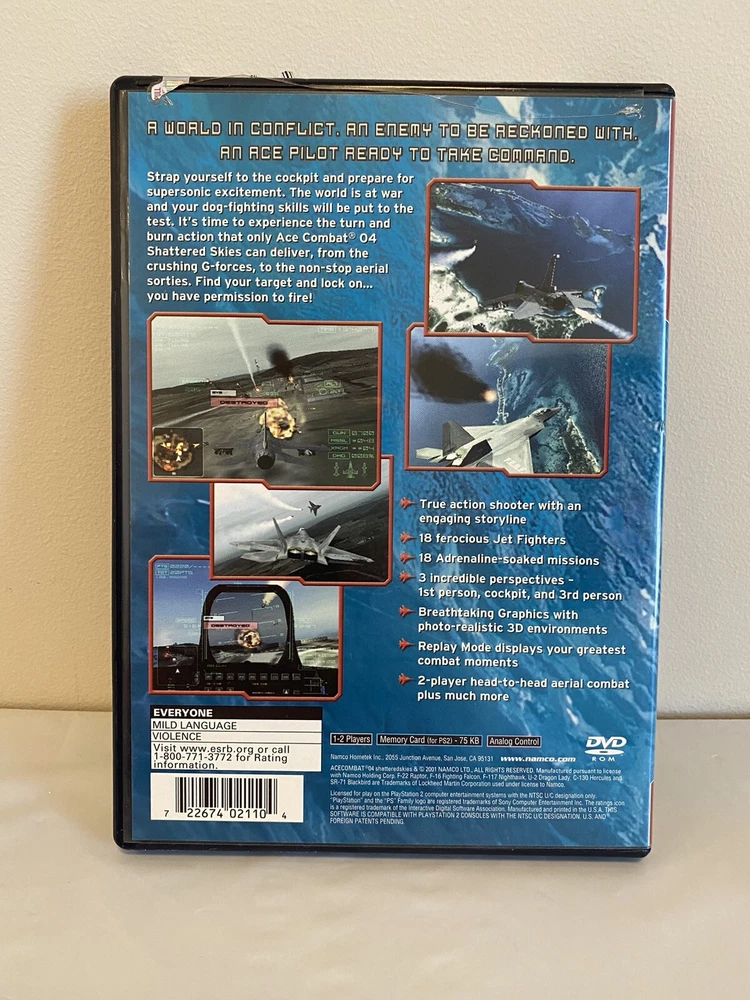 Immerse yourself in the thrilling world of Ace Combat 04: Shattered Skies for Sony PlayStation 2. This complete edition game features fast shipping, multiplayer mode, and a black label design. The game is a flight simulator with an E-Everyone rating and is part of the popular Ace Combat series. The package includes the game unit, manual, and has been tested for quality assurance. The unit type is a single unit and was released in 2001 by Namco Bandai. This game is perfect for anyone who loves simulation games and wants to experience the thrill of aerial combat.