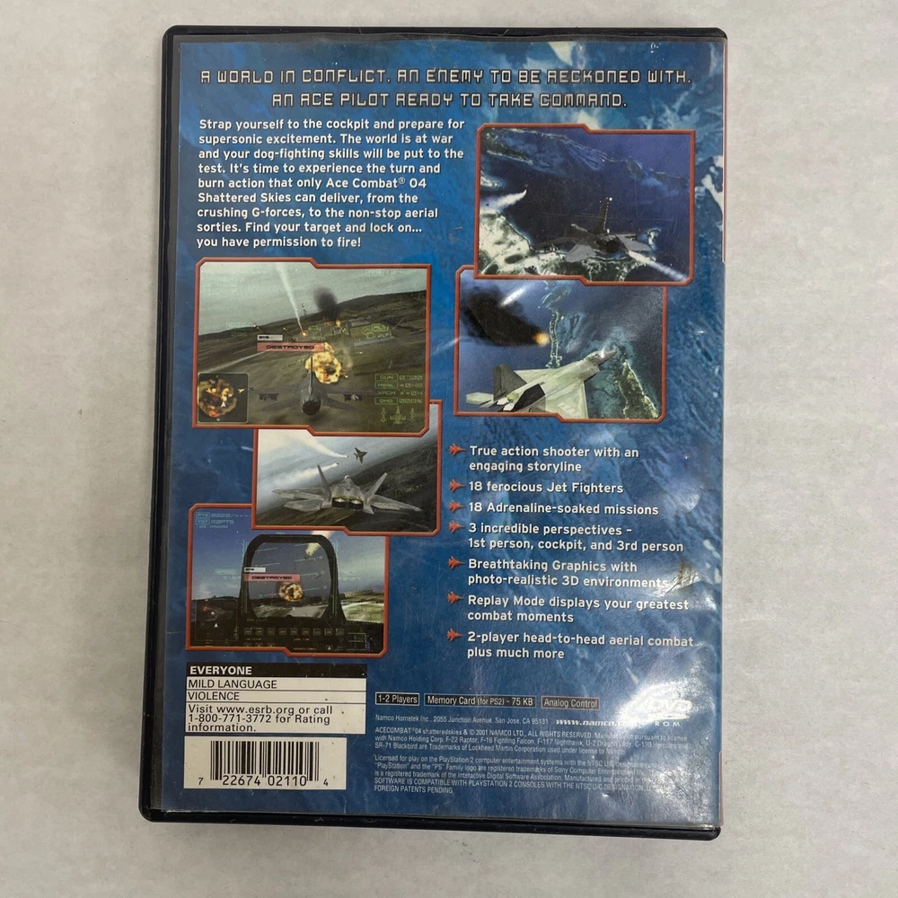 Experience the thrill of aerial combat in Ace Combat 4: Shattered Skies for the Sony PlayStation 2. Immerse yourself in the fast-paced and action-packed world of air combat with this simulation game. Take on different missions and fly different planes, all while enjoying the stunning graphics and engaging gameplay. This complete edition of the game includes everything you need to get started in the skies, and is rated E for everyone. With no manual included, you'll have to rely on your skills and instincts to navigate through the game. This game is NTSC-U/C (US/Canada) compatible and was manufactured in the United States. Buy now and experience the excitement of air combat!
