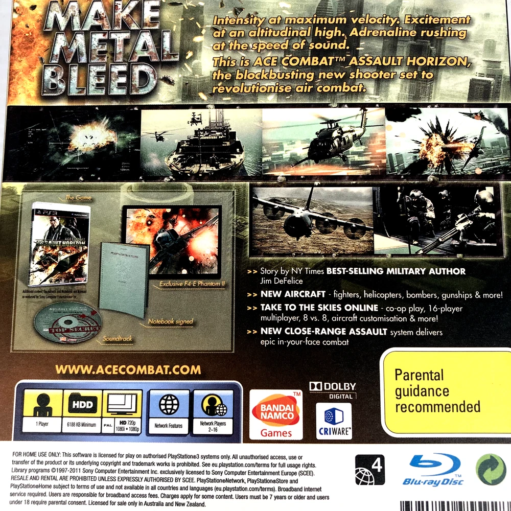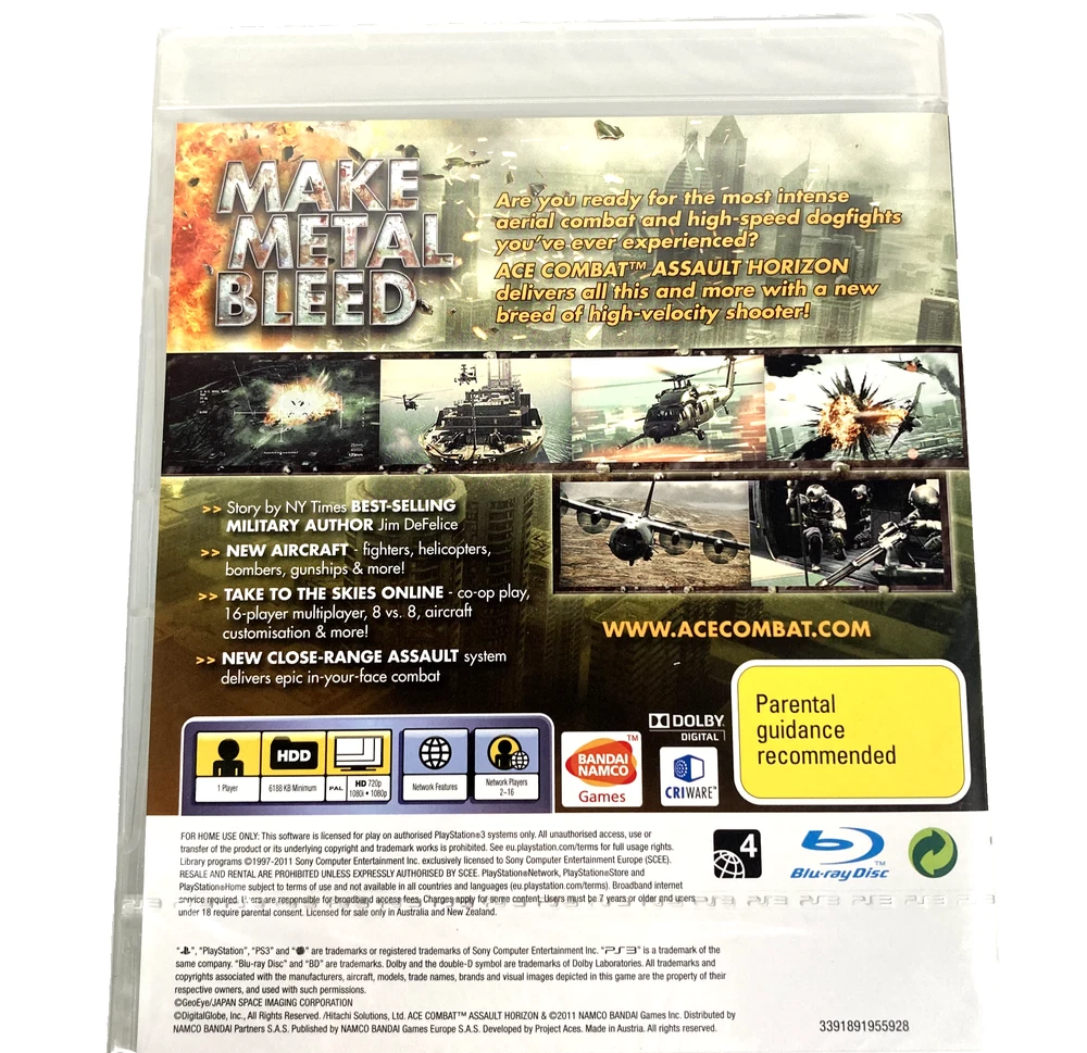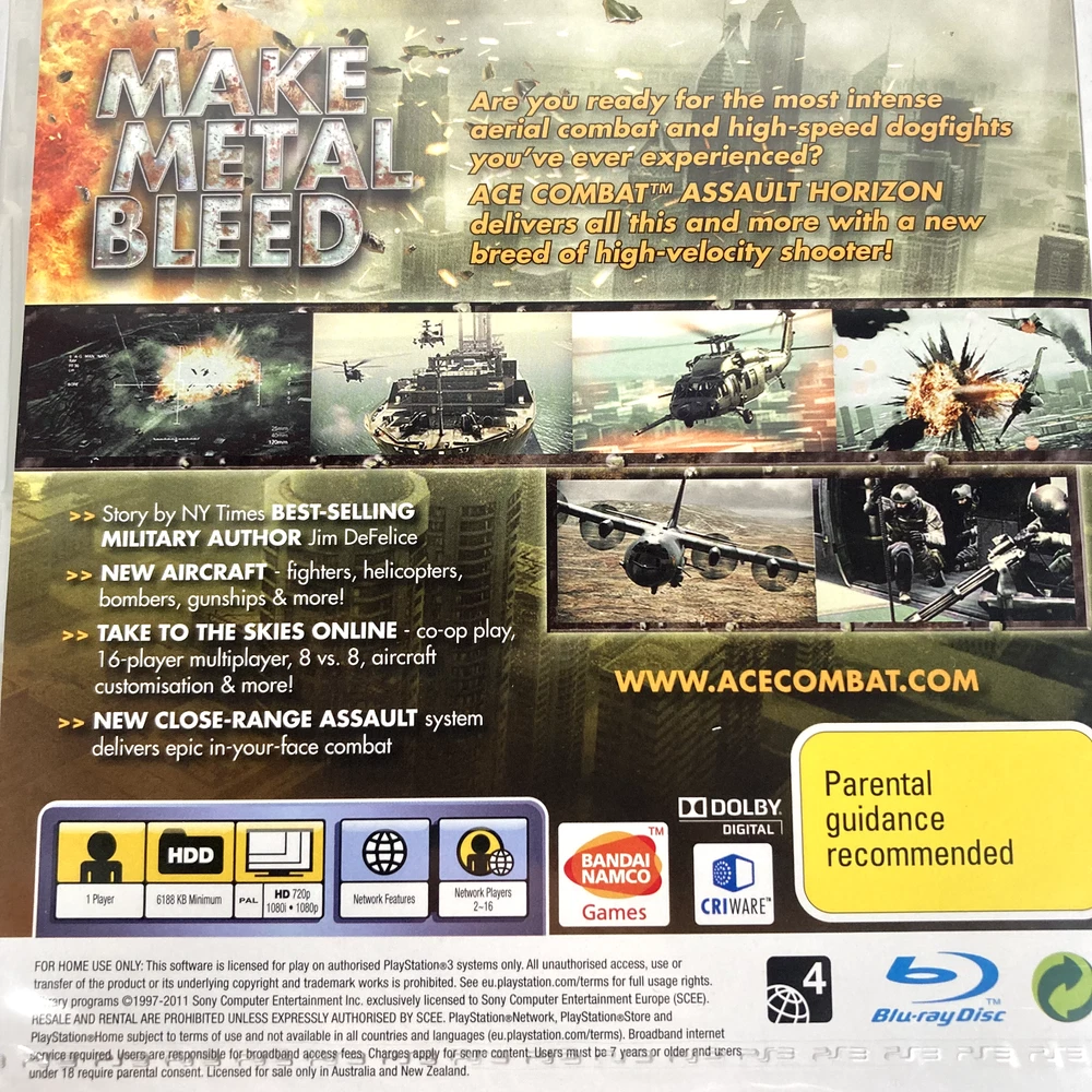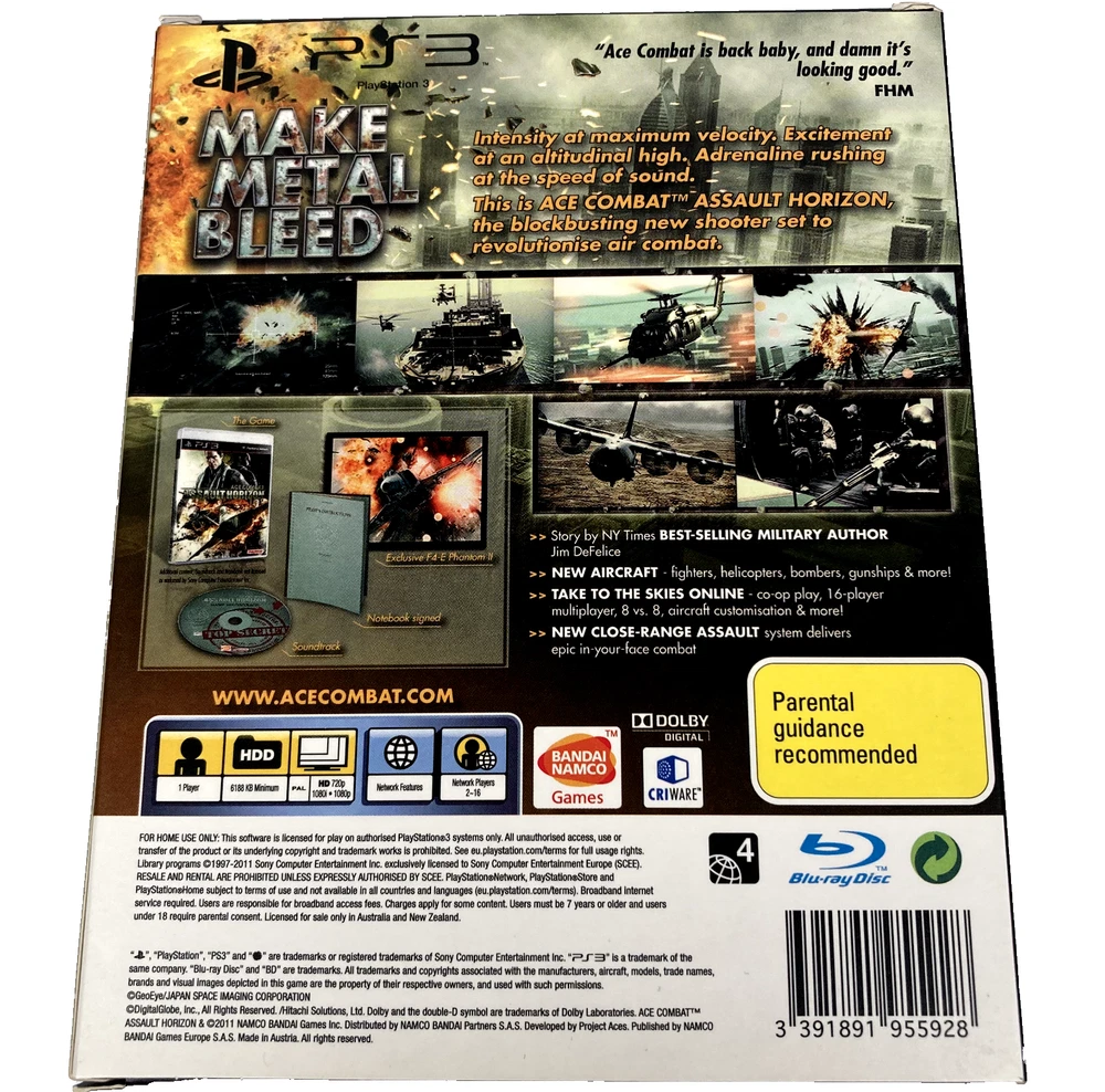 Ace Combat: Assault Horizon PlayStation 3 Limited Edition Box Cover PAL | 2011 | Region 4 Brand New & Factory Sealed Excellent Condition Box packaging in great condition. Never opened, game remains with factory seal complete. Only light surface marks on cellophane from storage. Very clean with nil noticeable major defects or imperfections to report on this item. Please look at all the photos for the condition of the goods listed. If you require more let us know. Ask any / all questions before making a purchase ! And we will endeavour to respond to your enquiry as soon as physically possible. Care will be taken to package your goods & items will be sent via Australia Post with tracking. Standard International shipping rates apply. We do combine shipping if required. If postage total is not automatically calculated at check-out , please send us a quick message before payment & we will send out an invoice. Failure to do this may result in full postage being charged & no discount. Majority of items currently being listed are from a collectors storage unit. Keep an eye out for more items being listed daily. Thank you for taking the time to look at our goods.