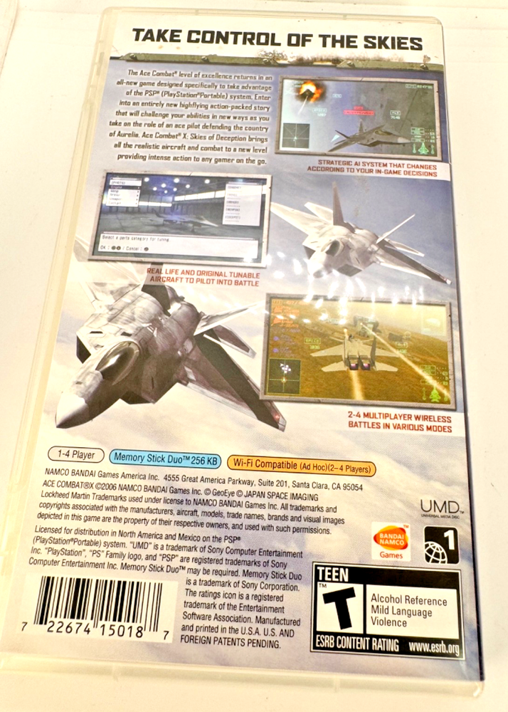 Ace Combat X Skies of Deceptio for Sony PSP is an action-packed video game in the Dog fighting series, specifically focusing on fighter jets. This officially licensed game includes the manual and is part of the complete edition, making it a comprehensive gaming experience. With a T-Teen rating, players can expect a mix of fighting, shooter, simulation, and strategy gameplay in this thrilling aerial combat simulation. Whether you enjoy battle, strategy, or survival horror, Ace Combat X Skies of Deceptio offers an immersive and exciting gaming experience for fans of the genre.
