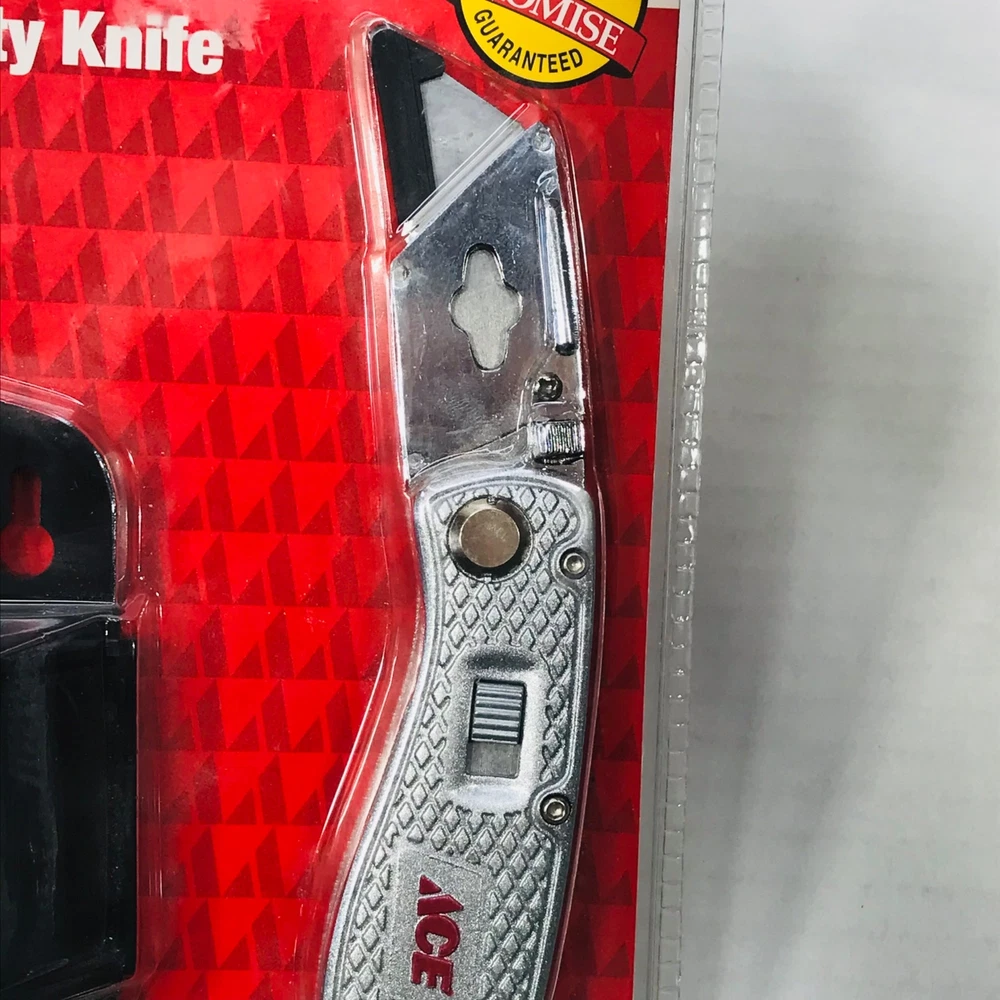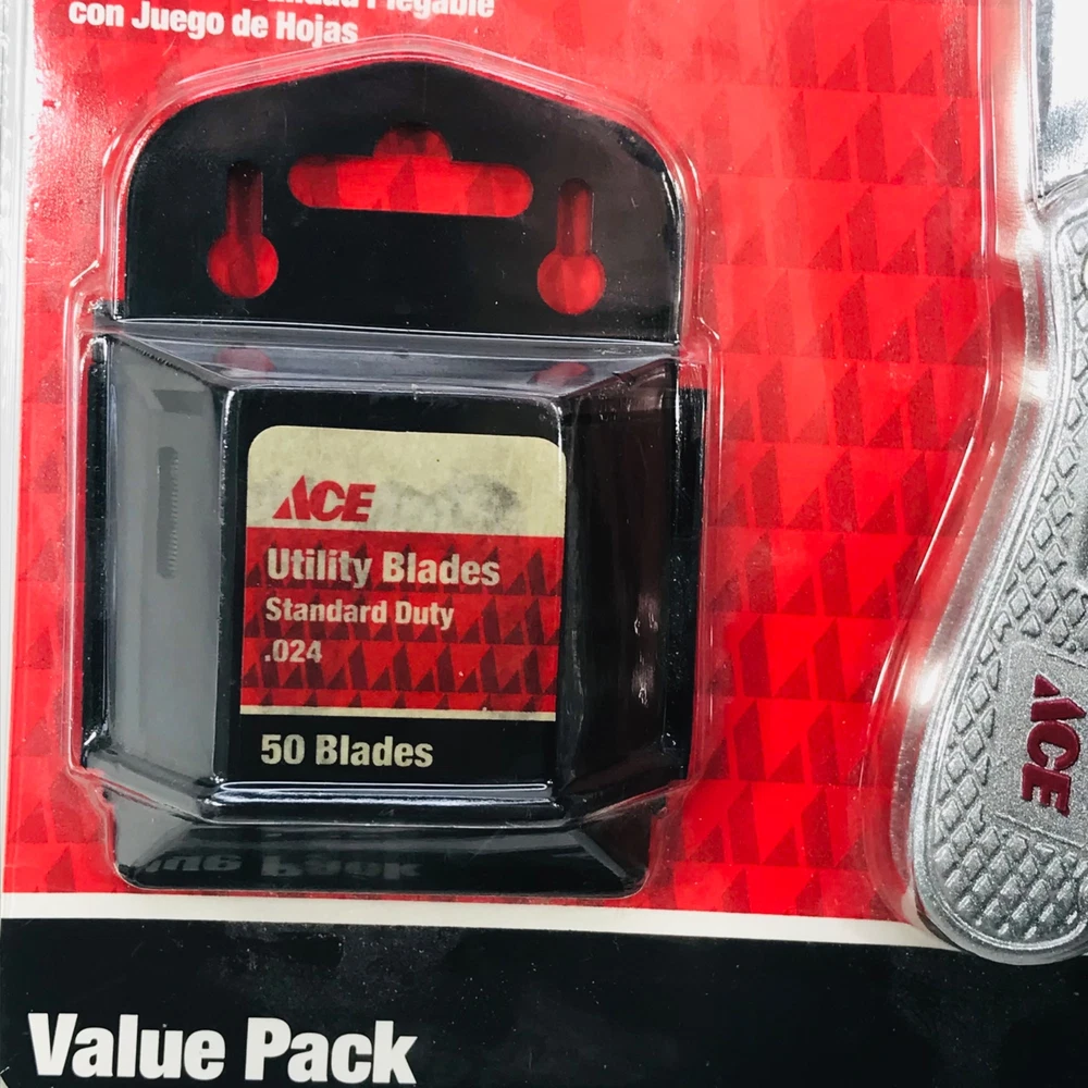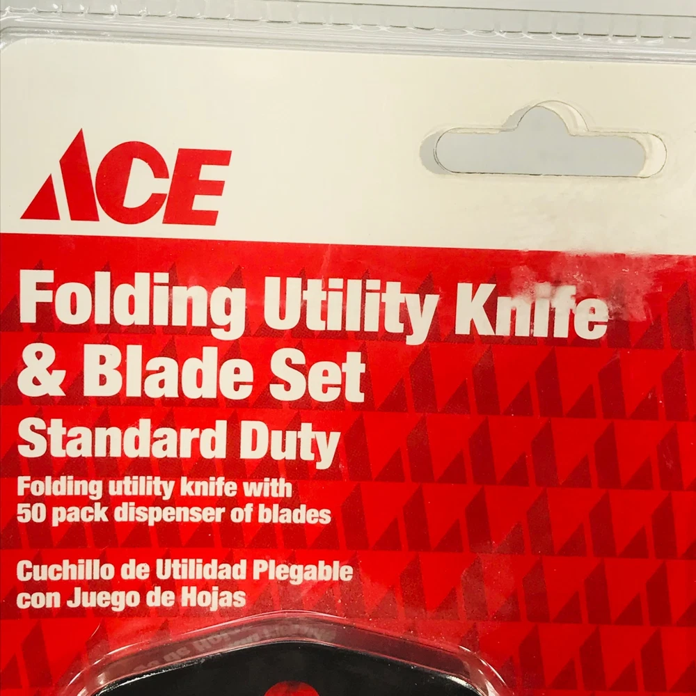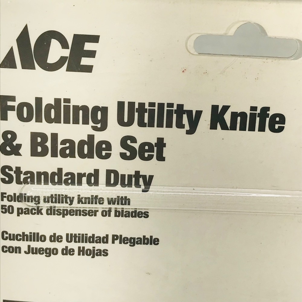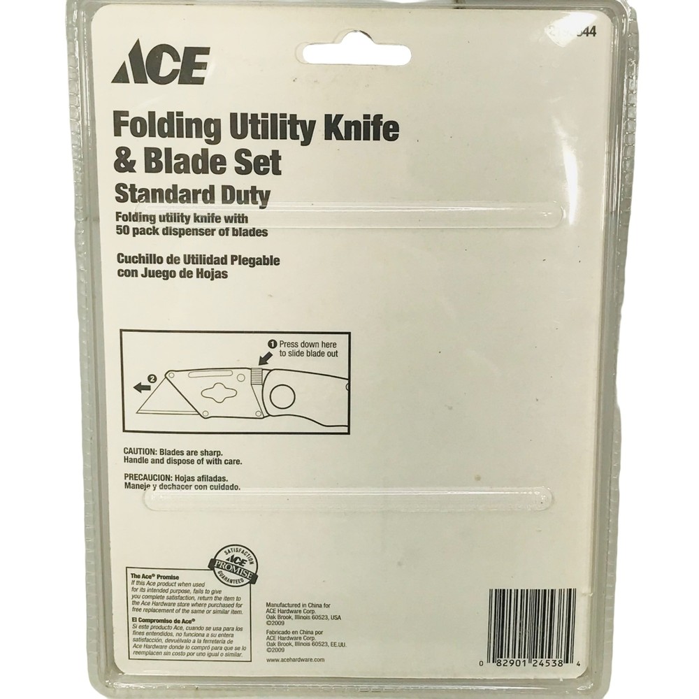 Ace Standard Duty Folding Utility Knife And 50 Blade Set New In Package Features: • New In Package • Standard Duty • Folding Utility Knife • 50 Additional Blades • Made in China Condition: New With Box New In Package 052-77 Smoke free home. Please let me know if you have any questions. Thank you.