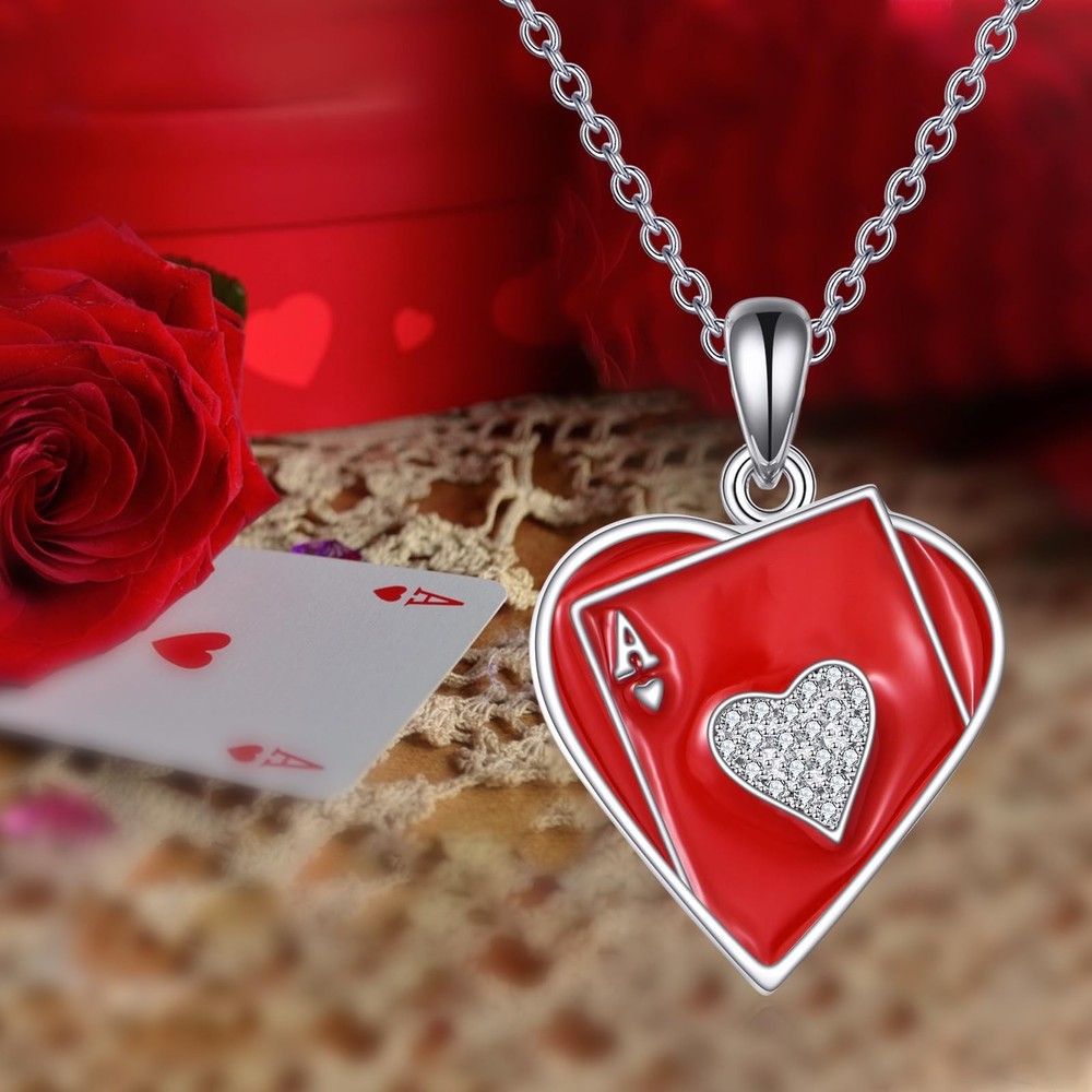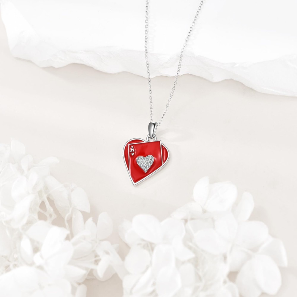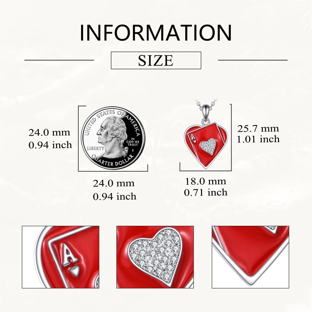 925 Sterling Silver Ace of Hearts Necklace The Cubic Zirconia adds a touch of elegance and femininity to the design. Contains: 1 x 925 Sterling Silver Ace Necklace(Chain & Pendant) 1 x elegant jewelry gift box Tips: 1.925 Sterling silver is very soft and fine metal, When not wearing,put it inside a soft cloth pocket or fabric swath, avoid it from rubbing against other jewelry 2.Rub your Jewelry with polishing cloth to bring back the shine. 3.Keep away from chemicals, sweat, bath, crash to avoid any damage. Unique Design: The card necklace features a delicate red ace of hearts as its centerpiece. The Poker Ace of hearts symbolizes the best and outstanding. It can not only bring you good luck in poker games, but also in life. Good Material: The card necklace is made of 925 sterling silver and cz, which is a high-quality and durable material. This ensures that the necklace will maintain its shine and beauty over time. Daily Wear: The ace of hearts necklace is 18inches with a 2inches adjustable chain. The combination of heart and cz heart make it a versatile piece of jewelry. It can be worn with both casual and formal outfits, adding a pop of color and elegance to your overall look. Ideal Gift: The ace jewelry comes in a beautiful gift box, adding an extra touch of elegance to the overall presentation. Perfect for any gift giving occasion. The playing card necklace can be worn by both men and women and can be given to anyone who is close to you. Care Instructions: After wearing, clean your plated jewelry with a cotton ball or a very soft cloth to remove any dust and dirt it has acquired. After cleaning, store in a soft cloth or jewelry box to avoid scratches.