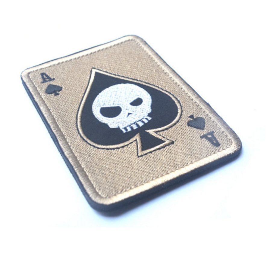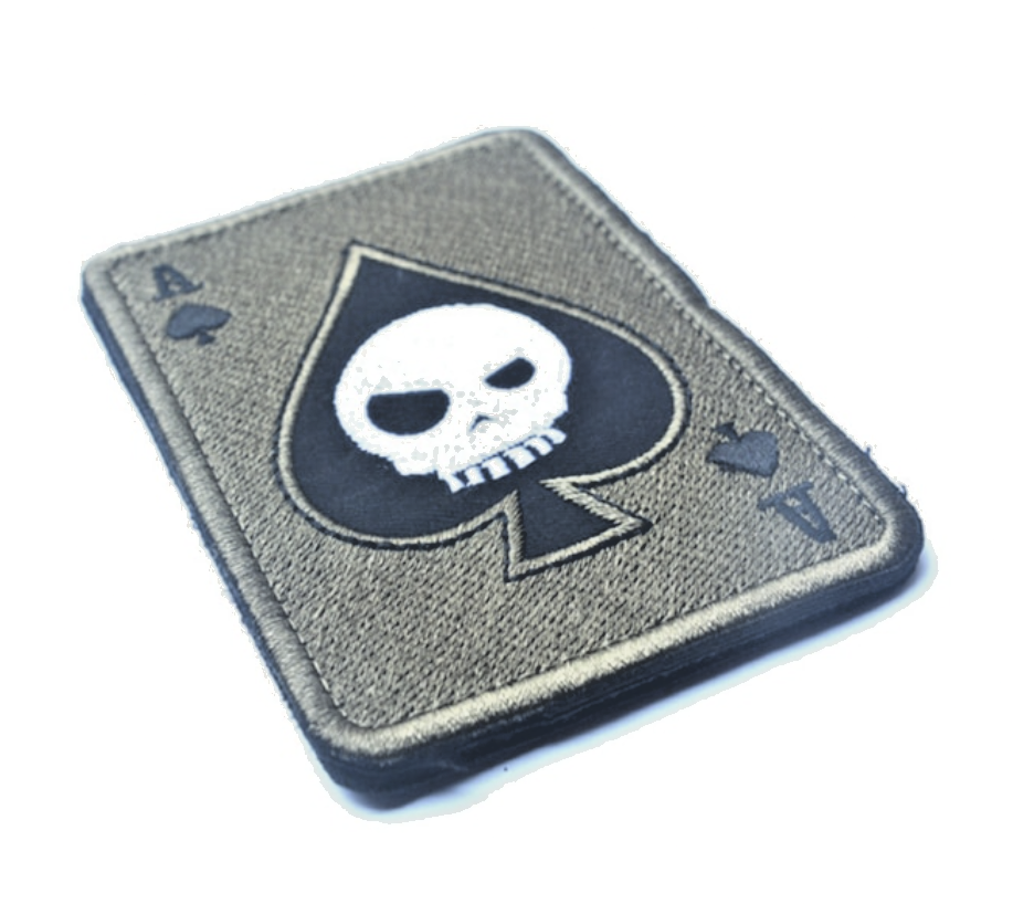 Embroidered Ace of Spades Skull Patch Cloth patch with Velcro fastening, measuring approx 10x7.5cm, Olive or Sand colours. Ideal for Military/Armed Forces (Army, Navy, Airforce, RAF, Royal Navy, Marines, Special Forces), Police, Security, Mecic/EMT, Cadets, Airsoft, paintball, Biker, travel. Application: Bags, Jackets, Uniform, Bergen, UBACS, Tactical and Combat gear, daysack, hat, helmet etc.