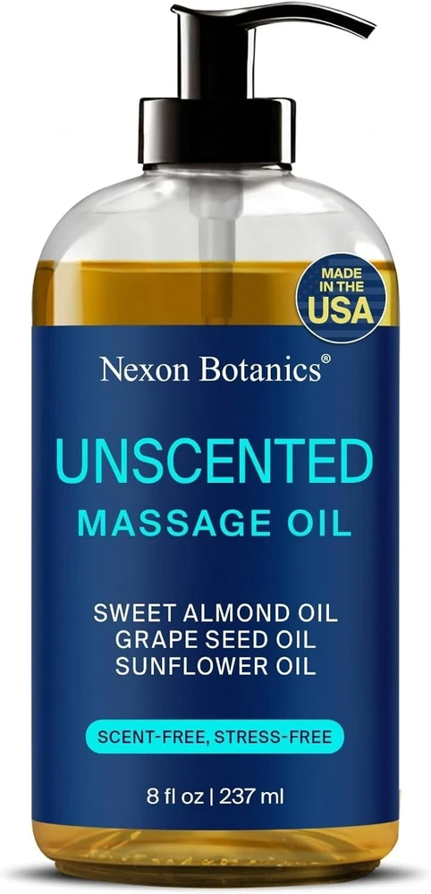 100% Natural Ingredients: Crafted with 100% natural Sweet Almond, Sunflower, and Grape Seed oils, this unscented massage oil offers a gentle, nourishing touch that’s perfect for all skin types, leaving your skin soft and smooth. Skin Nourishment & Muscle Relief: Beyond relaxation, this blend deeply nourishes and hydrates the skin while soothing tired muscles, making it the perfect choice for enhancing your massage and skincare routine. Suitable for All Skin Types: Formulated without parabens or any fragrances, this oil is ideal for sensitive skin, offering a pure massage experience without irritation or harmful chemicals. Perfect for post work-out massage. Lightweight & Absorbable: Designed with a lightweight, absorbable texture, this massage oil glides smoothly on the skin, making it easy to massage and absorb, without leaving a heavy residue High-Quality & Cruelty-Free: This massage oil is proudly non-GMO, hexane-free, and cruelty-free. Made with natural ingredients, it ensures a relaxing experience that aligns with eco-conscious values and responsible choices.
