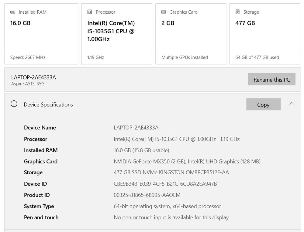 Acer Aspire 5 A515-55G-57H8, 15.6" Full HD IPS Display, 10th Gen Intel Core i5-1035G1, NVIDIA GeForce MX350, 16GB DDR4, 512GB NVMe SSD, Intel Wireless WiFi 6 AX201, Backlit KB, Windows 10 Home This laptop was upgraded from 8GB of memory to 16GB. I am the original owner. It was gently used. A second power brick is included (it was bought because the original power cord was too short). You will get both power cords/bricks, as pictured. It has dedicated graphics: NVIDIA GeForce MX350 Windows 10 Home was just reset/reinstalled. When you first turn it on, it will prompt you to complete the setup (ie. keyboard setting, network info, name that you want to use, etc.). This should be quick and guarantee it is personalized just for you. I believe you can upgrade it to Windows 11 for free using the Windows Update feature in the settings menu. If you need more information, please look up the model number to find out more details about it. Thank you!