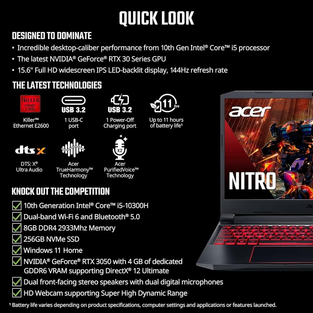This Acer Nitro is a powerhouse for gaming on the go! The 144Hz display is buttery smooth, and the i5 processor handles everything effortlessly. Even though we barely used it, it’s in flawless condition—like new, freshly reset, and ready to dominate. Perfect for anyone wanting high performance without the bulk. Includes laptop and charger—just plug and play!