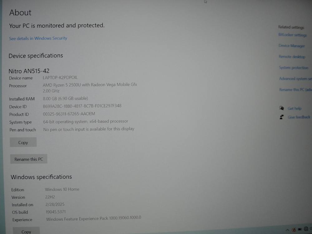 Acer Nitro 5 AN515-42-R5ED 15.6 β AMD Ryzen 5 2500U 2GHz 8GB HDD Reset 1TB- Charger included. π Ports: 1 Γ HDMI 1 Γ USB Type-C 1 Γ USB 3.0 2 Γ USB 2.0 RJ-45 (Ethernet) Combined audio jack (headphone/microphone) Key Features Brand: Acer Mod el: Nitro 5 AN515-42-R5ED Processo r: AMD Ryzen 5 2500U Processor Speed: 2GHz GPU: AMD Radeon RX 560X Memory Size: 8GB HDD Reset: 1TB Storage Type: HDD LCD: 1920*1080 15β Webcam: Yes Working Condition: Excellent Battery: Excellent Operating System: Windows 10Home Backlit keyboard: YES Note: Charger included. β¨ Acer Nitro 5 AN515-42-R5ED β¨ Acer Nitro 5 AN515-42-R5ED β a powerful gaming laptop with a sleek design and solid performance! This laptop is a perfect blend of style and performance, with minimal signs of use! Each laptop will be described externally at the end of the text, so please take note. Buy with confidence knowing that you are supporting a family business. β1 S/N: NHQ4TAA00183809FA53400 P/N: NH.Q4TAA.001 SNID: 83804086934 End date:2020-01-05 Operating System: Windows 10 Home HDD Reset 1TB Battery: Excellent π Cosmetic Condition: β Display is in excellent condition β no keyboard marks. β Top cover has some scuffs and scratches. β Bottom cover is in good condition. β Keyboard and touchpad are in good condition, with some shine from previous use. πΈ Check the photos for details! Happy online shopping! KS
