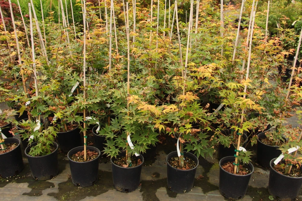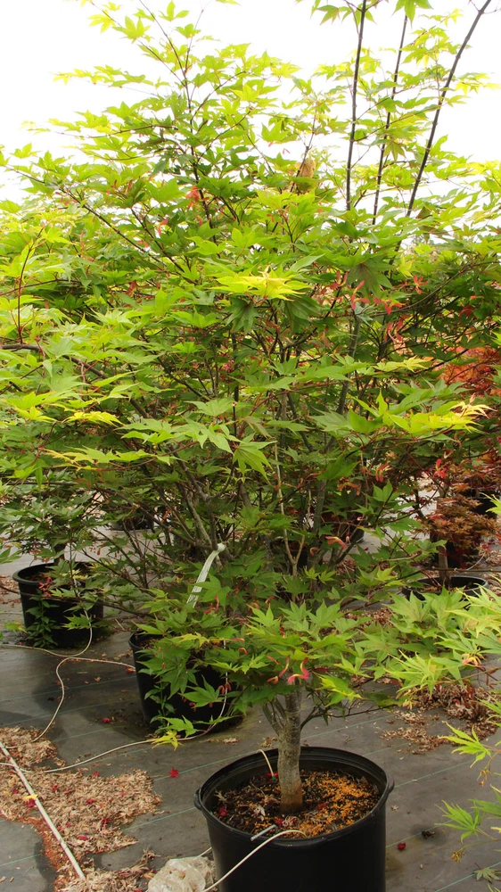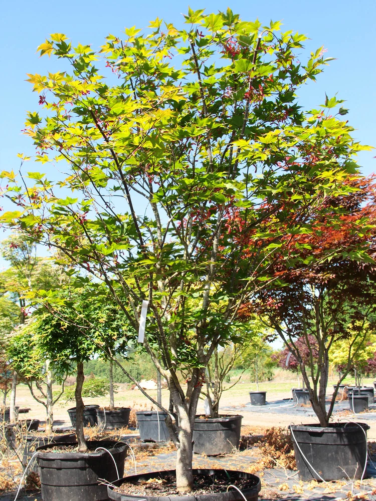 This item is grown and shipped in a standard trade #2 Container. The height of our potted plants may vary depending on their age and growth rate, so the actual size of the plant you receive might differ slightly from what is shown. For more details, please refer to our plant size policy on our store page. Acer palmatum 'Omato', commonly known as Omato Japanese Maple, is a stunning ornamental tree that adds elegance and vibrant color to any garden. This beautiful Japanese Maple is renowned for its large, deeply lobed leaves that emerge bright green in the spring, gradually transitioning to a rich, deep red in the fall, creating a spectacular display of seasonal color. Growing at a moderate rate, 'Omato' typically reaches a height of 10-15 feet with a similar spread, forming a graceful, rounded canopy. Its finely textured leaves and striking color changes make it an excellent choice as a focal point in garden beds, borders, or as a standout specimen in a small landscape. This Japanese Maple thrives in partial shade to full sun, performing best in well-draining, slightly acidic soil. It is well-suited to USDA hardiness zones 5-9 and appreciates consistent moisture, especially during dry periods. To keep its foliage vibrant and healthy, regular watering and mulching are recommended to maintain soil moisture and protect the roots from extreme temperatures. 'Omato' is an ideal choice for those looking to add a touch of classic Japanese elegance to their garden. Its vibrant foliage, graceful form, and moderate size make it a versatile addition to a variety of landscape settings, from traditional Japanese gardens to contemporary designs. Bring home Acer palmatum 'Omato' today and enjoy the beauty and serenity it brings to your outdoor space throughout the seasons.