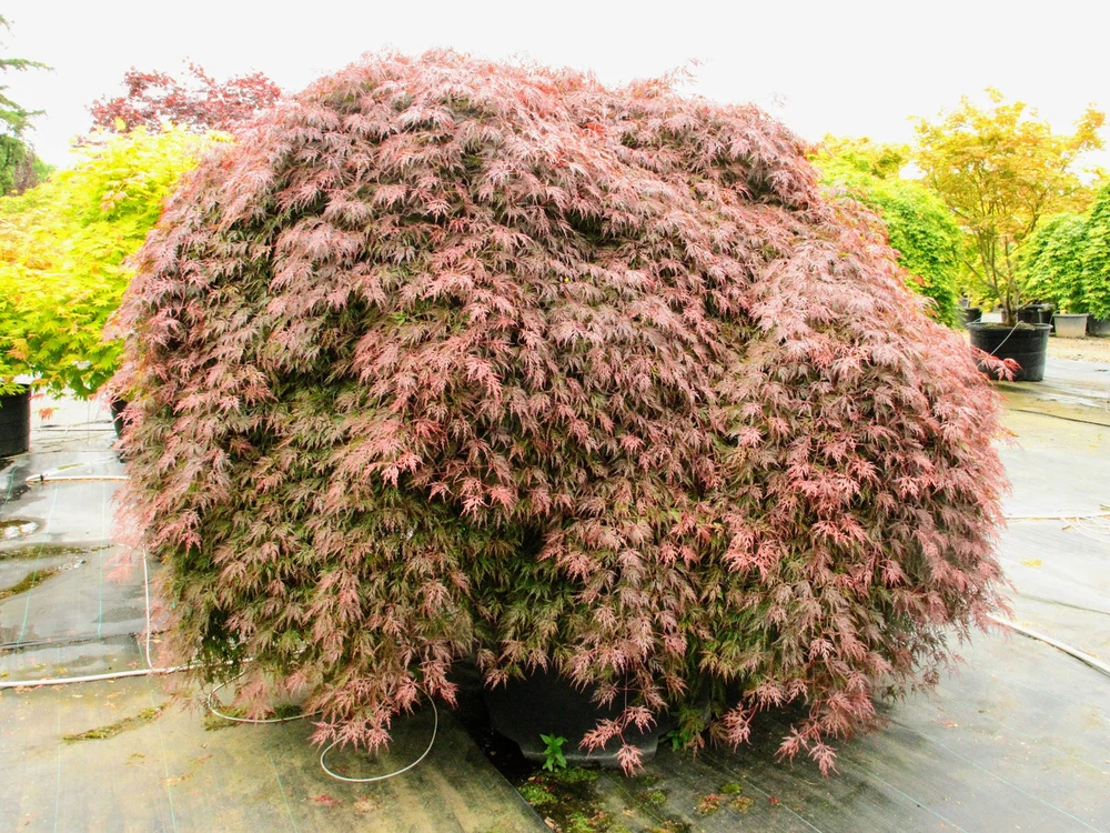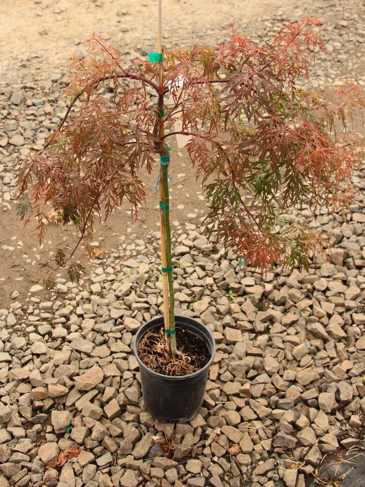 This item is grown and shipped in a standard trade size #1 Container, but grafted with standard rootstock to achieve a distinctive "lollipop" appearance. The height of our potted plants may vary depending on their age and growth rate, so the actual size of the plant you receive might differ slightly from what is shown. For more details, please refer to our plant size policy on our store page. Acer palmatum 'Orangeola' is a stunning dwarf laceleaf Japanese Maple known for its elegant, cascading form and vibrant, ever-changing foliage. This award-winning variety is perfect as a focal point in small gardens, containers, or as a striking addition to patios and decks. 'Orangeola' features delicate, lacy leaves with narrow, deeply serrated lobes. In spring, the glossy new leaves emerge in a bright orange-red, gradually softening to a burgundy-tinged green in summer. Midseason brings a second flush of orange-red leaves, creating a beautiful two-toned effect. In the fall, the entire tree lights up with vivid orange-red foliage, providing a spectacular display. This compact tree grows slowly to a height of about 4 feet and a spread of 5 feet over 10 years, making it ideal for small spaces. 'Orangeola' is more heat-resistant than other Japanese Maples, thriving in full sun to partial shade in USDA hardiness zones 5-9. It performs best in moist, well-draining, slightly acidic soil and requires regular watering, particularly in its early years and during dry spells. With its graceful, cascading habit and stunning seasonal color changes, 'Orangeola' is an excellent choice for creating a serene, visually appealing landscape. Pair it with complementary plants like dark green conifers or shade-loving perennials to enhance its beauty. Bring home Acer palmatum 'Orangeola' today and enjoy its delicate charm and vibrant colors in your garden for years to come.