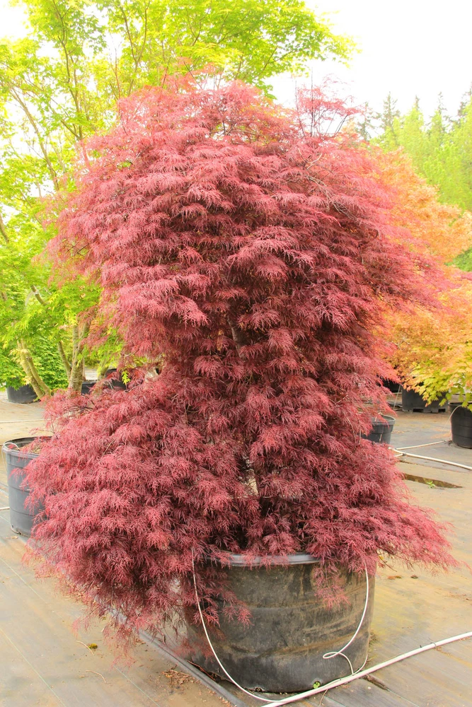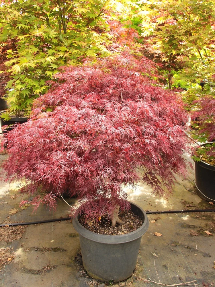 This item is grown and shipped in a standard trade #2 Container. The height of our potted plants may vary depending on their age and growth rate, so the actual size of the plant you receive might differ slightly from what is shown. For more details, please refer to our plant size policy on our store page. Acer palmatum 'Red Filigree Lace' is a stunning, slow-growing laceleaf Japanese Maple known for its incredibly fine, dissected foliage and elegant form. This variety is distinguished by its intricate, purple-red leaves that emerge in spring as a bright burgundy, maturing to a deep maroon in summer, and finally transitioning to a brilliant scarlet-red in fall, creating a dramatic display of color throughout the growing season. The extremely delicate appearance of its lacy leaves gives this tree a soft, graceful texture, but despite its refined look, 'Red Filigree Lace' is surprisingly hardy. It thrives best in partial shade, as full sun or drought conditions can lead to leaf burn. Over time, this variety develops into a low, cascading mound, similar in size and habit to other red laceleaf varieties, though it grows more slowly than most, making it a fantastic choice for smaller gardens or container planting. Perfect for USDA zones 5-9, this Japanese Maple prefers well-drained, slightly acidic soil and does well in both garden beds and containers. Its weeping form and finely-cut leaves make it an ideal choice for adding delicate texture and elegance to Japanese gardens, rockeries, or as a specimen plant in shaded spots. Whether planted as a standalone feature or used in a mixed border, Acer palmatum 'Red Filigree Lace' brings an air of refinement and lasting beauty to any landscape, rewarding gardeners with its ever-changing foliage and graceful form. Introduce this beautiful maple to your garden today and enjoy its rich colors and exquisite texture year-round.