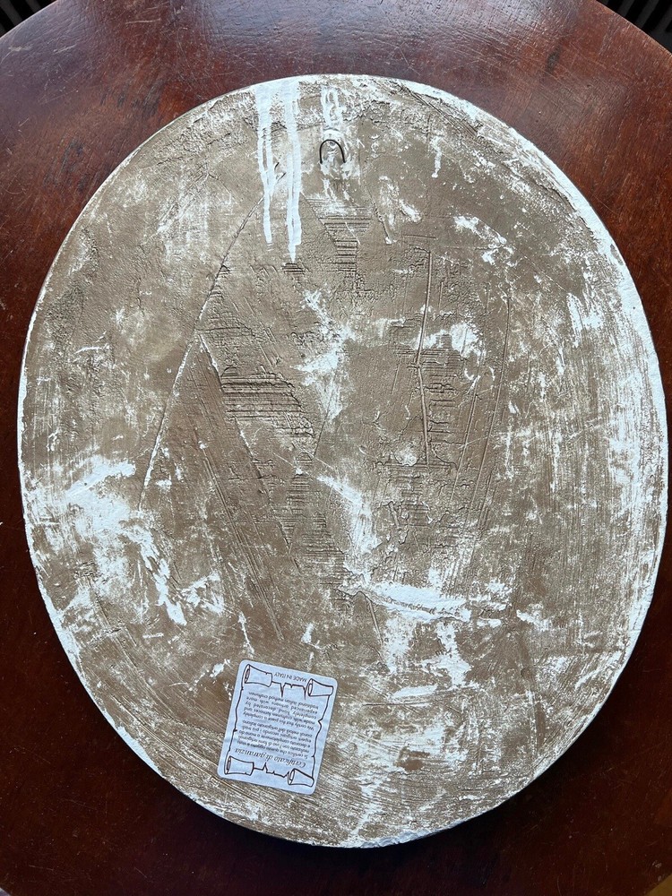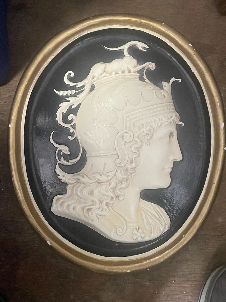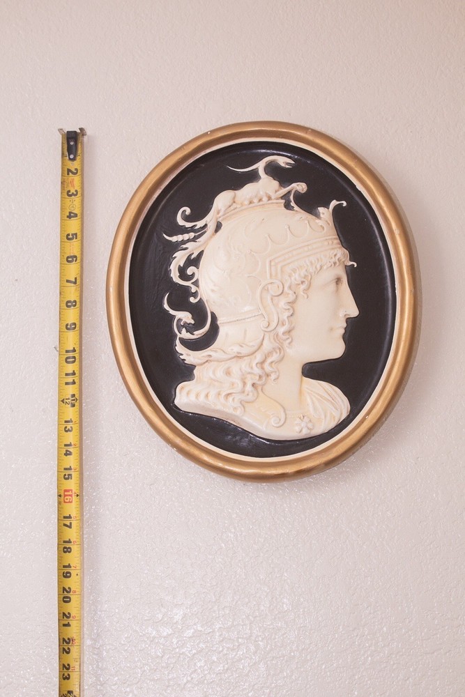 MADE IN ITALY!!!! vtg 15.5" Athena and Aries or Achilles??? Achilles Athena Greek Roman dragon Wall Plaque Italy 1950s Hollywood Regency Cameo Chalkware Oval Baroque Mid Century Modern. No touch ups AS IS PLEASE INSPECT THEM. Very nicely designed and detailed. this is either Achilles or Athena. Size is 15.5 x 13. These are heavy pieces . 6lbs each . Please be aware of shipping. There are minor flaws around the frame BUT NOTHING A GOOD paint won’t fix.