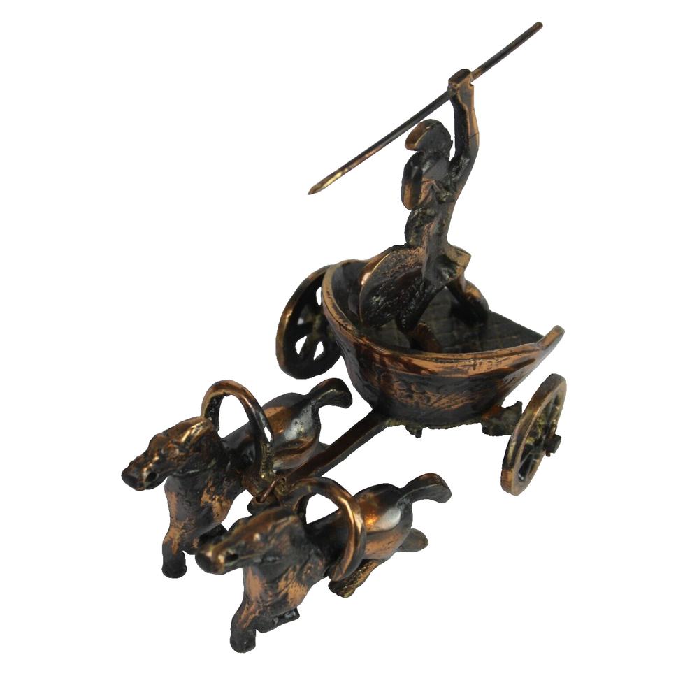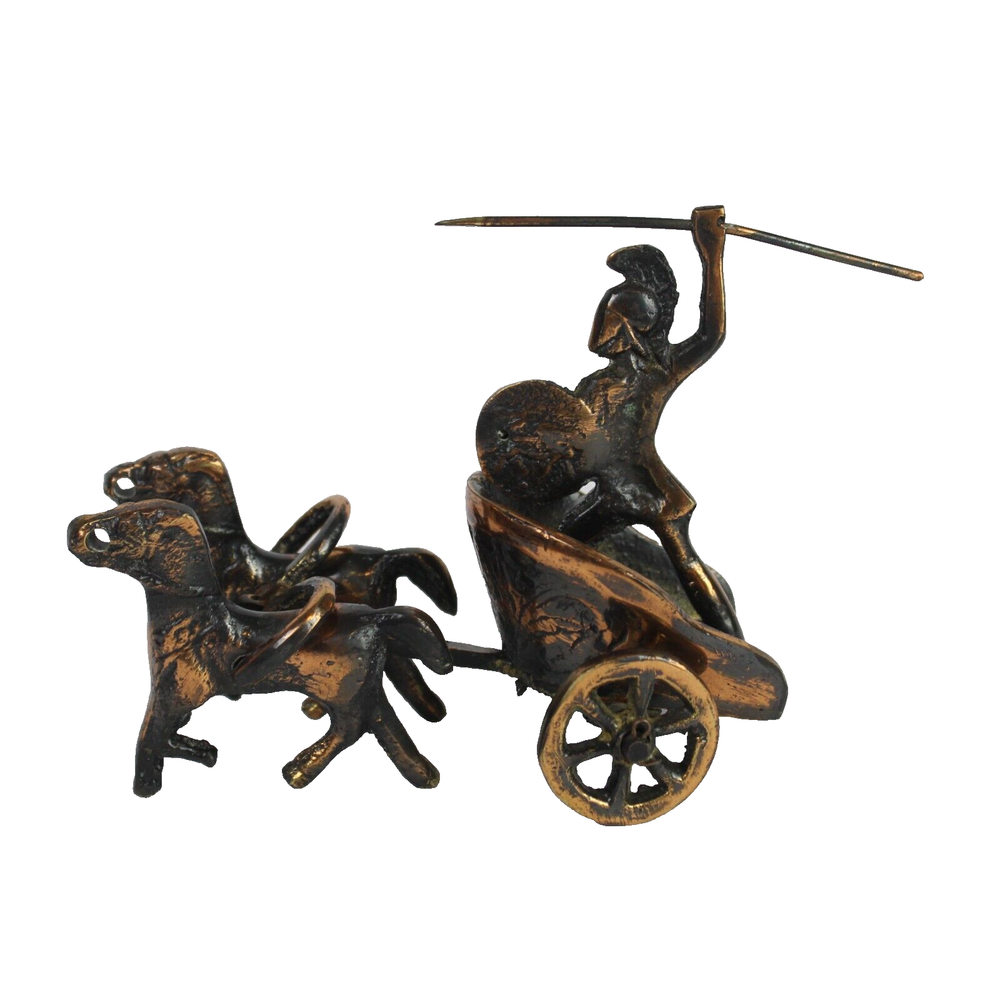 Achilles Chariot - Ancient Greek Warrior with Spear Sculpture appears to be bronze (reddish-brown appearance, heavy weight, non-magnetic) Features: Rolling wheels secured to axle with cotter pins, horses pivot FLAW: Missing chain Approximate Size: Length: 5 inches Width: 3 inches Height: 4 inches Weight: 15.7 ounces Visit our store to see discount specials and view more items for your home, family and friends. _____________________________________ Questions? Please contact us. Our goal is happy customers with purchases they love. Thank you for shopping with QTP Sales! Return Policy - Items must be returned in original condition. A deduction to the refund amount may be incurred if item is returned with damage, signs of use or wear, missing parts or tags, with broken seal or other that reduces the value of the item.