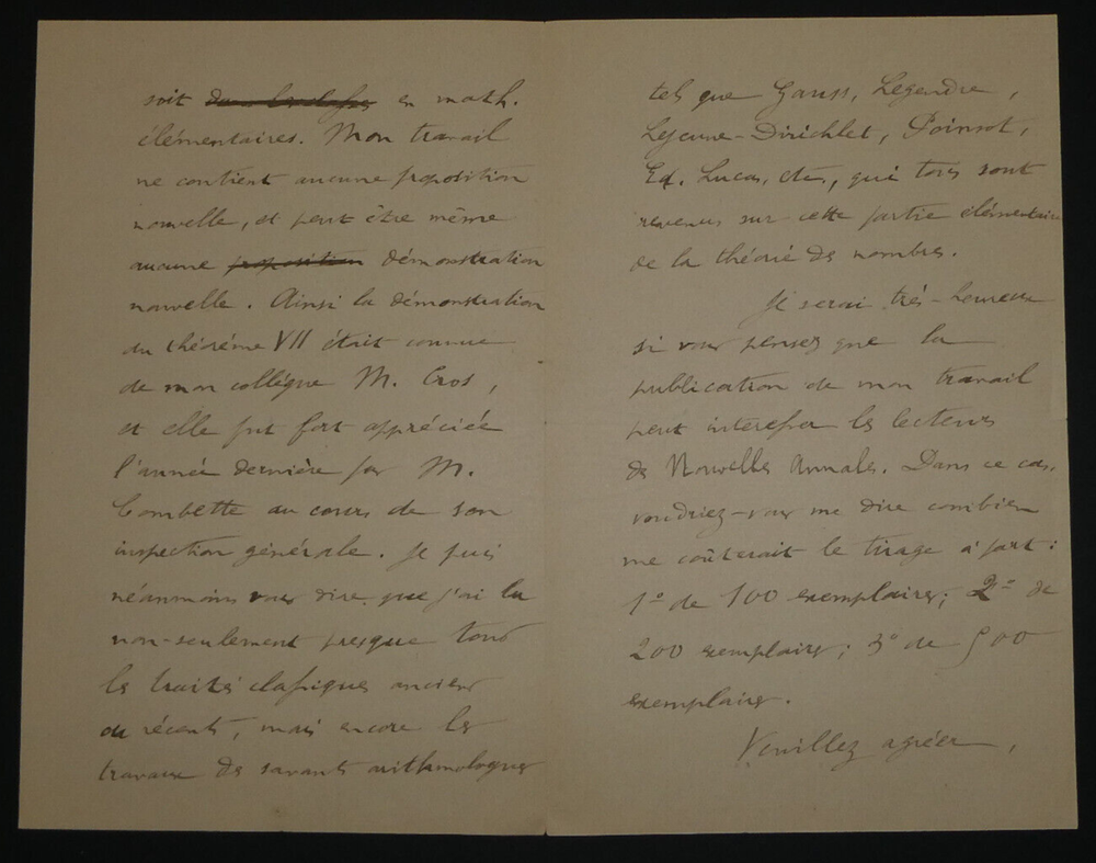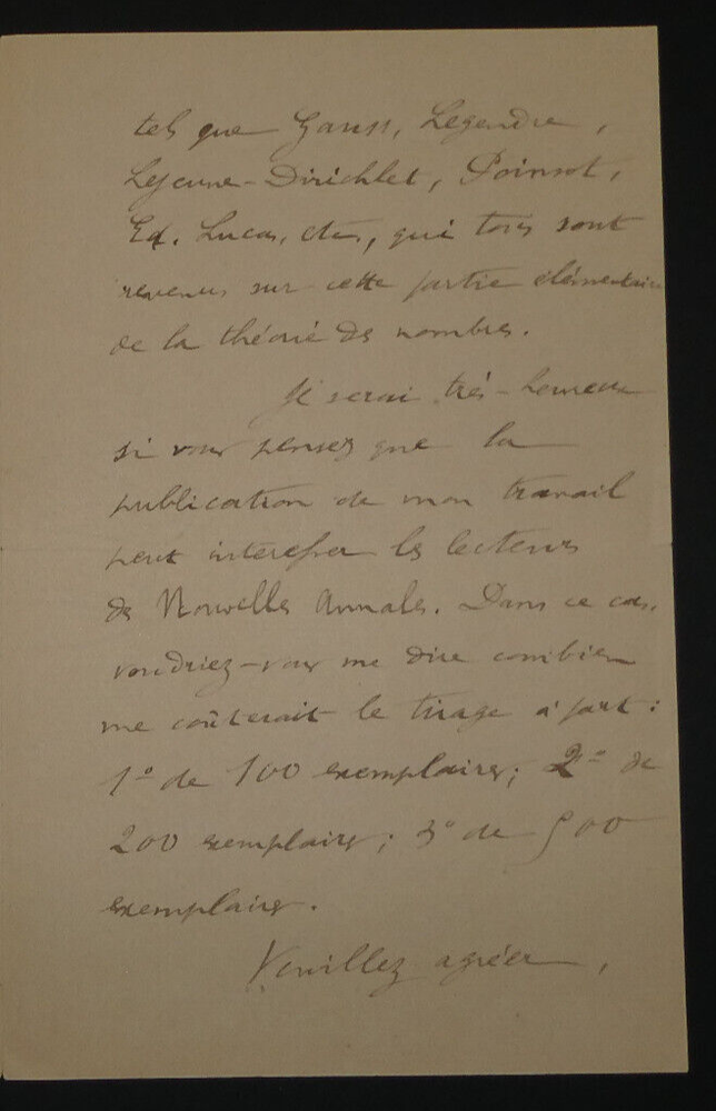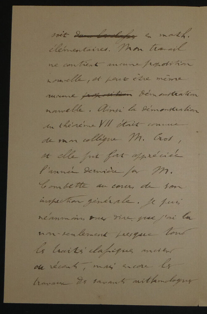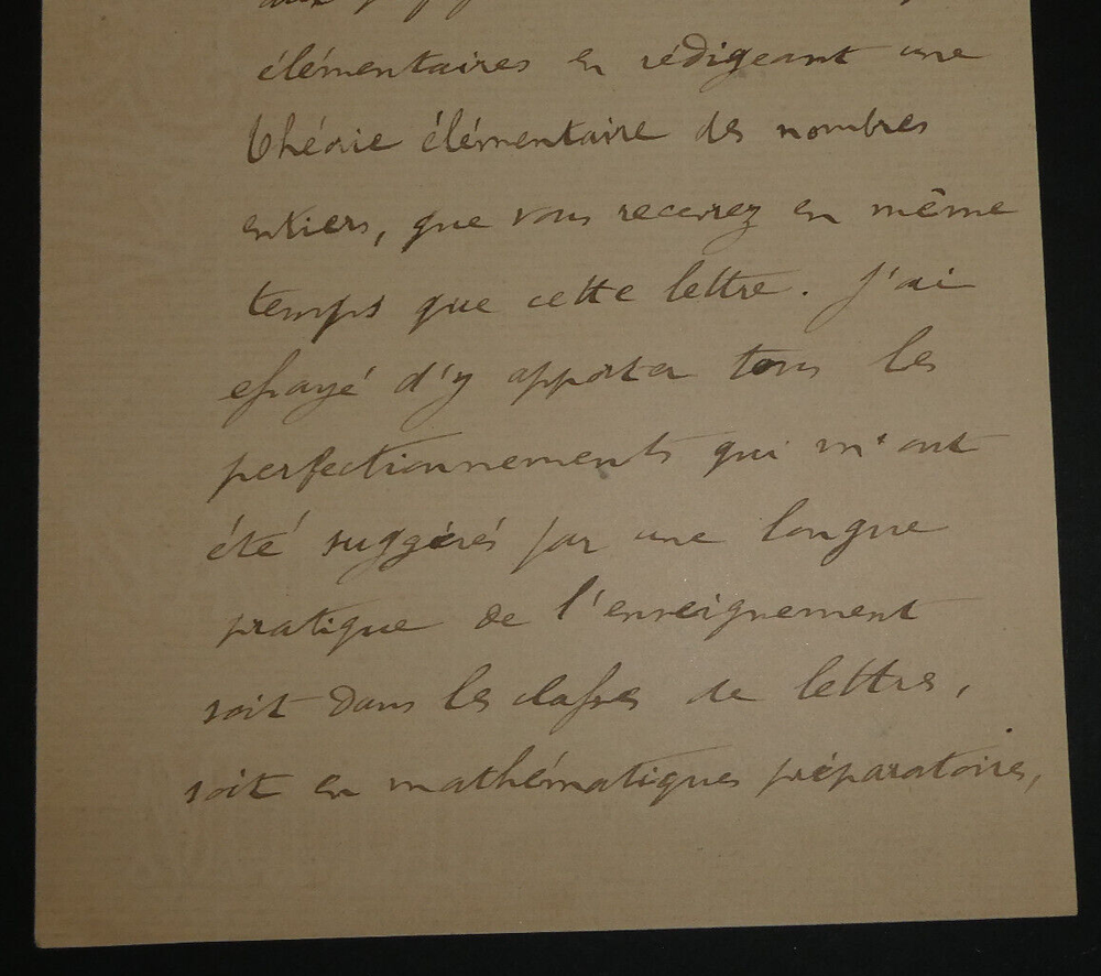 Lettre autographe signée de [Achille] GOULARD en date du 8 janvier 1896. Lettre de 4 pages dans laquelle il est question d'une théorie élémentaire qu'il a rédigé pour les professeurs de mathématiques. État: Voir photos pour plus de détails. Dimensions : 11,5 x 18 cm. 4 pages. Charles-Ange Laisant, né le 1ᵉʳ novembre 1841 à Indre, mort le 5 mai 1920 à Asnières-sur-Seine, est un militaire, un mathématicien et un homme politique français républicain radical, espérantiste, ... Wikipédia Envoi soigné dans un emballage rigide et étanche. Satisfait ou remboursé. Si vous n'êtes pas entièrement satisfait, je reprends la marchandise avec retour à ma charge pour l'Europe et à la charge de l'acheteur pour le reste du monde. N’hésitez pas à visiter ma boutique et affiner vos recherches en fonction des catégories qui vous intéressent. Ma boutique L'Art Délivré. Lettres autographes, vieux papiers, livres anciens, photographies, gravures, timbres… Nous expertisons et/ou rachetons dans toute la France vos lettres, collections de lettres et livres anciens. Merci de votre visite. Jérôme KAYSER. Lettre de 4 pages dans laquelle il est question d'une théorie élémentaire qu'il a rédigé pour les professeurs de mathématiques. Charles-Ange Laisant, né le 1ᵉʳ novembre 1841 à Indre, mort le 5 mai 1920 à Asnières-sur-Seine, est un militaire, un mathématicien et un homme politique français républicain radical, espérantiste, ... Wikipédia Si vous n'êtes pas entièrement satisfait, je reprends la marchandise avec retour à ma charge pour l'Europe et à la charge de l'acheteur pour le reste du monde. N’hésitez pas à visiter ma boutique et affiner vos recherches en fonction des catégories qui vous intéressent. Ma boutique Lettres autographes, vieux papiers, livres anciens, photographies, gravures, timbres… Nous expertisons et/ou rachetons dans toute la France vos lettres, collections de lettres e