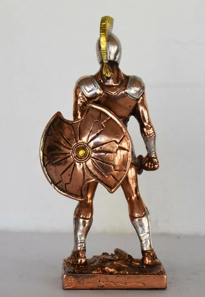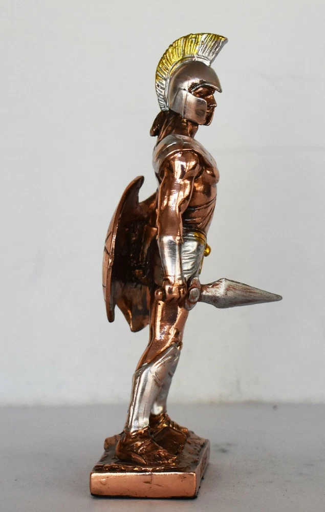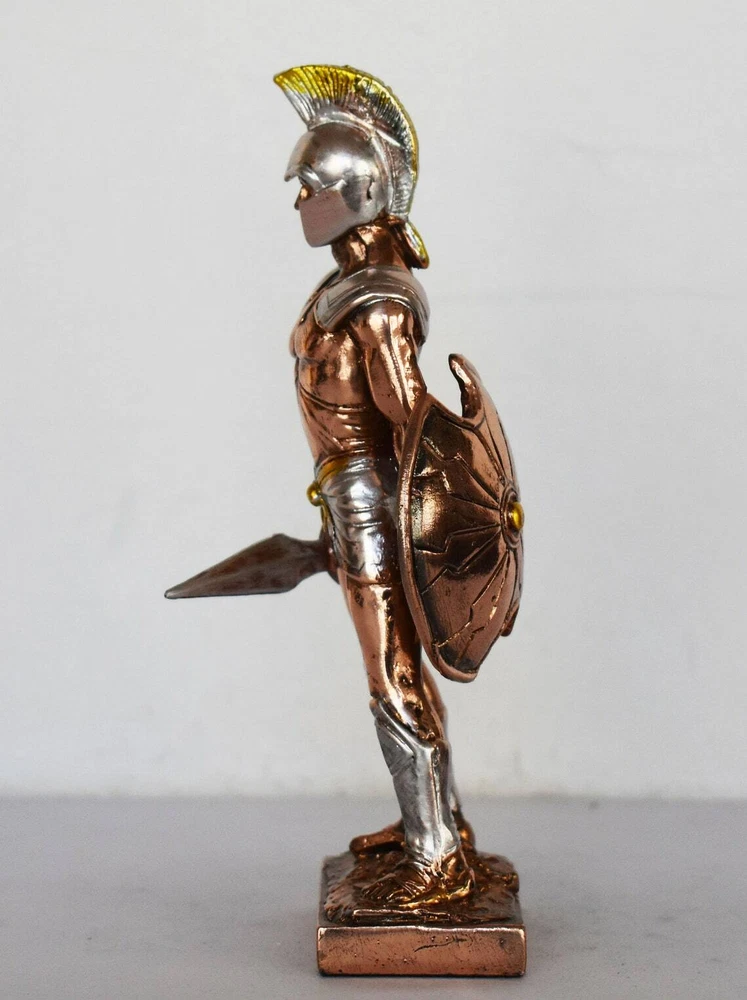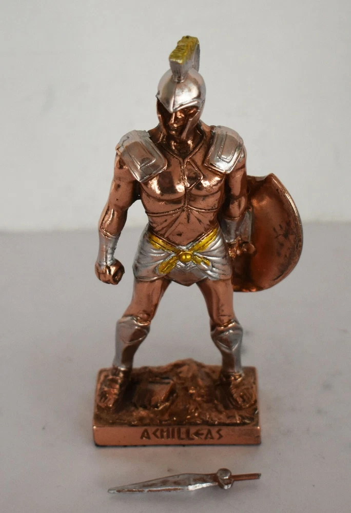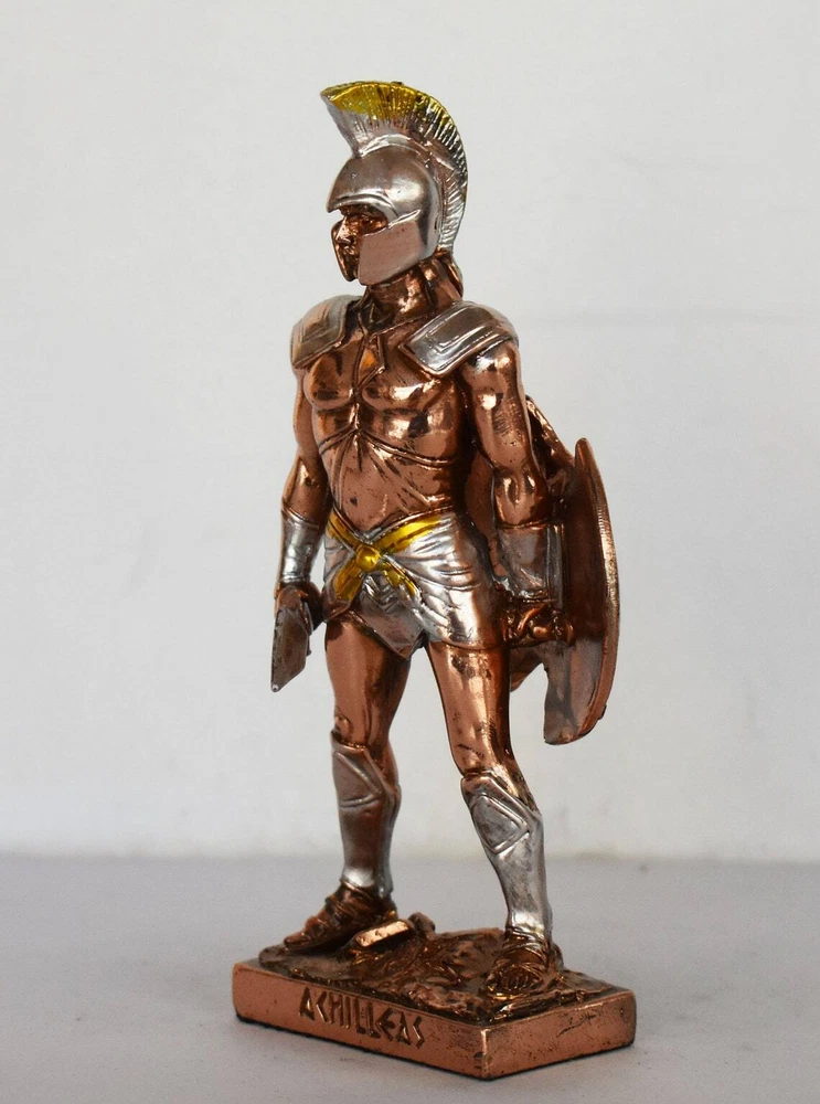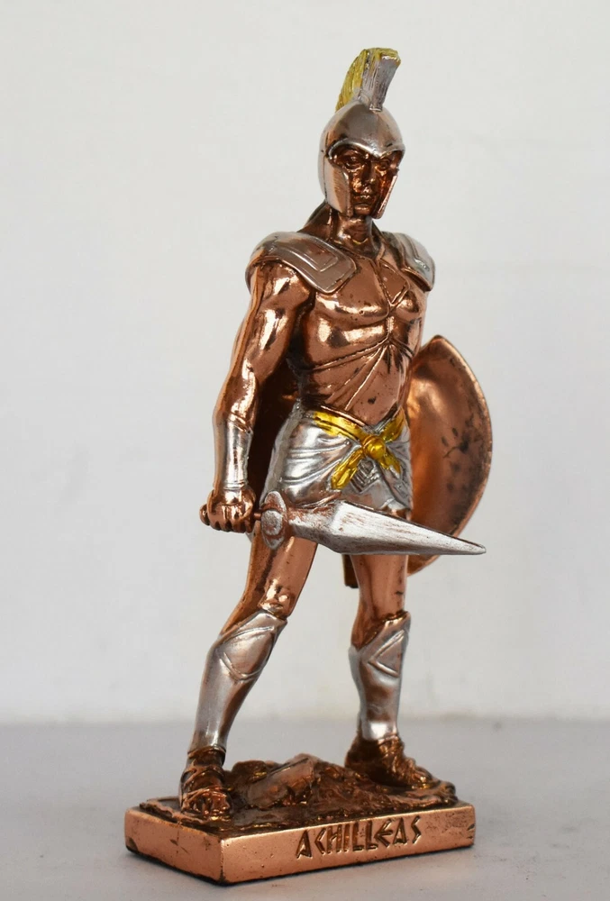 Achilles - King of the Myrmidons - Greek Hero - Son of Thetis and Peleus - Trojan War - Homer's Iliad - Copper Plated Alabaster Details: Condition: New Material: Copper Plated Alabaster Height: 15,5 cm - 6,1 inches Width: 6 cm - 2,4 inches Length: 3,5 cm - 1,4 inches Weight: 150 g In Greek mythology, Achilles was a hero of the Trojan War, the greatest of all the Greek warriors, and is the central character of Homer's Iliad. He was the son of the Nereid Thetis and Peleus, king of Phthia. Achilles' most notable feat during the Trojan War was the slaying of the Trojan prince Hector outside the gates of Troy. Although the death of Achilles is not presented in the Iliad, other sources concur that he was killed near the end of the Trojan War by Paris, who shot him in the heel with an arrow. Later legends (beginning with Statius' unfinished epic Achilleid, written in the 1st century AD) state that Achilles was invulnerable in all of his body except for one heel, because when his mother Thetis dipped him in the river Styx as an infant, she held him by one of his heels. Alluding to these legends, the term "Achilles' heel" has come to mean a point of weakness, especially in someone or something with an otherwise strong constitution. The Achilles tendon is also named after him due to these legends. RC 354 AXIΛΛΕΥΣ - 7,1 *********************