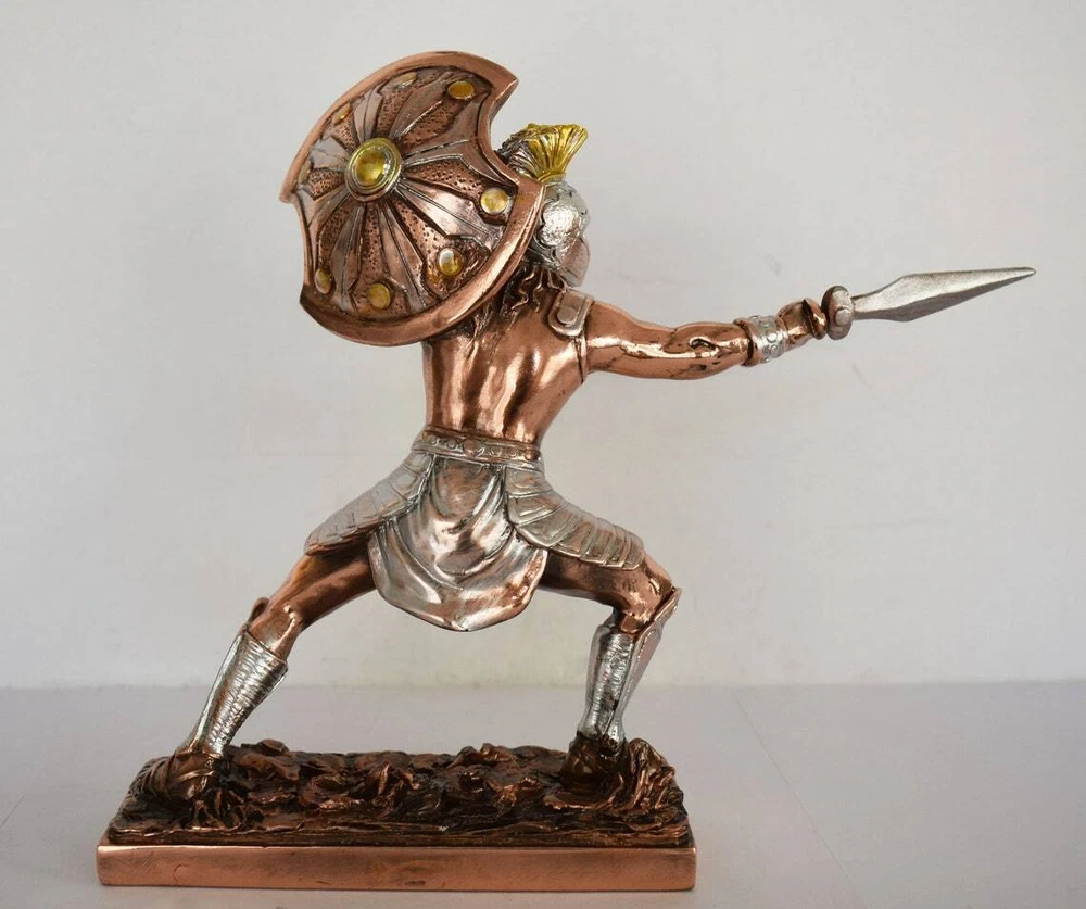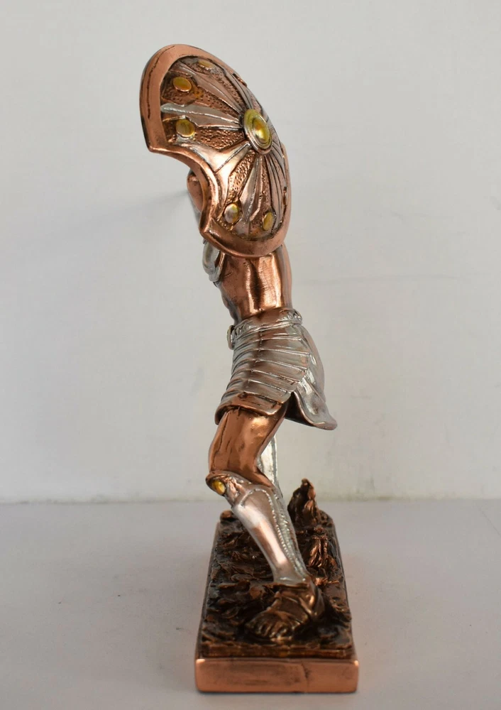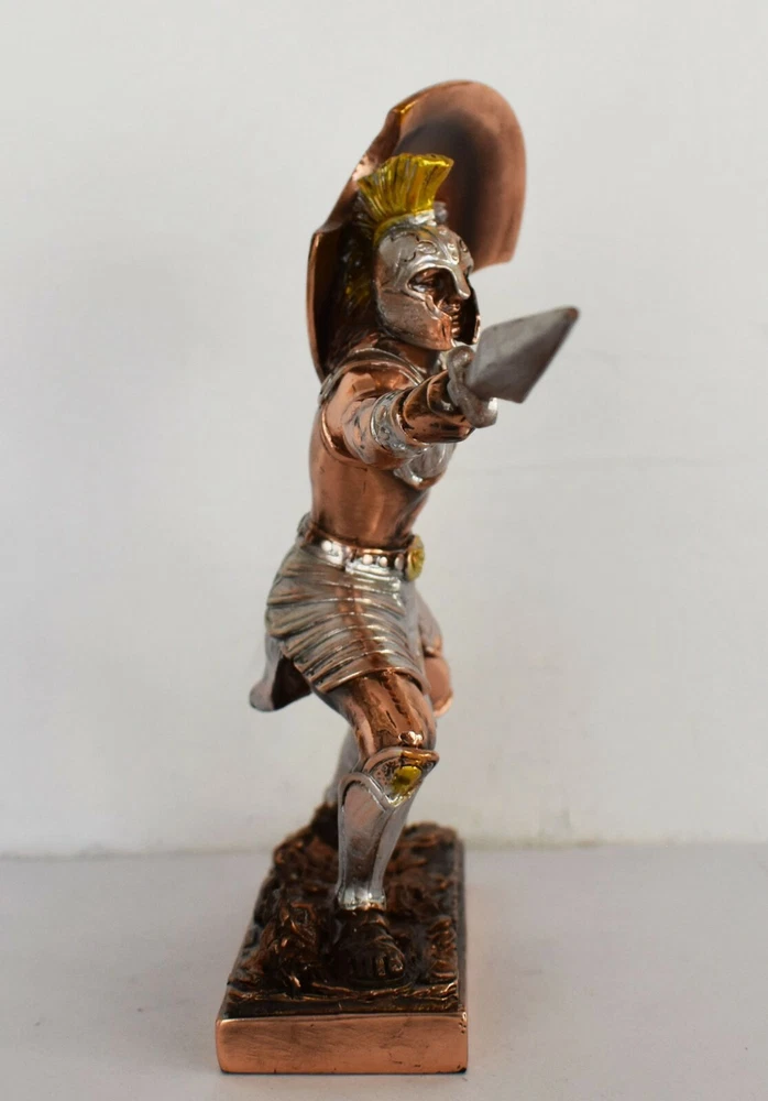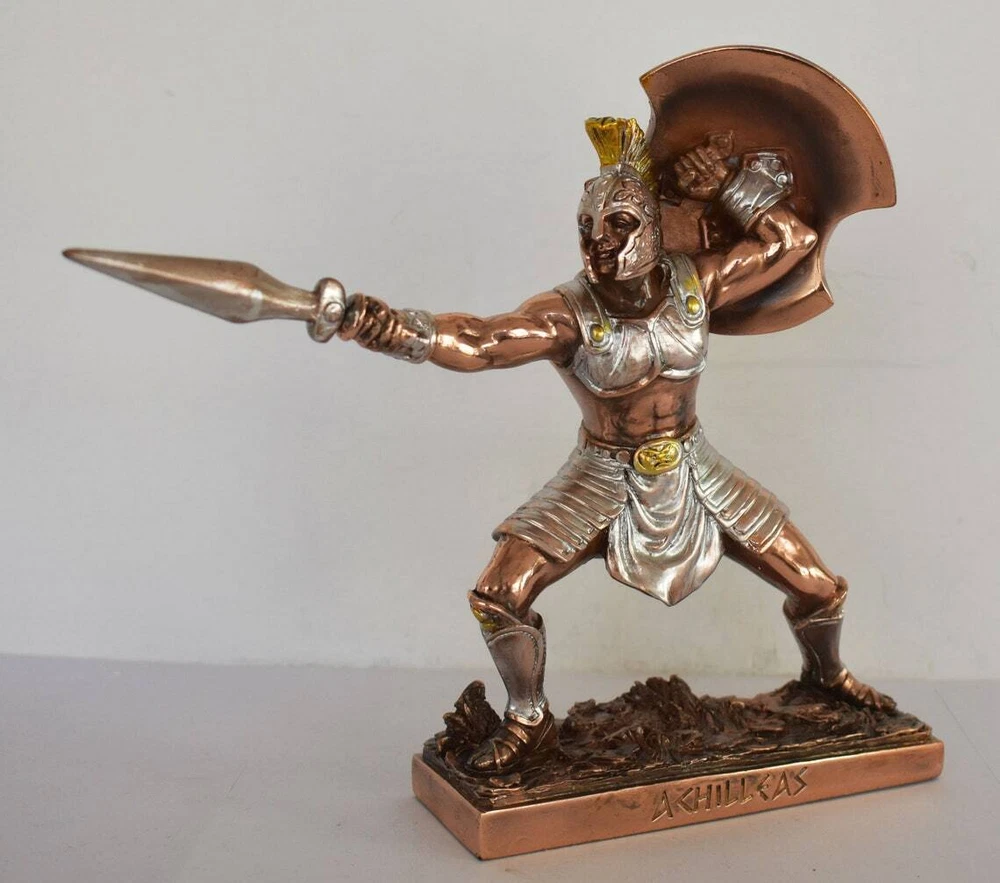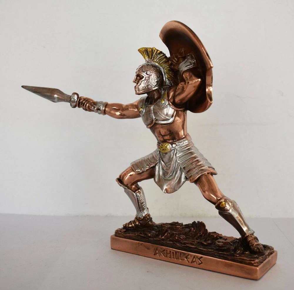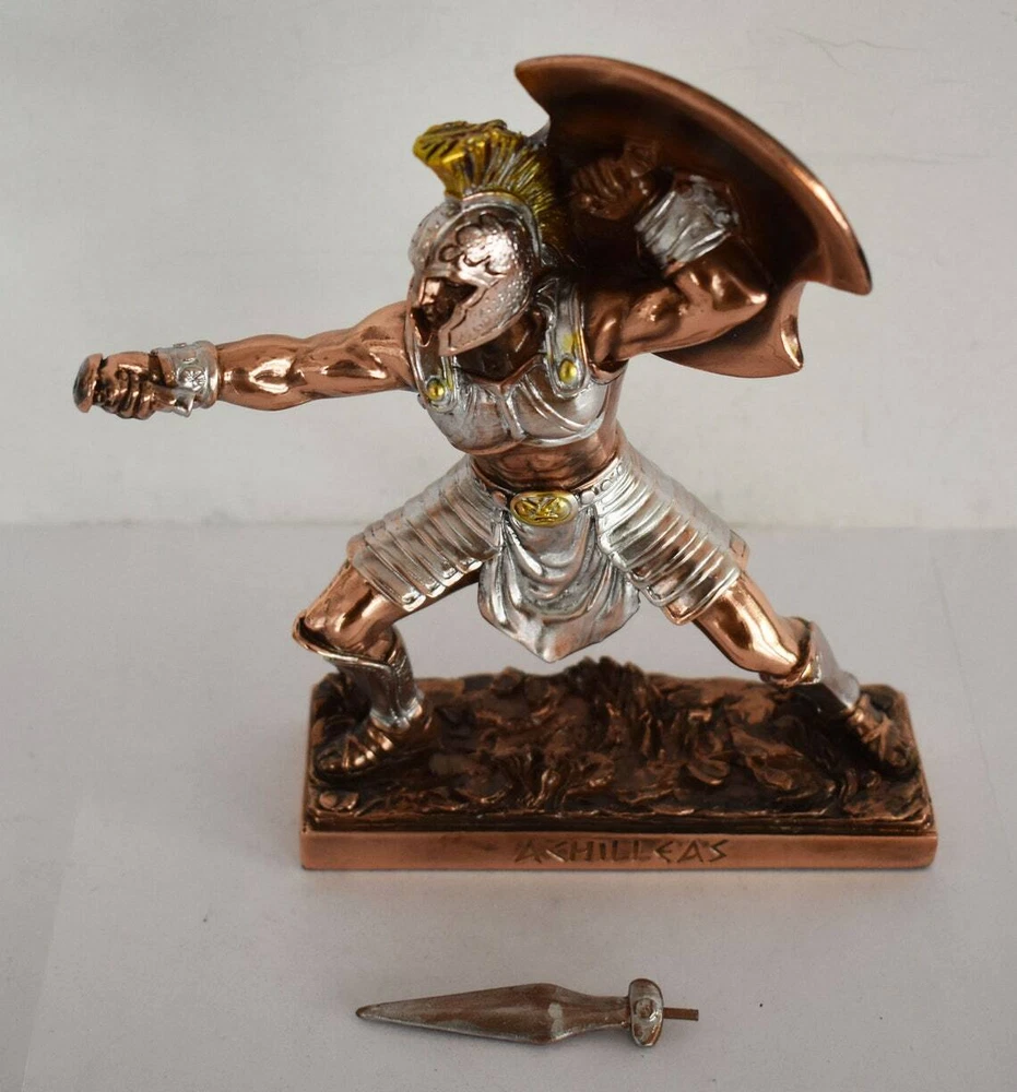Achilles - King of the Myrmidons - Greek Hero - Son of Thetis and Peleus - Trojan War - Homer's Iliad - Copper Plated Alabaster Details: Condition: New Material: Copper Plated Alabaster Height: 20 cm - 7,9 inches Width: 18 cm - 7,1 inches Length: 5 cm - 2 inches Weight: 520 g In Greek mythology, Achilles was a hero of the Trojan War, the greatest of all the Greek warriors, and is the central character of Homer's Iliad. He was the son of the Nereid Thetis and Peleus, king of Phthia. Achilles' most notable feat during the Trojan War was the slaying of the Trojan prince Hector outside the gates of Troy. Although the death of Achilles is not presented in the Iliad, other sources concur that he was killed near the end of the Trojan War by Paris, who shot him in the heel with an arrow. Later legends (beginning with Statius' unfinished epic Achilleid, written in the 1st century AD) state that Achilles was invulnerable in all of his body except for one heel, because when his mother Thetis dipped him in the river Styx as an infant, she held him by one of his heels. Alluding to these legends, the term "Achilles' heel" has come to mean a point of weakness, especially in someone or something with an otherwise strong constitution. The Achilles tendon is also named after him due to these legends. RC 363 AXIΛΛΕΥΣ - 16 *********************