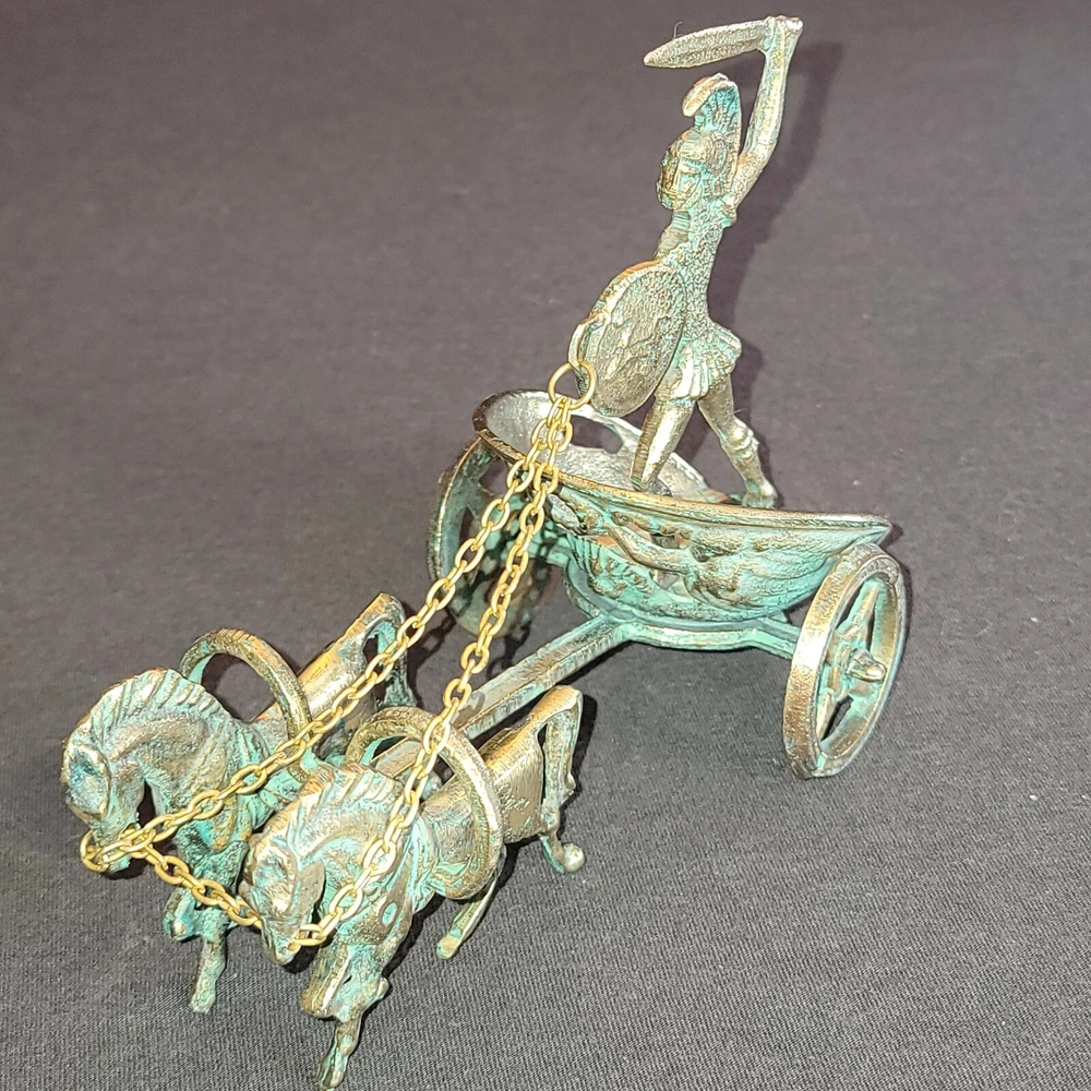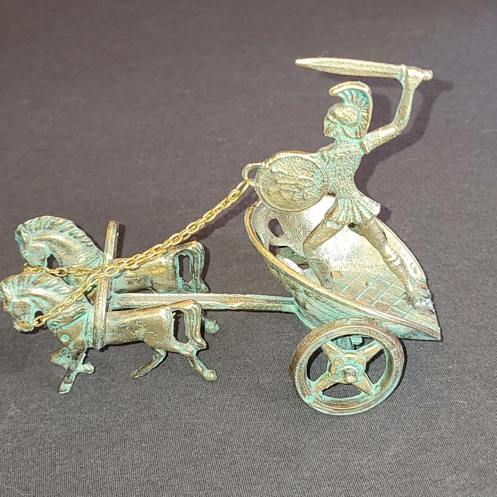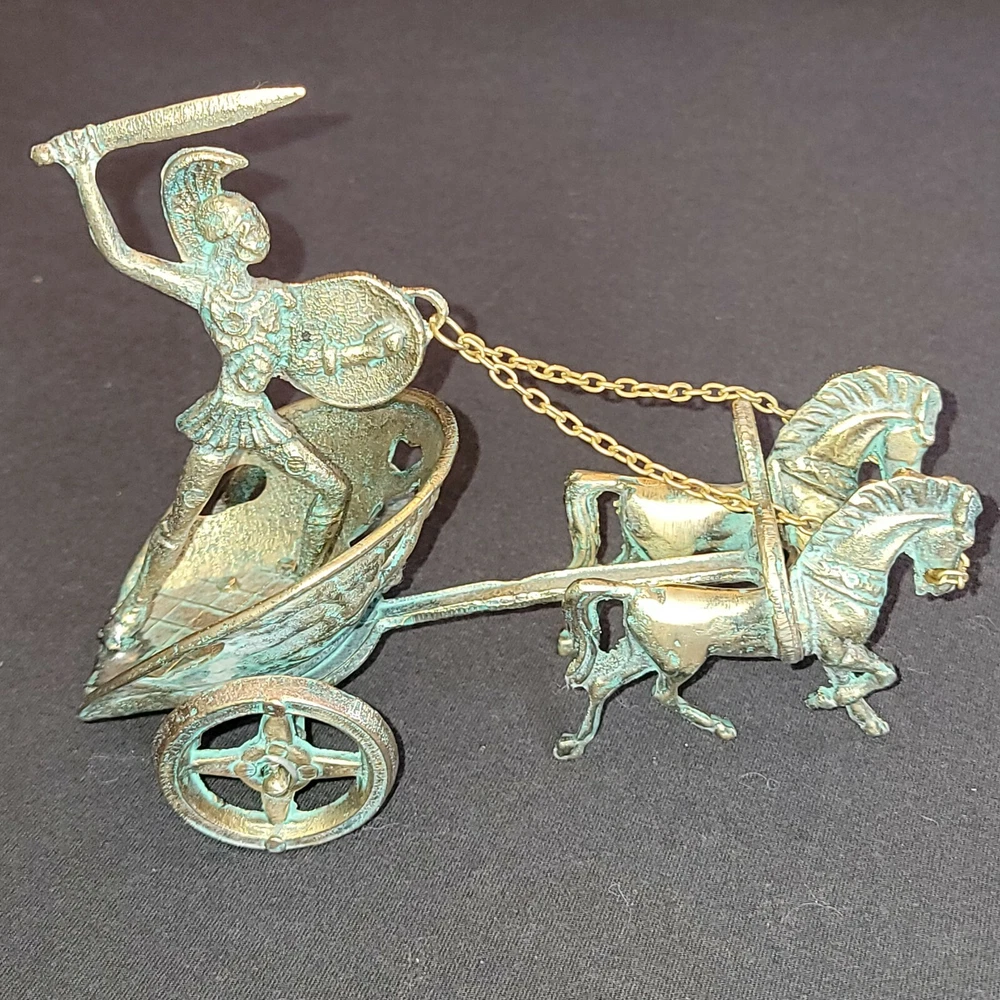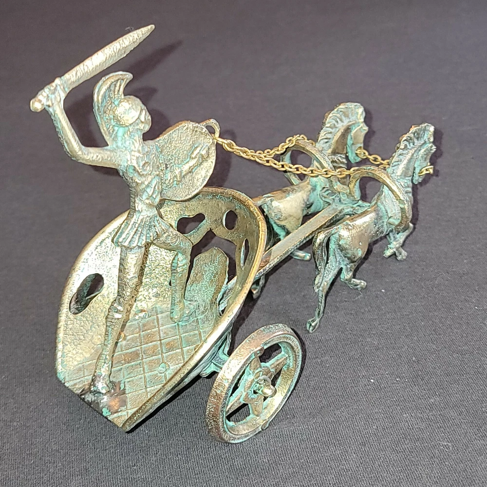 Achilles Mythology Greek Hero Trojan War On Chariot Bronze Statue Sculpture. Very Nice Condition. Shipped with USPS Priority Mail. Handmade with Highest Quality and Aesthetics !!! Bronze Statue of Achilles, Greek Hero of the Trojian War, on a Two-Horse Chariot Medium: Solid Bronze Color: Bronze/ Brass Color with Green oxidation Size : 20cm x 11cm x 13cm / 7.9"x 4.3" x 5.1" Weight: 1 lb .04 oz. (Please note that the size or weight of the statue may differ slightly as they are all Handmade.) In Greek Mythology, Achilles was a Greek hero of the Trojan War and the central character and greatest warrior of Homer's Iliad. Achilles’ most notable feat during the Trojan War was the slaying of the Trojan hero Hector outside the gates of Troy. Although the death of Achilles is not presented in the Iliad, other sources concur that he was killed near the end of the Trojan War, by Paris, who shot him in the heel with an arrow. Later legends state that Achilles was invulnerable in all of his body except for his heel. Alluding to these legends, the term "Achilles heel" has come to mean a point of weakness, especially in someone or something with a strong constitution .