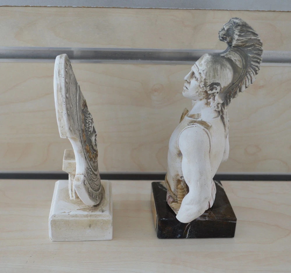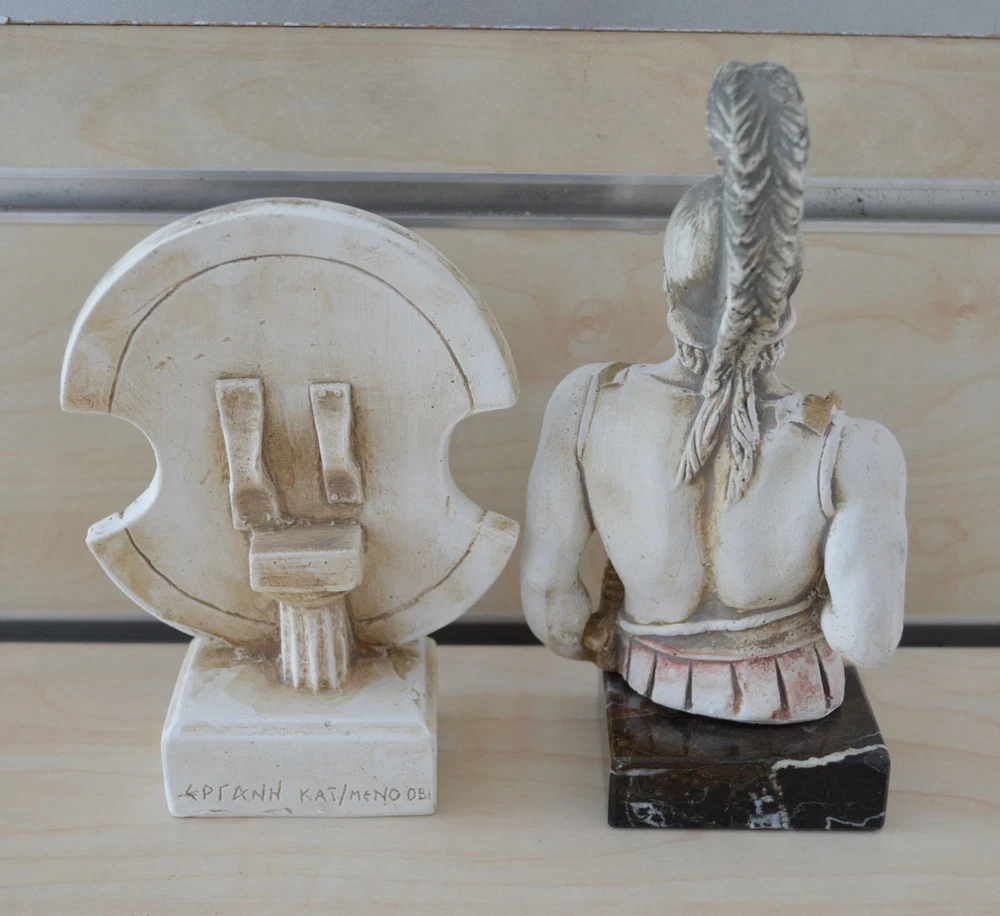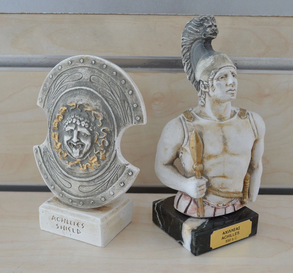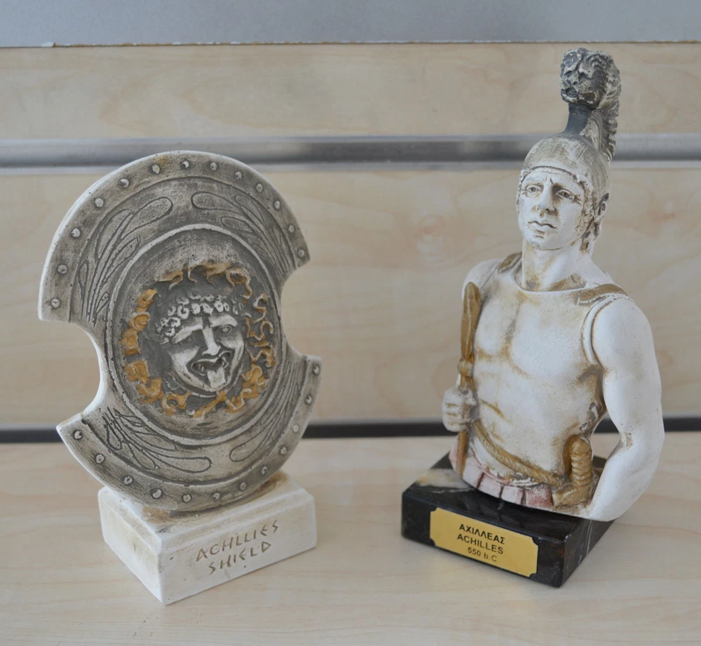 Achilles In Greek mythology, Achilles was a Greek hero of the Trojan War and the central character and greatest warrior of Homer's Iliad. Achilles was said to be a demigod; his mother was the nymph Thetis, and his father, Peleus, was the king of the Myrmidons. Achilles’ most notable feat during the Trojan War was the slaying of the Trojan hero Hector outside the gates of Troy. Although the death of Achilles is not presented in the Iliad, other sources concur that he was killed near the end of the Trojan War by Paris, who shot him in the heel with an arrow. Later legends (beginning with a poem by Statius in the 1st century AD) state that Achilles was invulnerable in all of his body except for his heel. Because of his death from a small wound in the heel, the term Achilles' heel has come to mean a person's point of weakness. (B125-1) Details: Achilles Condition: New, made in Greece. Approximately Height: 17.5 cm - 7 inches Width: 9 cm - 3.5 inches Weight: 425 g Material: Casting stone Shield's Details: Condition: New, made in Greece. Approximately Height: 14 cm - 5.5 inches Width: 9.5cm - 3.7 inches Weight: 200 g Material: Casting stone