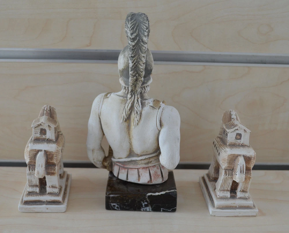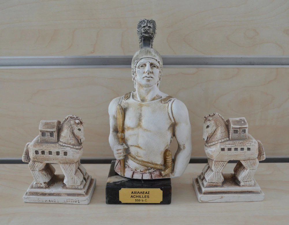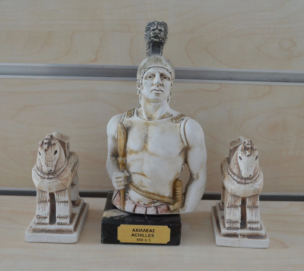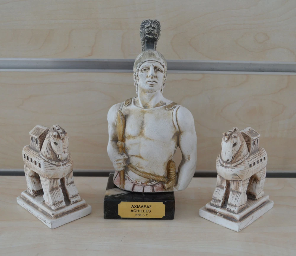 Achilles In Greek mythology, Achilles was a Greek hero of the Trojan War and the central character and greatest warrior of Homer's Iliad. Achilles was said to be a demigod; his mother was the nymph Thetis, and his father, Peleus, was the king of the Myrmidons. (B125-1) Details: Achilles Condition: New, made in Greece. Approximately Height: 17.5 cm - 7 inches Width: 9 cm - 3.5 inches Weight: 425 g Material: Casting stone Details Trojan Horse x2 Condition: New, made in Greece. Approximately Height: 8.5 cm - 3.3 inches Width: 6 cm - 2.3 inches Weight: 140 g Material: Casting stone