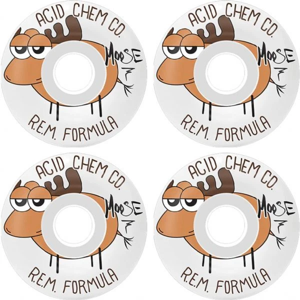 Acid Chemical Wheels REM Moose SR Skateboard Wheels These brand new Acid Chemical Wheels wheels are built to last! Coming in at 55mm in diameter and 99a in hardness, these bad boys are ready for action and packed with steez. Acid Chemical Wheels REM Moose SR Skateboard Wheels are sold in (1) set of four (4) wheels. You know, because that's how many wheels you need on a skateboard. Speaking of skateboards, did you know that Warehouse Skateboards sells those too? We're not all wheels, and there's plenty of wood to go around. Note: Bearings not included. Features: One (1) set of 55mm Acid Chemical Wheels REM Moose SR Skateboard Wheels; includes four (4) wheels Diameter: 55mm Durometer: 99a Color: White