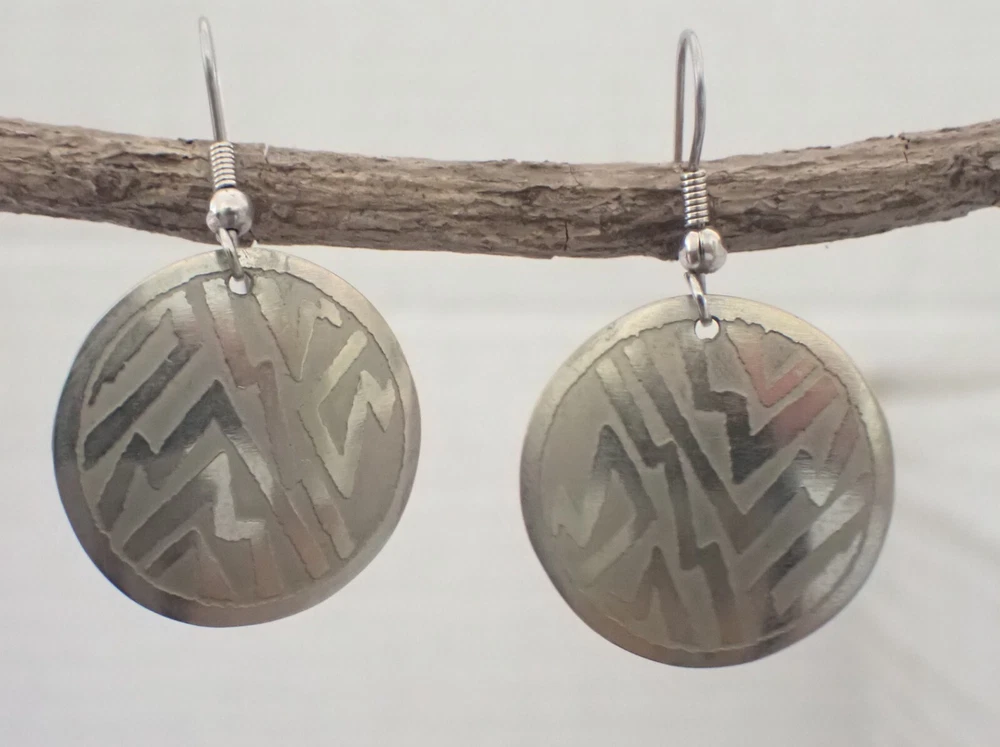 Acid etched brass abstract style dangle earrings. These earrings were made by my late friend Robert Irving in the early 2000's. Although handmade acid etched designs are nice you don't see much as they are so labor intensive. I myself have done it so I know. Any questions please feel free to ask. Features: * Hypoallergenic stainless steel French hooks *Measures 1" in diameter (25 mm) * Lightweight 5 grams *Please note that the picture of them hanging because of reflection appears is more silver than they actually are. They are brass and the picture on the card is closer to the true color but appears slightly redder on the card. *Website address on the card is no longer in operation