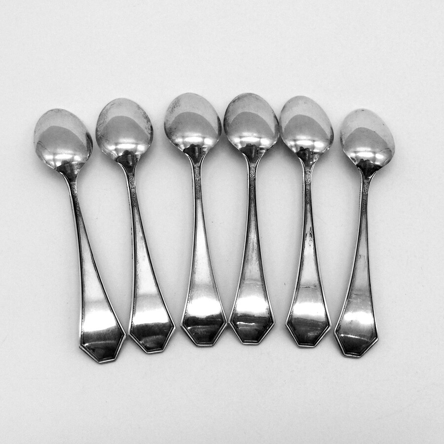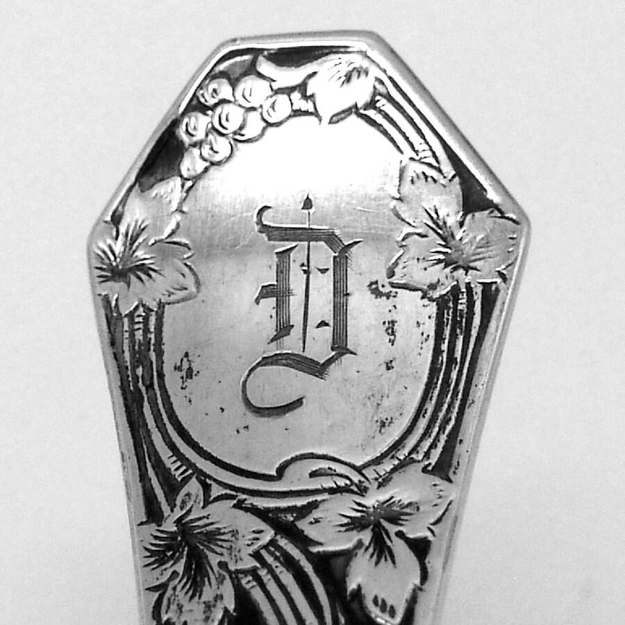 Acid Etched Grape 6 Demitasse Spoons Set Sterling Silver Mono D The Sterling Silver Mfg. Co. sterling silver set of 6 demitasse or coffee spoons, decorated with acid etched grapevine patterns on the front of the handle, and monogrammed "D" in a period script. Providence, RI c. 1910-1930. These wonderful spoons are 3 7/8" long, weighing a total 44.5 grams or 1.43 ozs Troy. The excellent original condition and clear, crisp detail, with no removals, repairs or alterations, make this an especially attractive offering. [FA1851] Shipping/Handling/Insurance Policy All items are carefully packed and insured, with no handling or packing fees, ever. Please do not attempt to return an item due to shipping damage. Should it occur in spite of our careful packaging, this must be handled through the shipping agent with an insurance claim. We will be happy to assist in this. Always be sure to retain all original packaging if a claim is to be made as the shipping agent may request to examine it. That being said, in over 10 years of internet shipping, we have had only one damage claim. Shipping is usually done within 24 hours of the receipt of a cleared payment. Shipping may delayed for a few days if we are away from home at an Antique Show. Please feel free to contact us with any inquiries about our items or shipping. We will respond within 24 hours. Any shipping over payments will be quickly refunded. Other Information Sales tax applies for California. A valid resale certificate is required for tax exempt sales shipped to California. International buyers are responsible for all customs fees, duties and VAT.